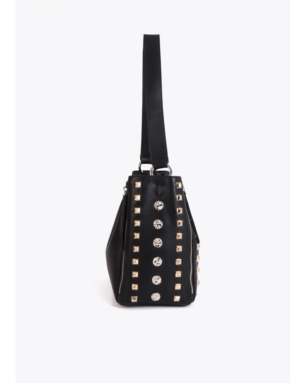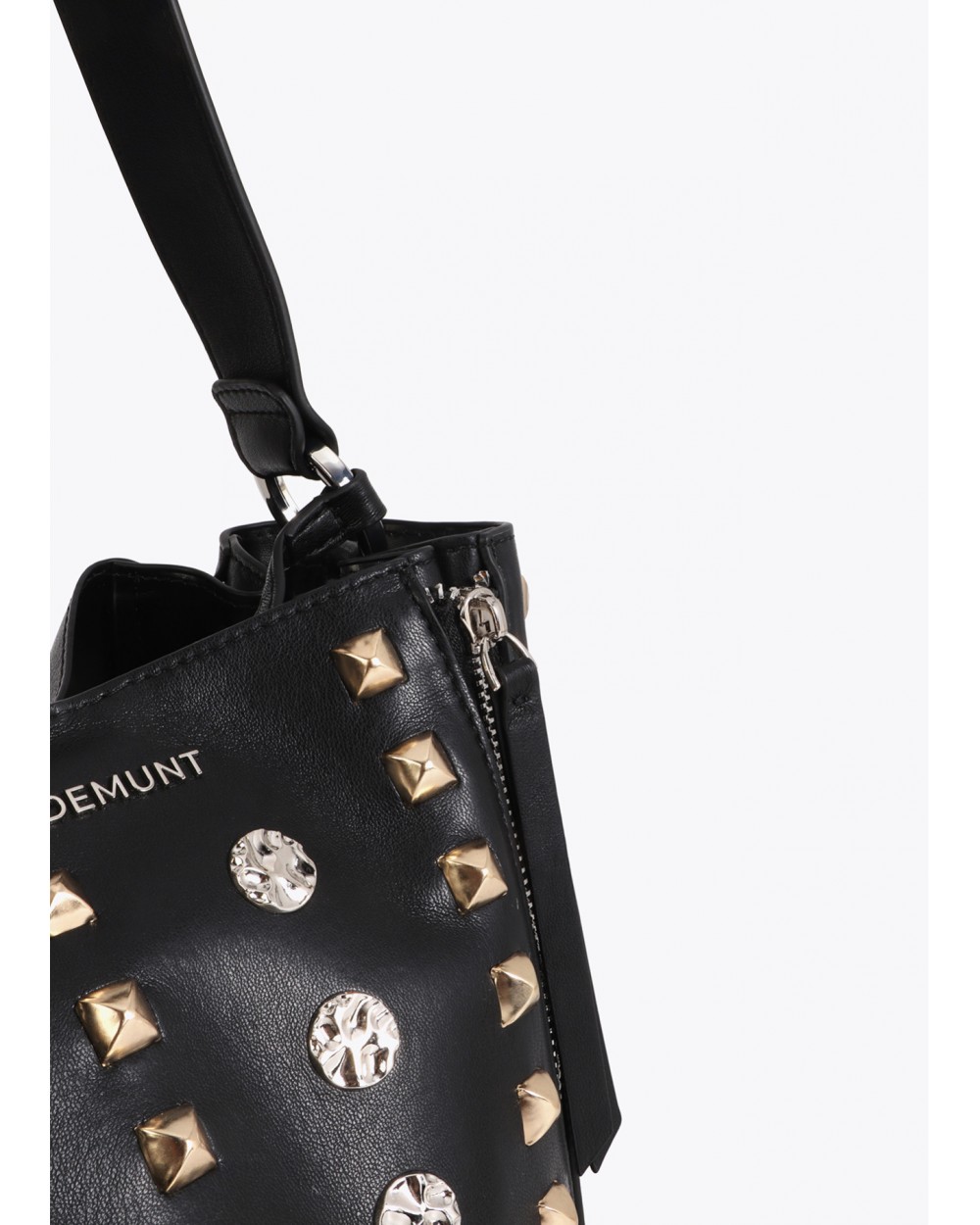 Bolso de hombro en color negro con tachas doradas y plateadas. Fabricado en ecopiel de alta calidad. Cierre con cremallera y correa ajustable para poder cruzar. Incluye cierre de cremallera y correa fija de hombro y otra ajustable para mayor comodidad.