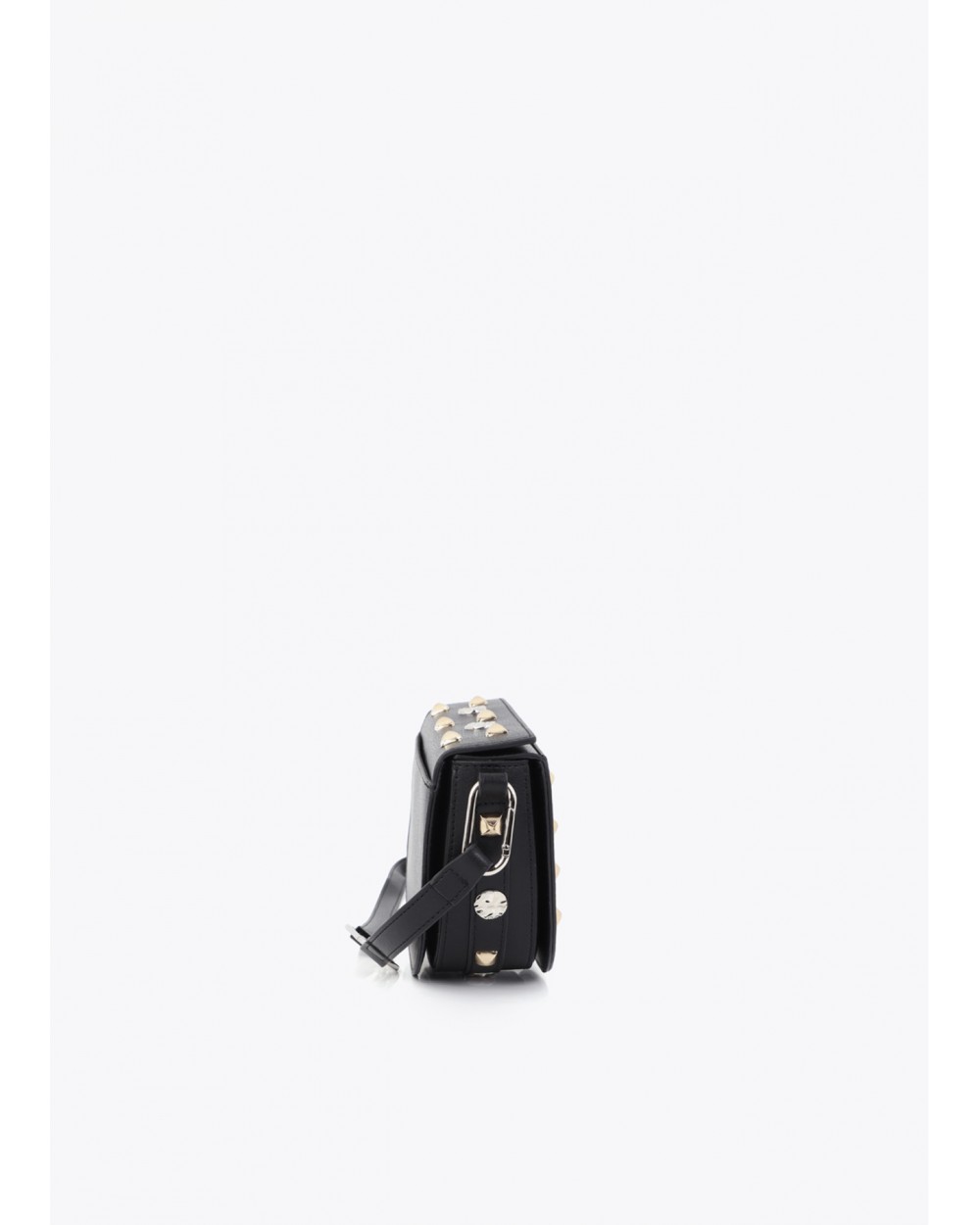 Bolso bandolera con tachuelas doradas y brillantes tipo cristal. Fabricado en ecopiel de alta calidad. Cierre de imàn y correa ajustable.