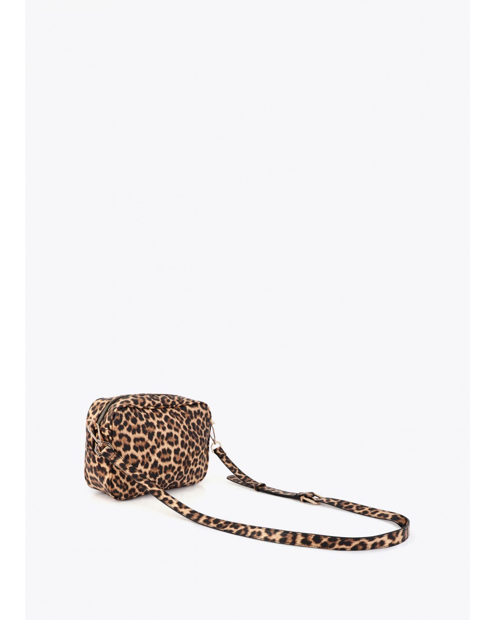 Este bolso bandolera con estampado leopardo es práctico y elegante. Confeccionado en material resistente, presenta un cierre de cremallera y detalles metálicos en dorado. Ideal para llevar lo esencial con estilo.