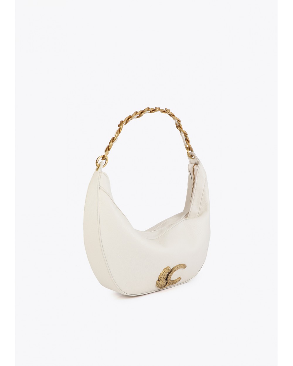Bolso con forma de media luna en ecopiel con logo metàlico LC con forma de leopardo en dorado envejecido. Trae asa en cadena dorada y asa larga ajustable adiccional. Cierre superior con cremallera.