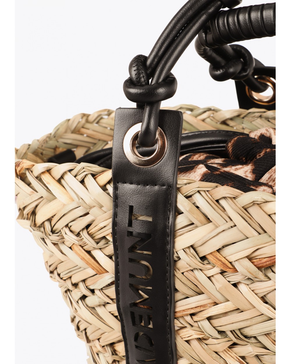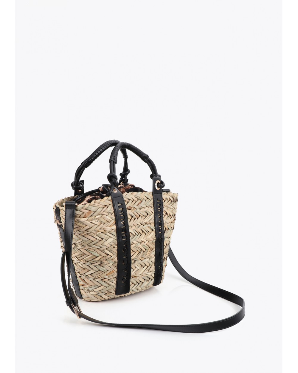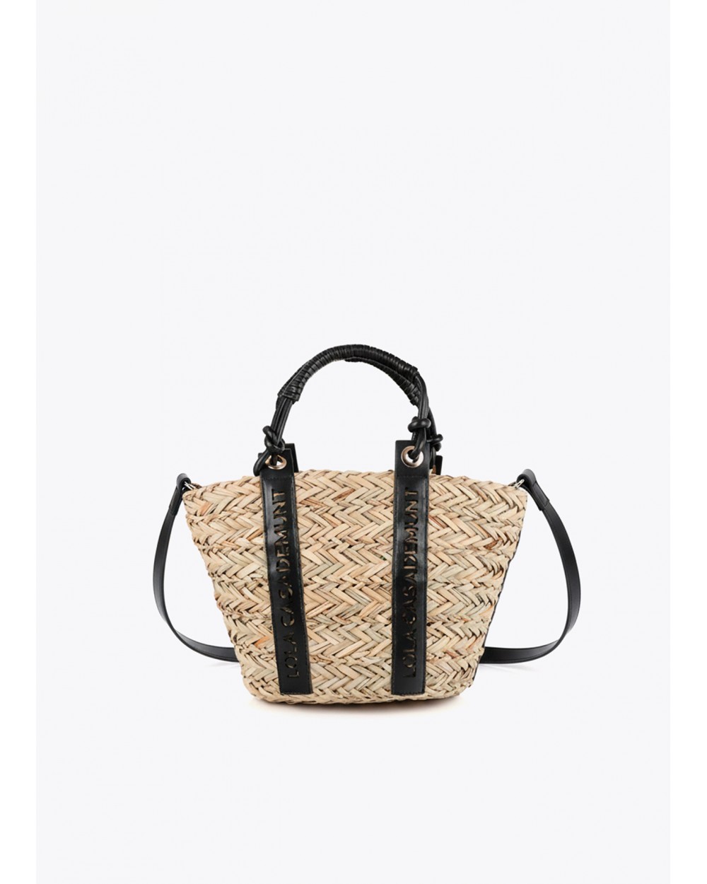 Mini capazo de fibra natural con asas de cuero troqueladas con el logo de Lola Casademunt. Diseño compacto y ligero, perfecto para llevar tus esenciales de verano. Incluye forro interior con cierre seguro.