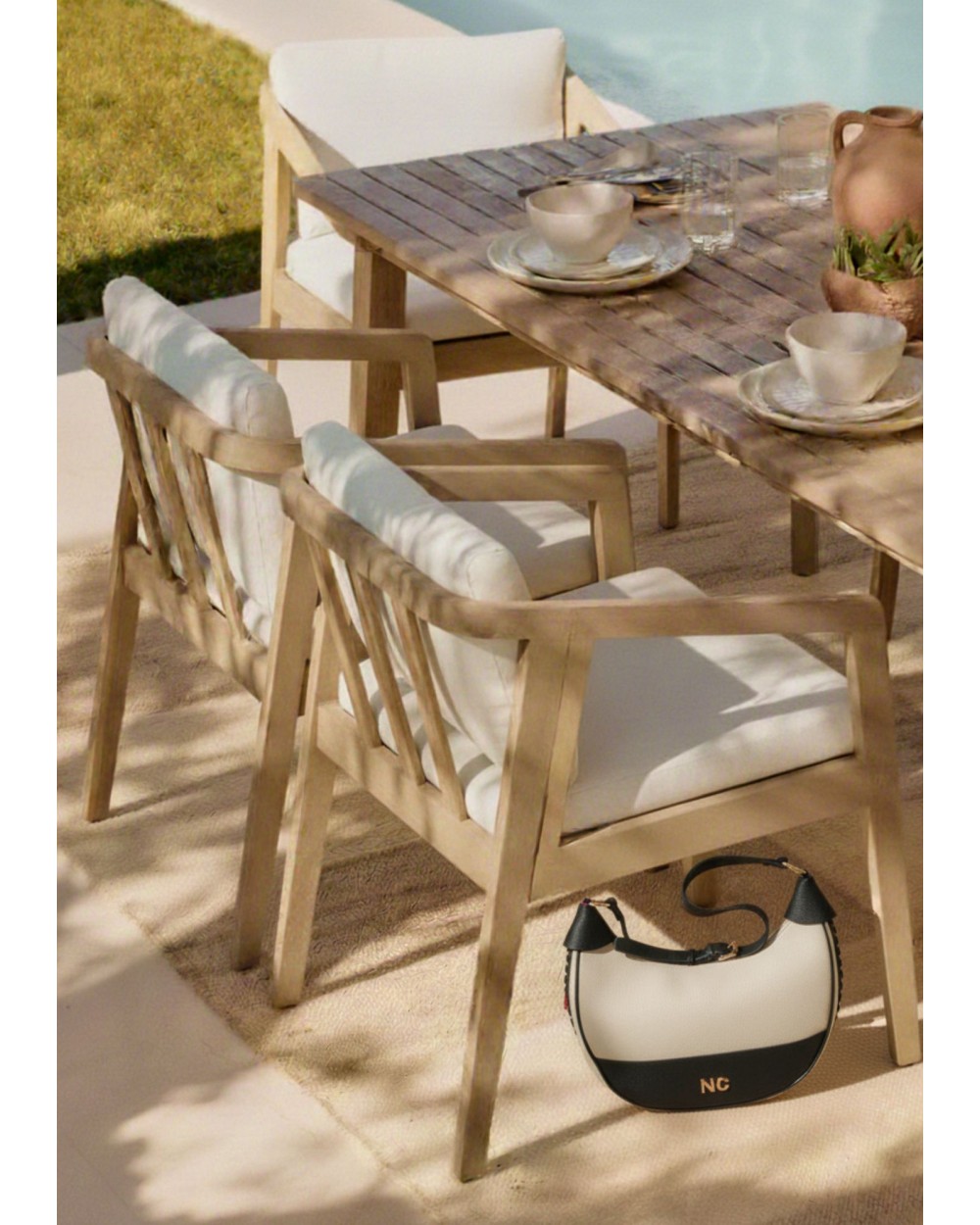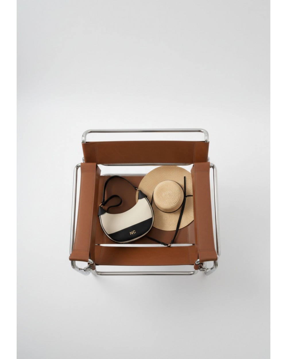 Confeccionado íntegramente en piel vegana de alta calidad, presenta un sofisticado diseño bicolor que combina el tono crema con negro o camel, creando un contraste atemporal y fácil de combinar.