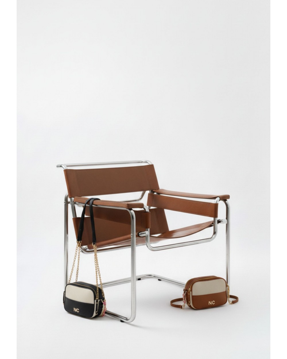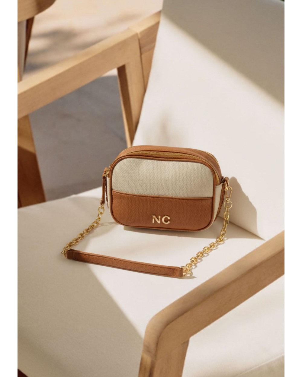 Confeccionada en piel vegana de alta calidad, presenta un elegante diseño bicolor que mezcla el tono crema con negro o camel, creando un bolso fácil de combinar y perfecto para cualquier temporada.