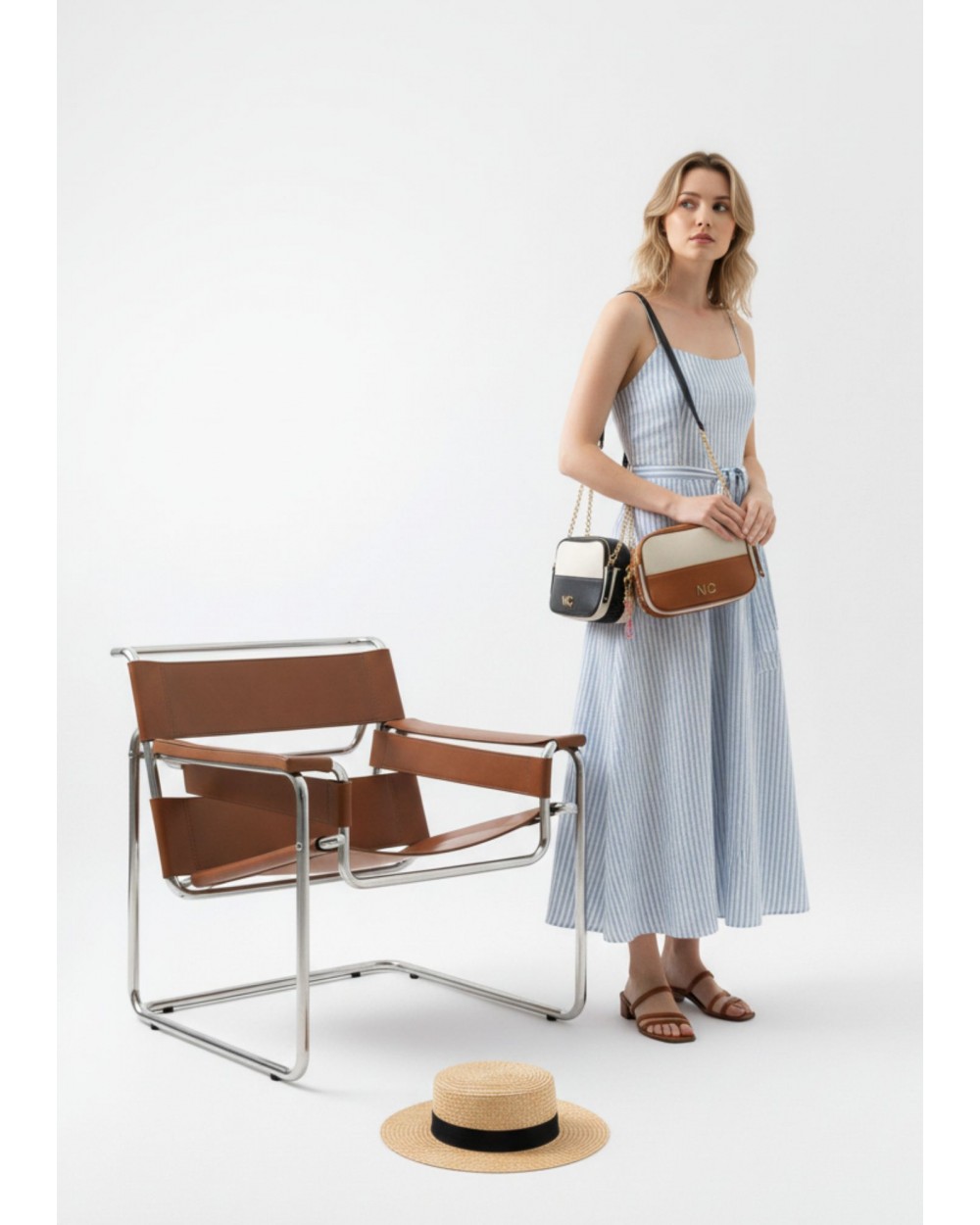 En los laterales incorpora una trenza decorativa realizada con la propia piel vegana, un detalle distintivo de la colección que aporta carácter y personalidad al diseño. Todos los acabados y herrajes se presentan en el color de la combinación elegida, manteniendo una estética limpia y equilibrada.