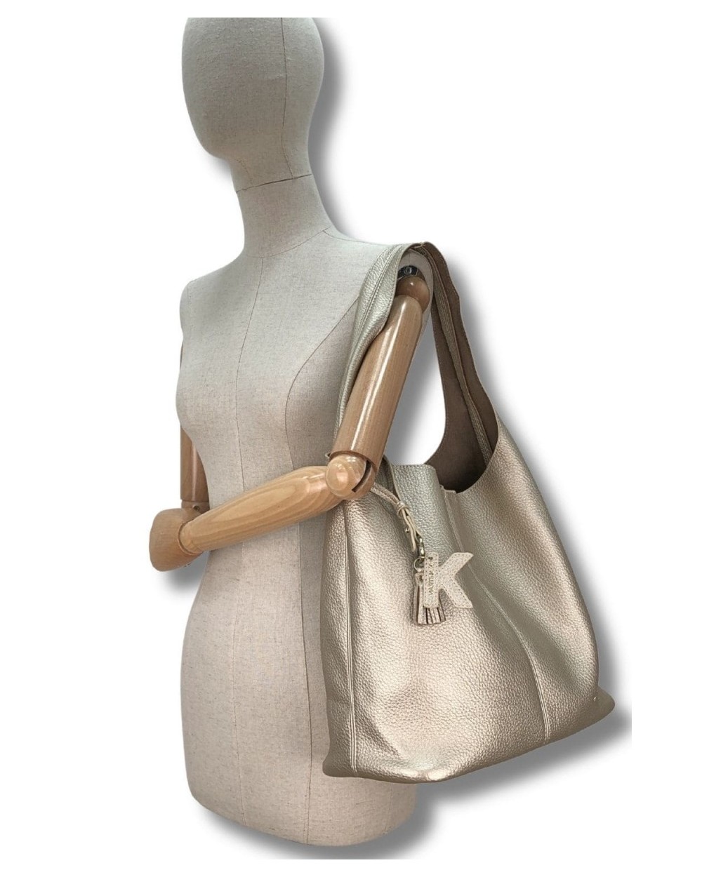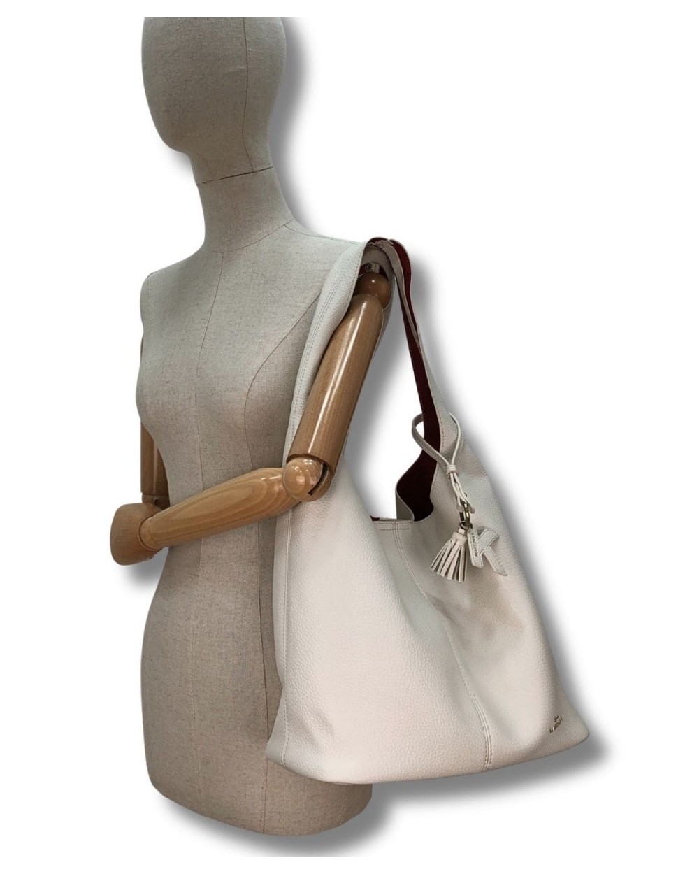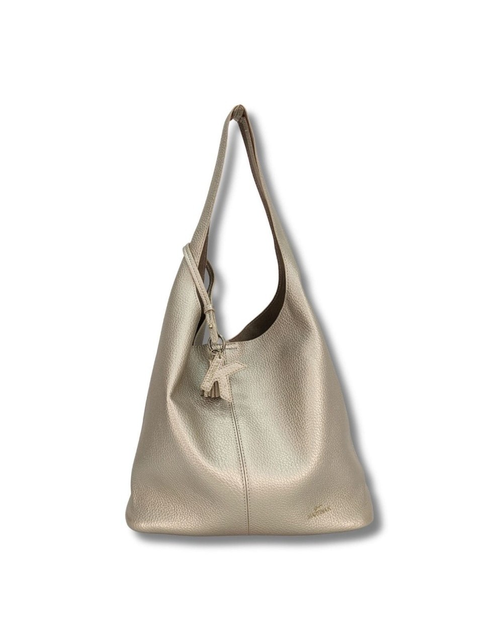 Hobo ligero con detalle de pompón y K colgante con logo. Eco piel vegana. Forro de antelina en contraste. Organizar interior.