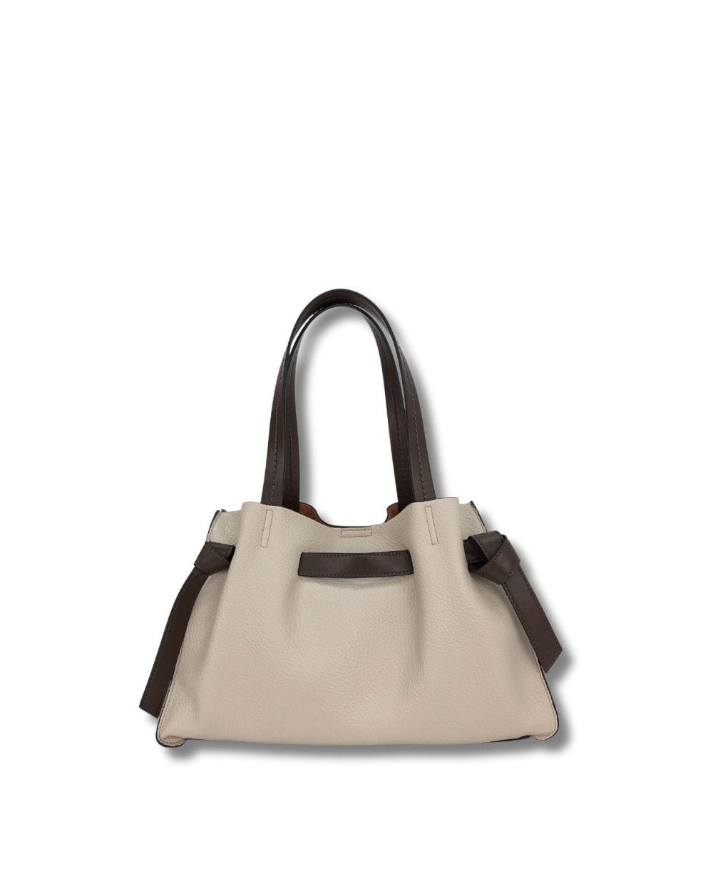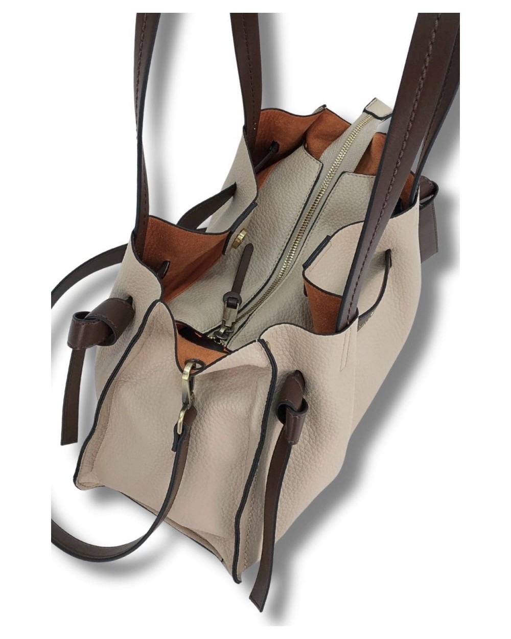 Shopping bicolor con detalle de tira y nudos frontales. Asa de hombro y bandolera ajustable. Gran departamento interior con cremallera y cierre con clip. Tripe departamento. Eco piel vegana. Forro de antelina en contraste. Organizador interior.