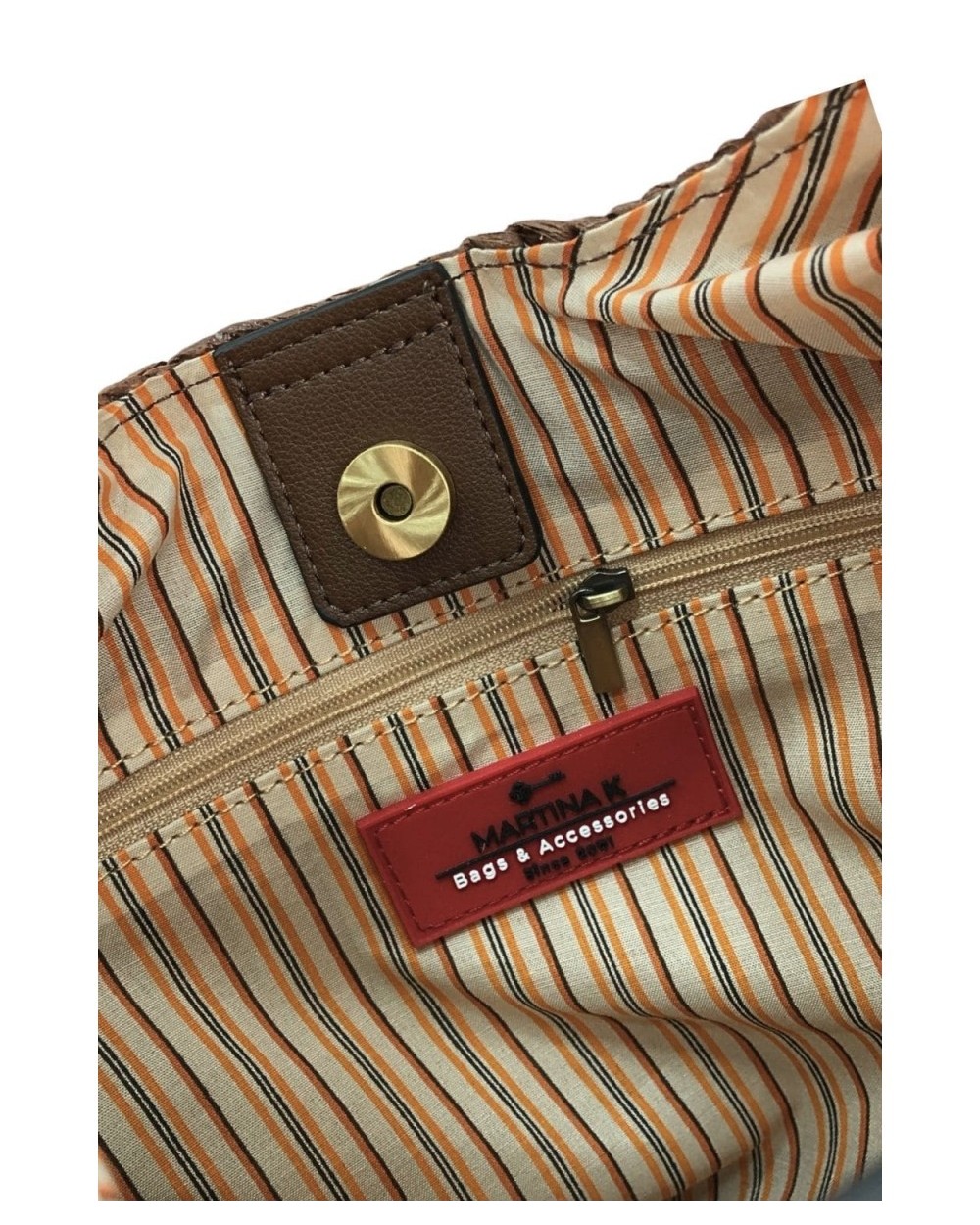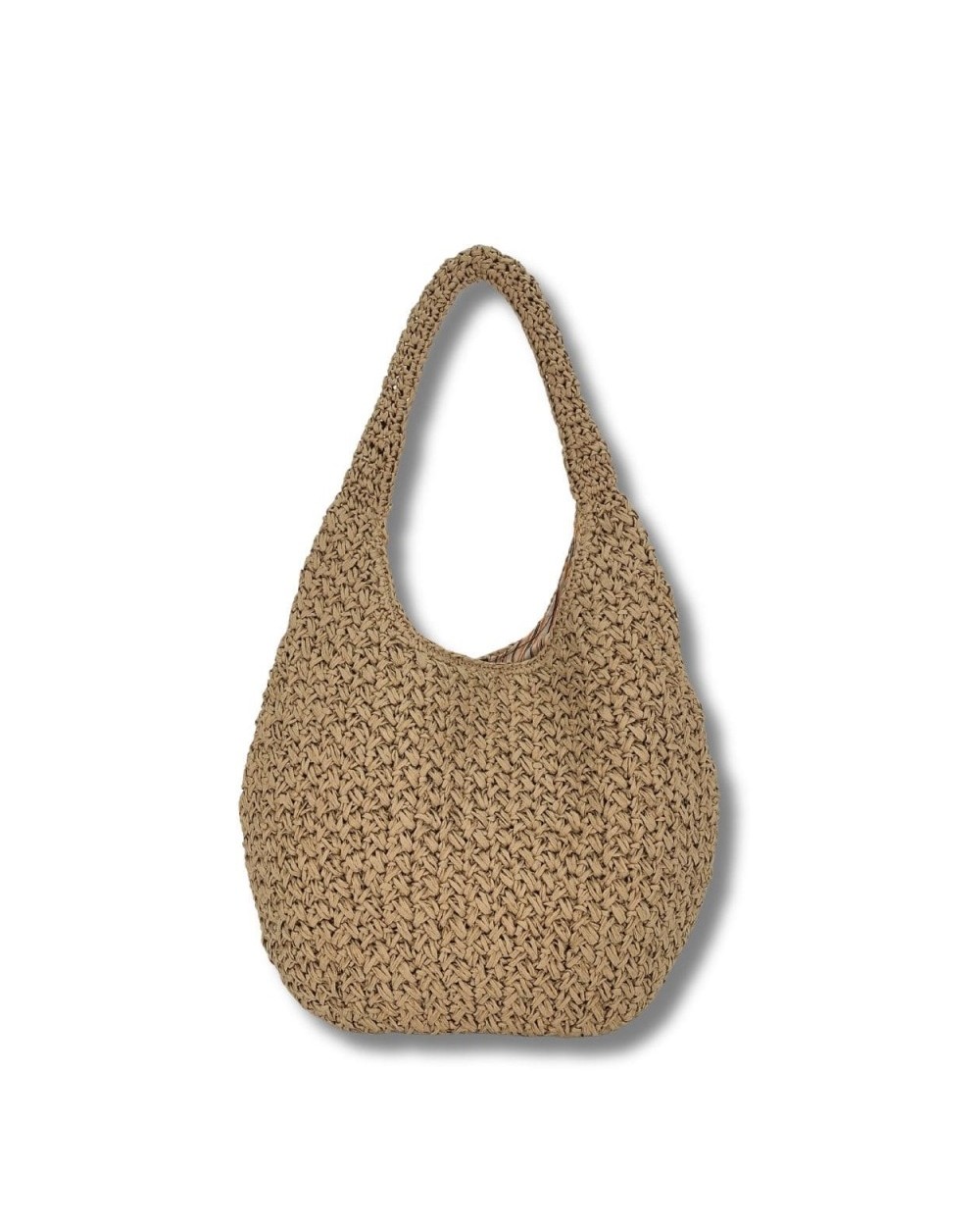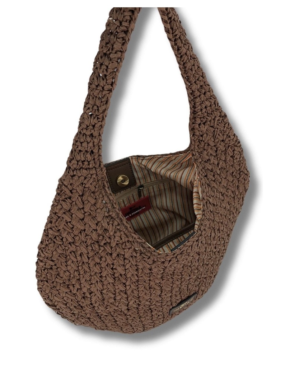 Hobo de paja ovalado y ligero cerrado con clip y forro de rayas. Organizador interior.