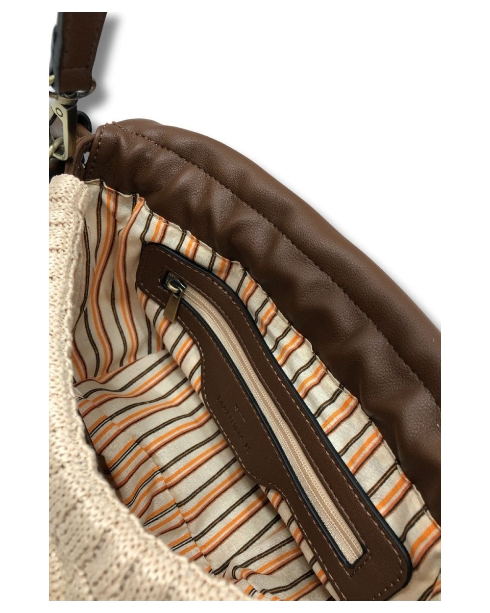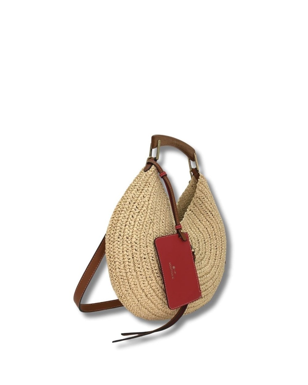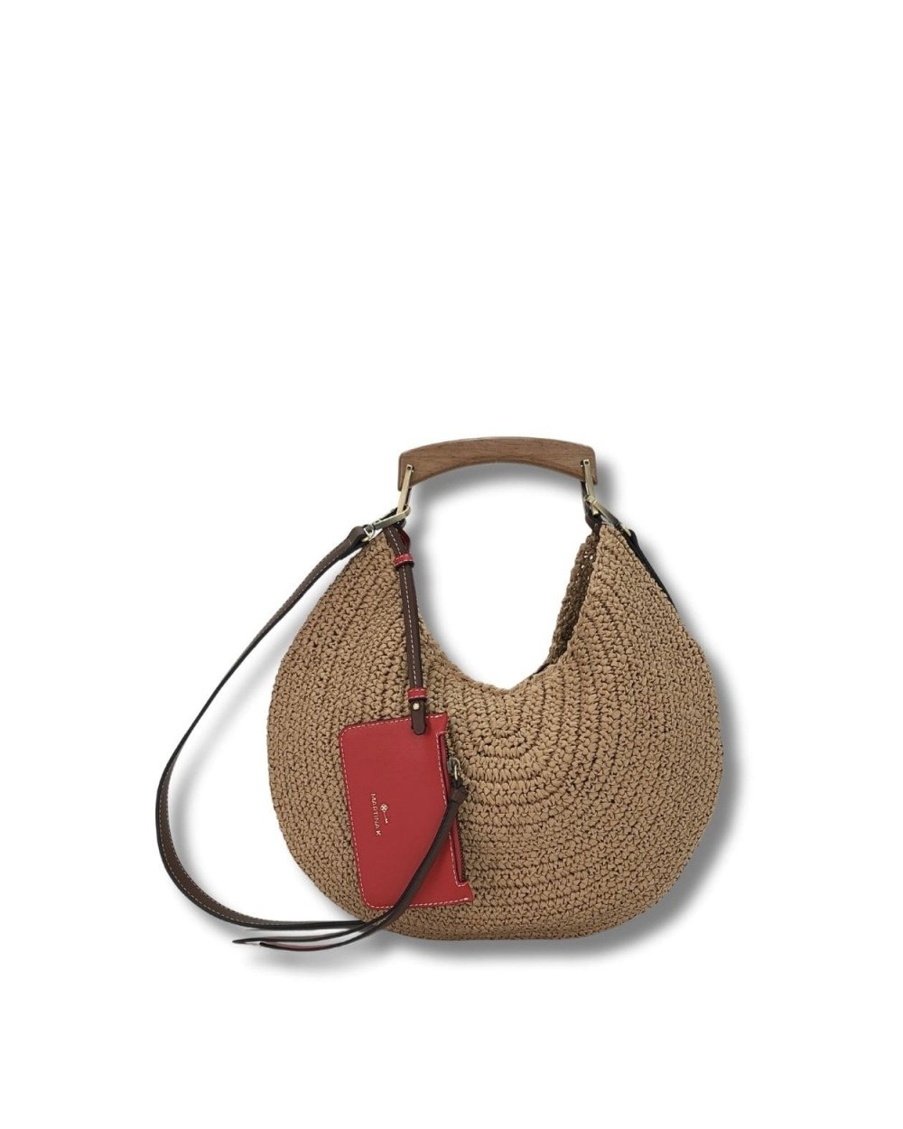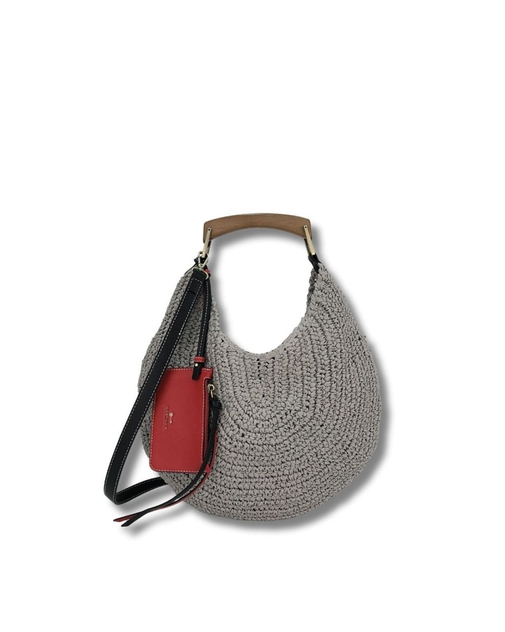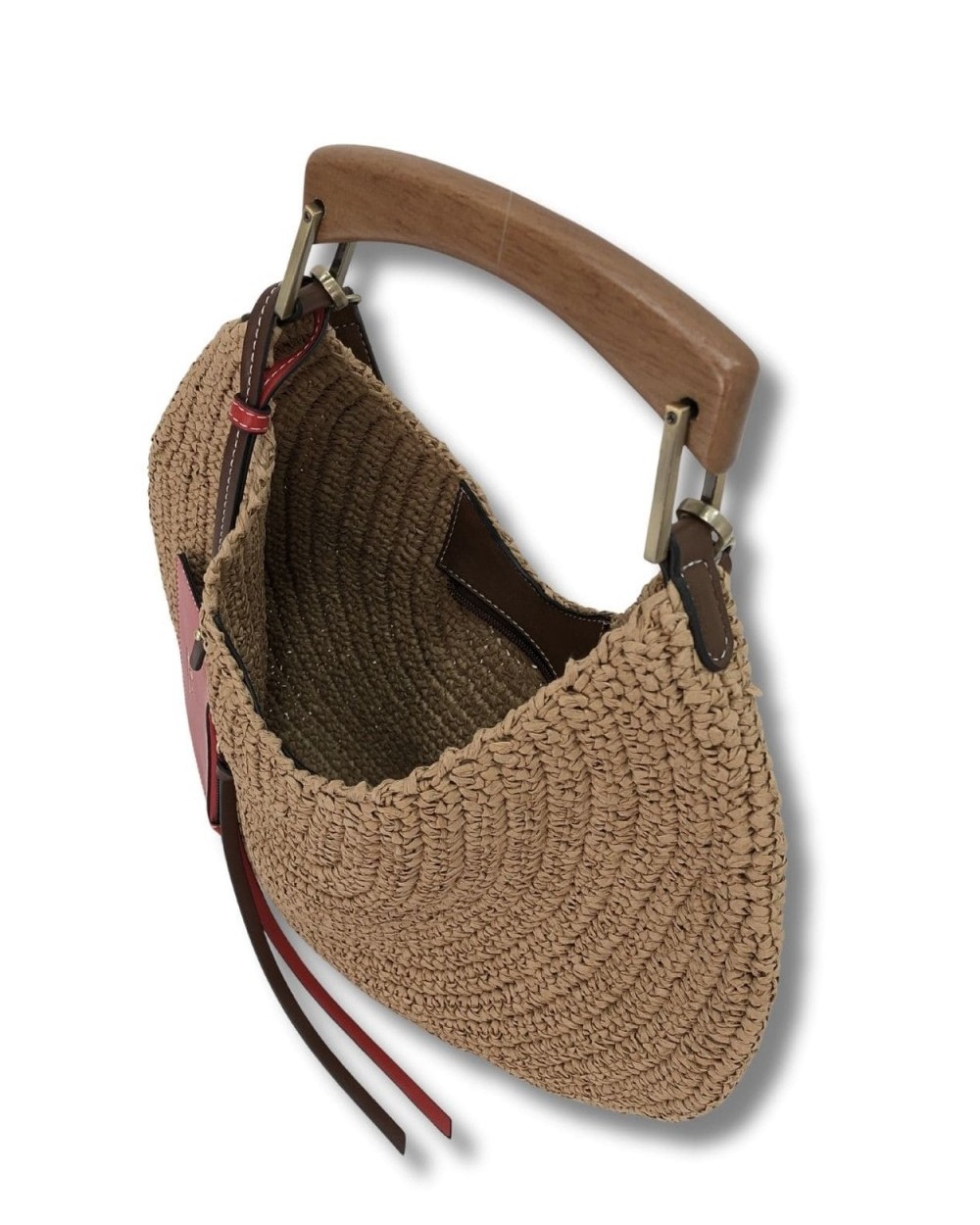Bolso de paja cerrado con cremallera. Detalle de bolsito colgante en contraste. Asa de madera y bandolera ajustable.