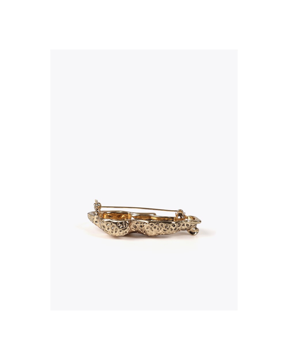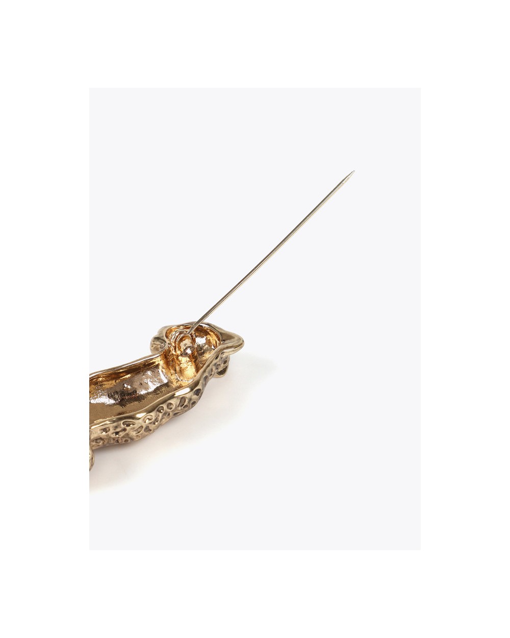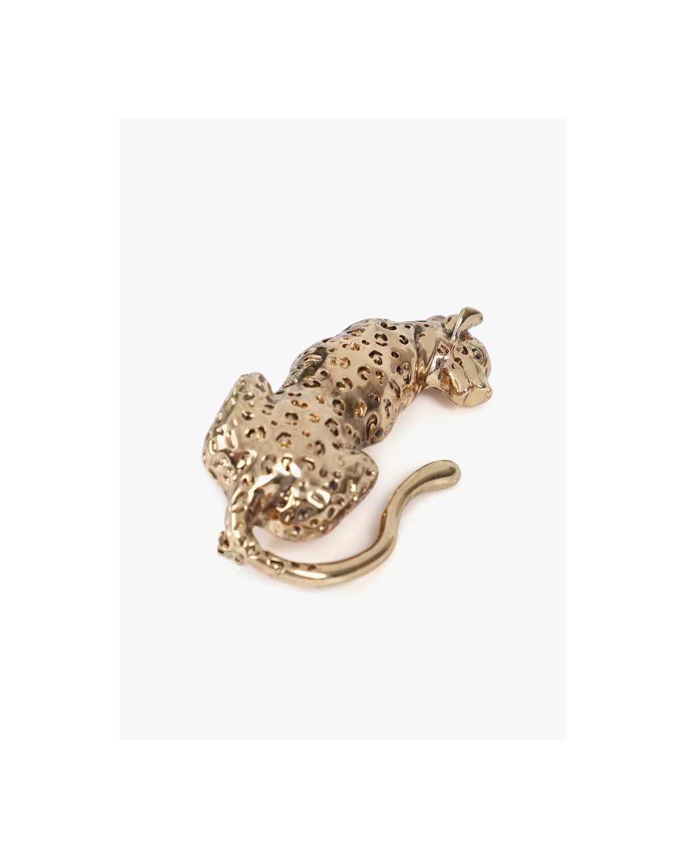 Broche con figura de leopardo, en metal dorado, con acabado en brillo. Con cierre seguro.