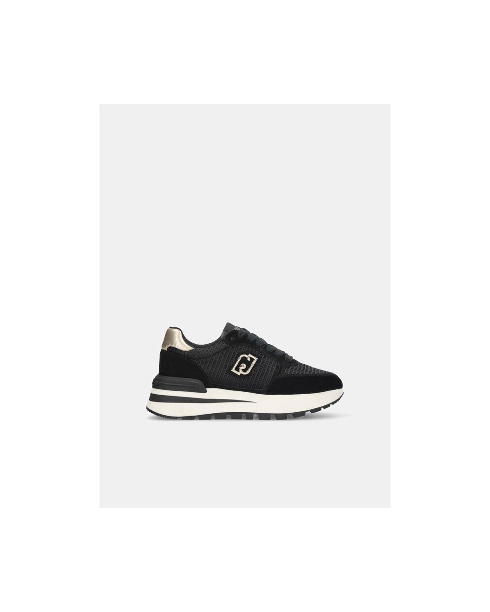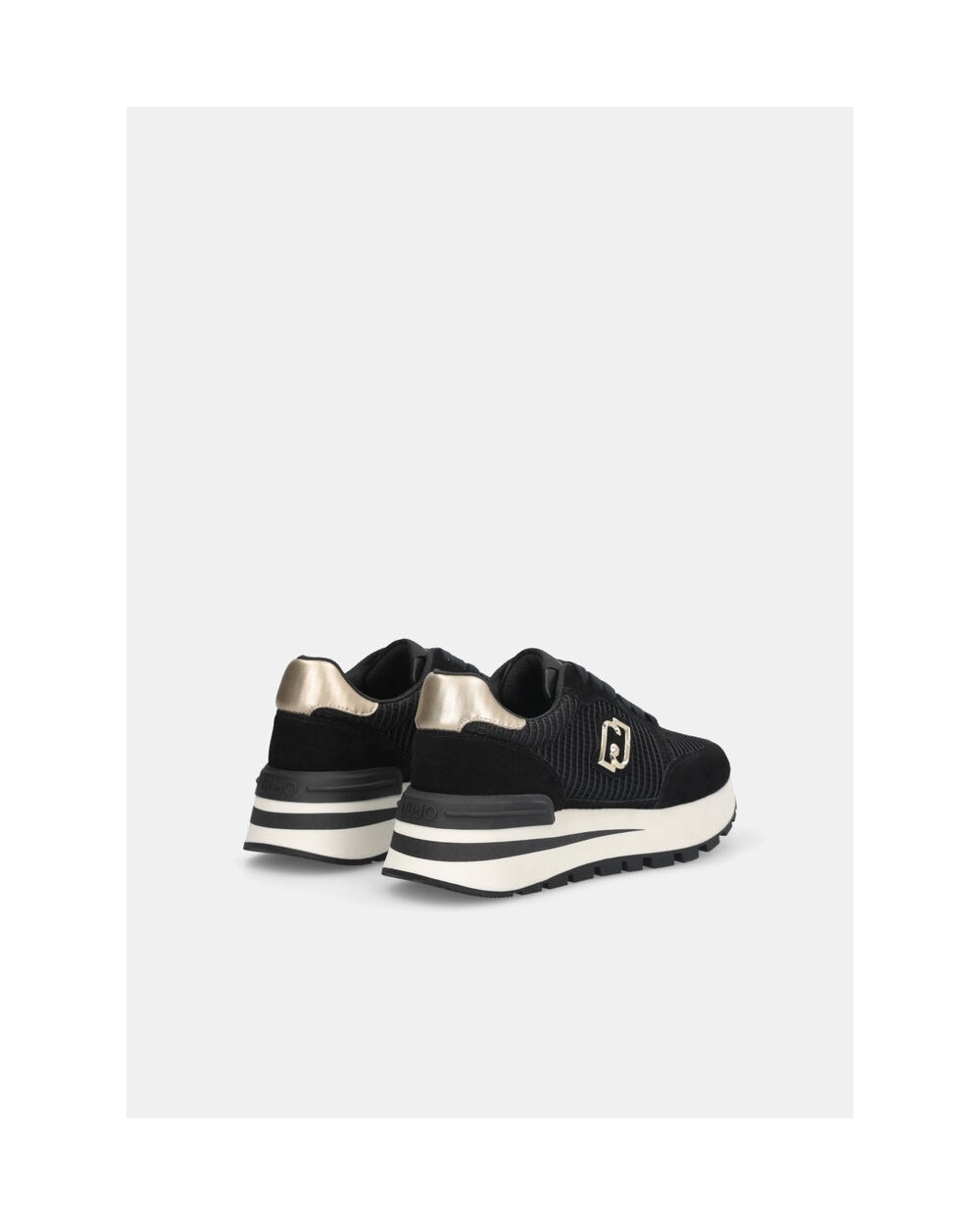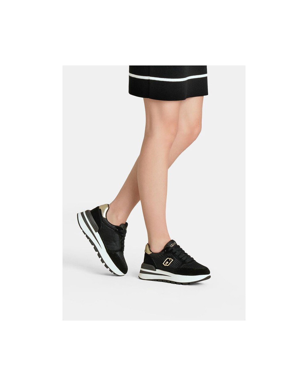 Zapatillas de ante y malla en color negro con detalles dorados de Liujo, monograma metàlico en dorado, cordones planos, suela con plataforma, logotipo en negro en el talòn, suela dentada de 5cm.