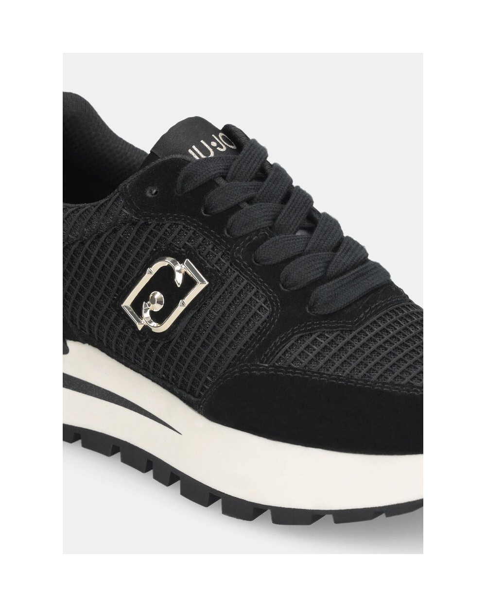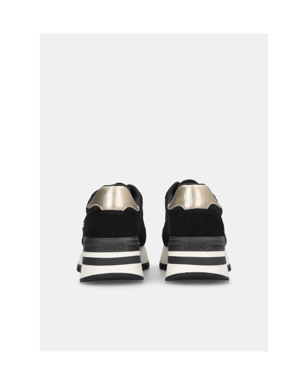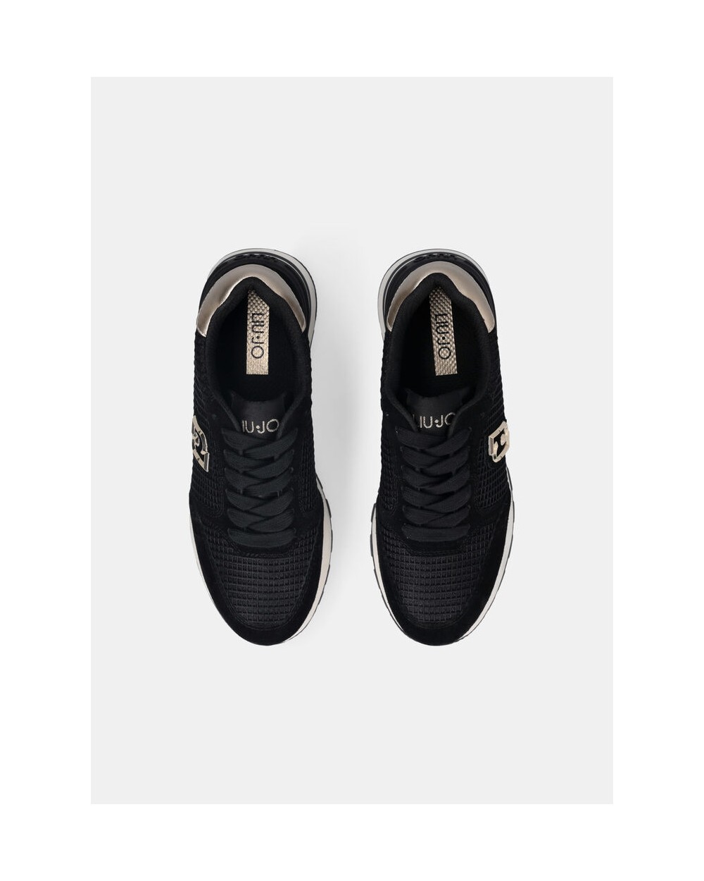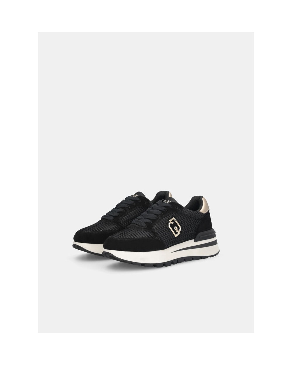 Zapatillas de ante y malla en color negro con detalles dorados de Liujo, monograma metàlico en dorado, cordones planos, suela con plataforma, logotipo en negro en el talòn, suela dentada de 5cm.