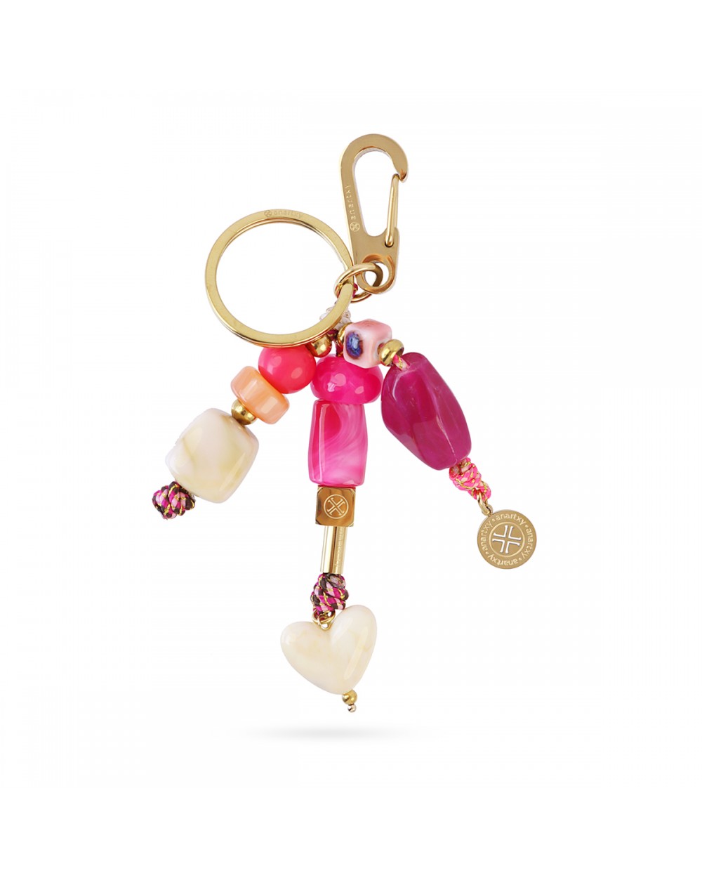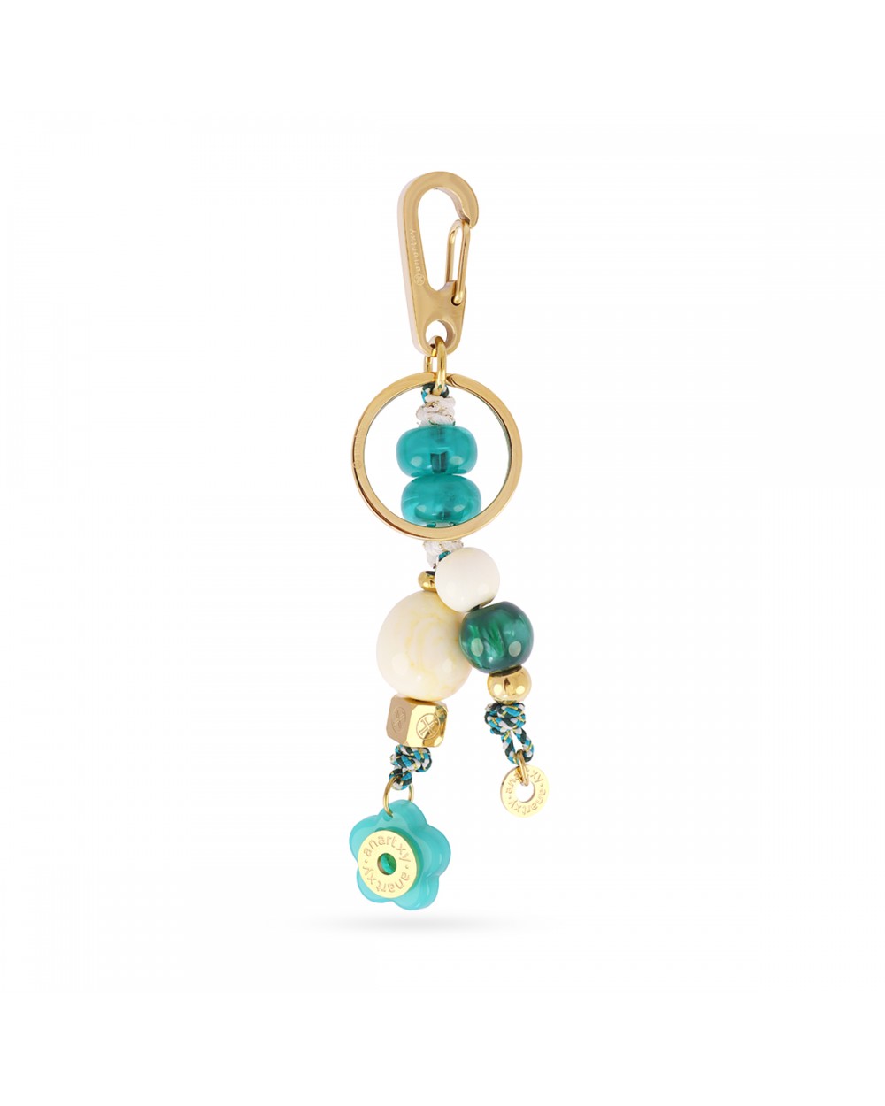 Llavero charm decorativo ideal para bolso, llaves o cualquier accesorio. Combina resina reciclada, perlas y un cordón textil para un diseño original y llamativo, junto a herrajes en acero quirúrgico. Con el distintivo logo Anartxy, es un complemento bonito, práctico y lleno de personalidad.