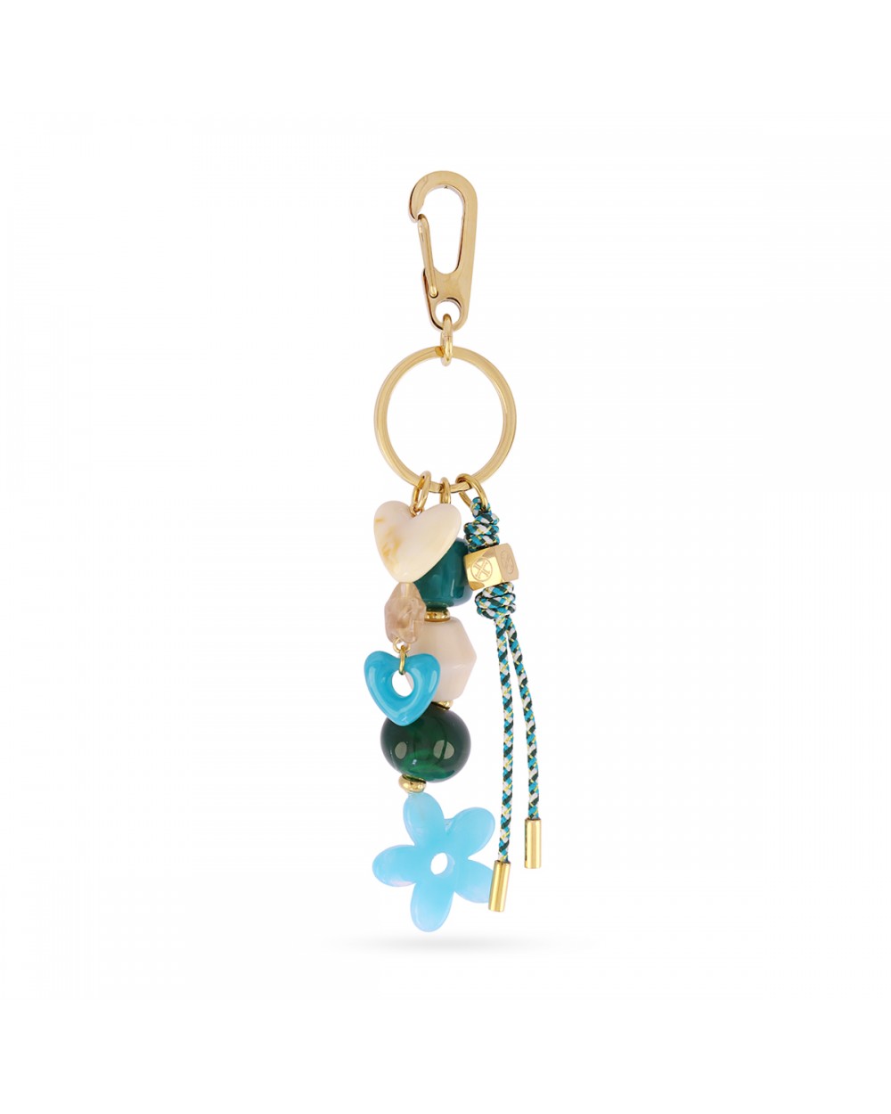 Llavero charm decorativo ideal para bolso, llaves o cualquier accesorio. Combina resina reciclada, perlas y un cordón textil para un diseño original y llamativo, junto a herrajes en acero quirúrgico. Con el distintivo logo Anartxy, es un complemento bonito, práctico y lleno de personalidad.