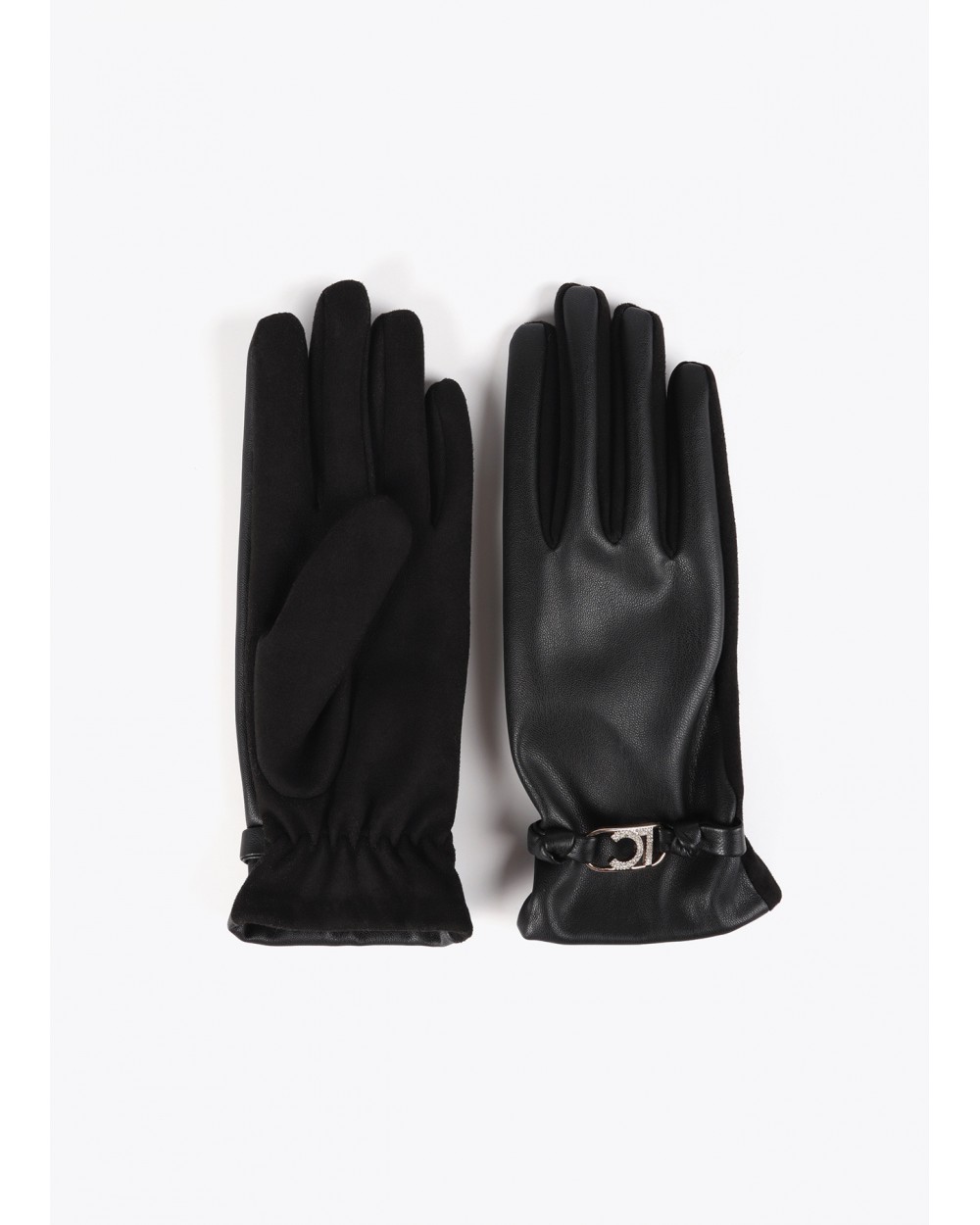 Guantes en efecto piel en color negro con pulsera decorativa y logo ovalado. Confección suave y confortable para uso diario.