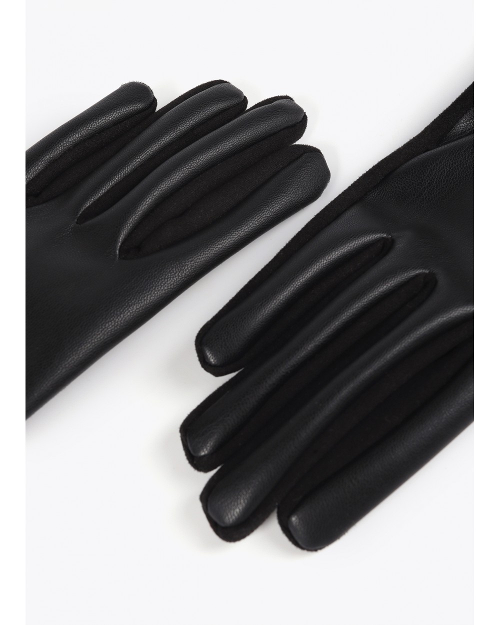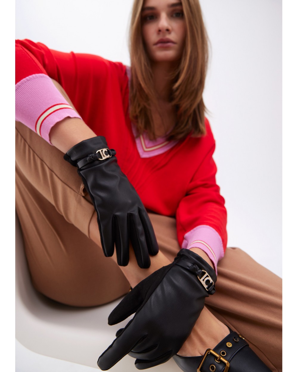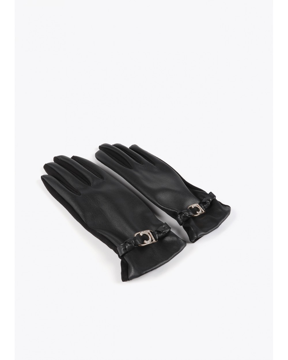 Guantes de efecto piel en color negro con pulsera decorativa y logo ovalado. Confección suave y confortable para uso diario. Perfectos para completar cualquier look.