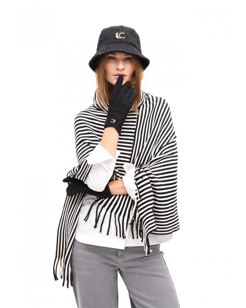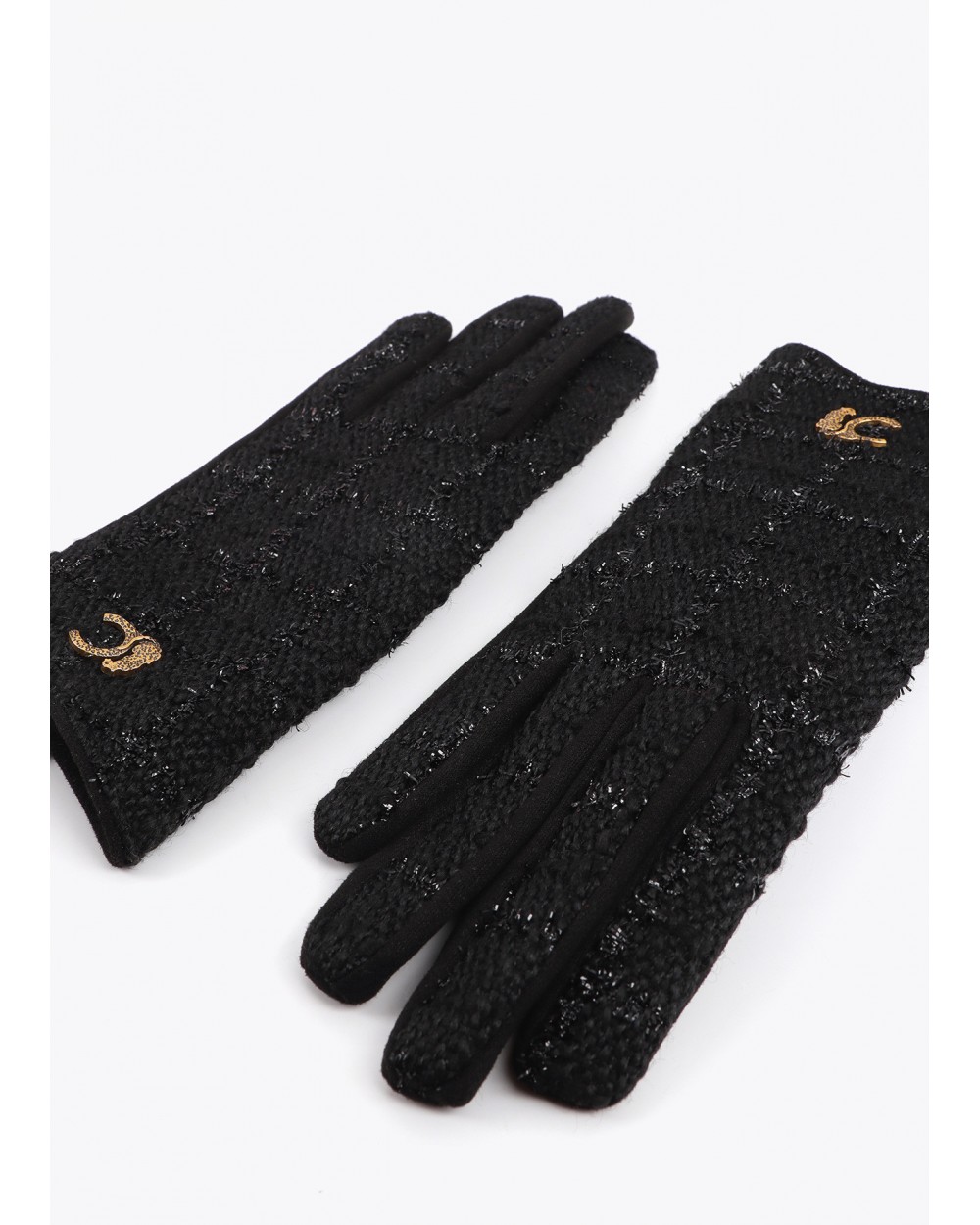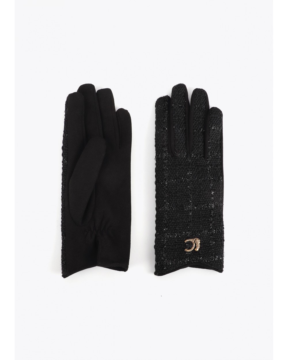 Guantes Combinados en tejido tweed negro con detalles dorados. Diseño ajustado para un ajuste cómodo. Ideal para un look sofisticado y moderno.