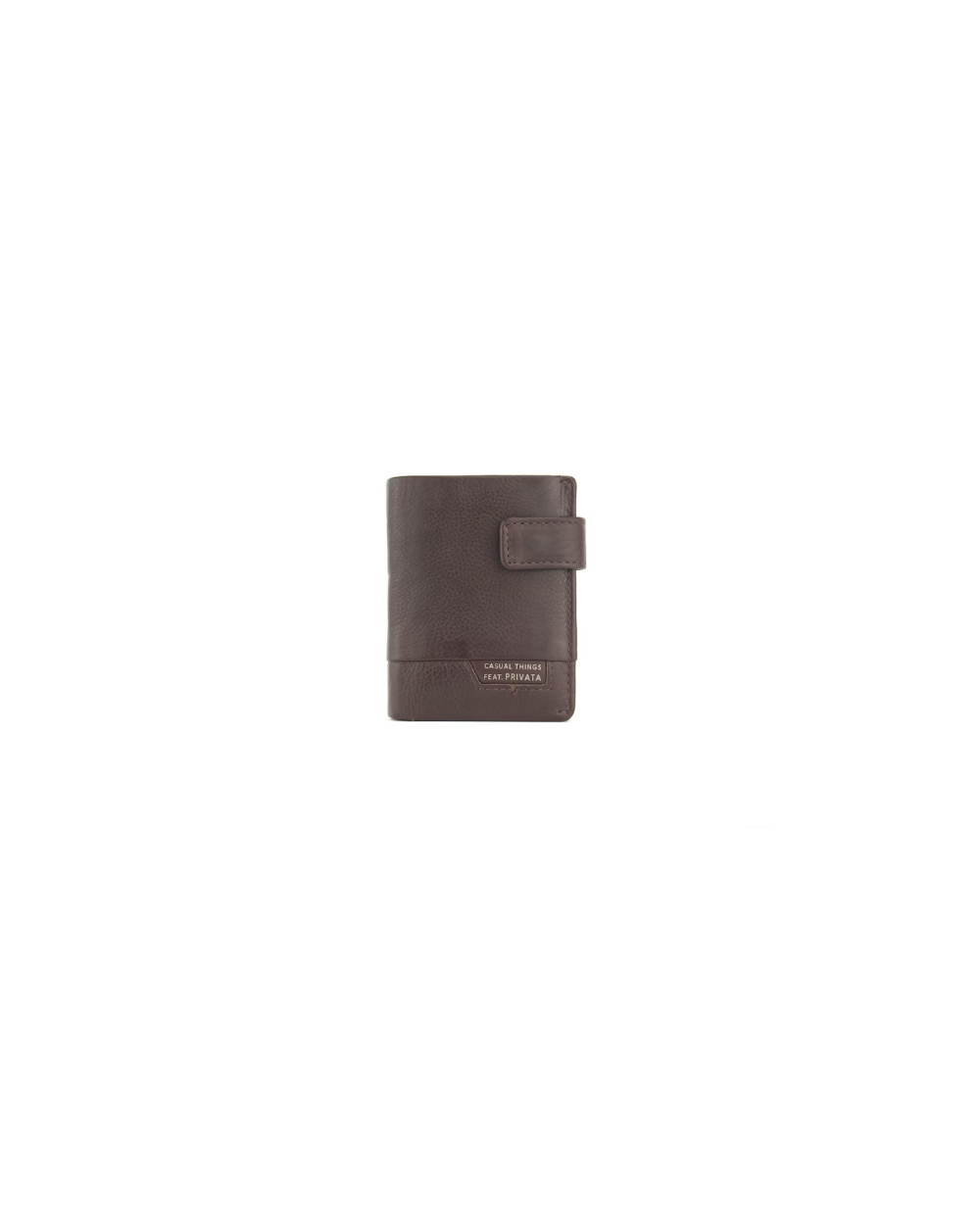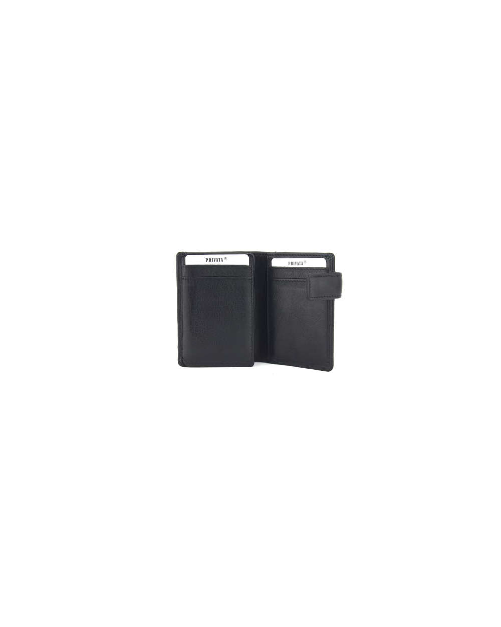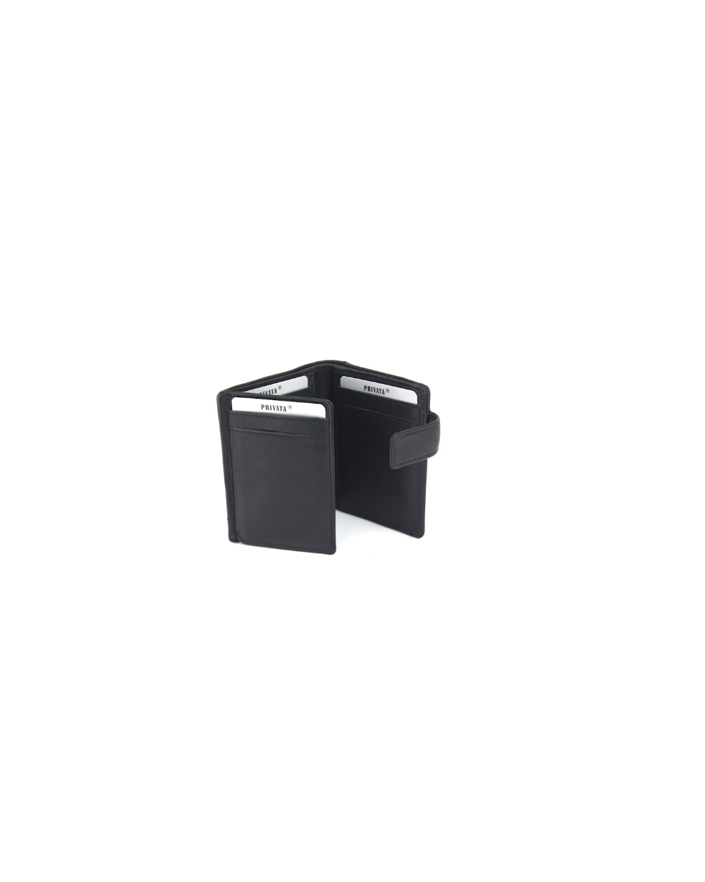 Billetero vertical fabricado en piel vacuno. Cierre con solapita y click. En el interior dispone de un departamento para billetes y 9 apartados para tarjetas. Logo de Privata serigrafiado. Viene presentado en una caja personalizada en cartón reciclado. Colección Seul