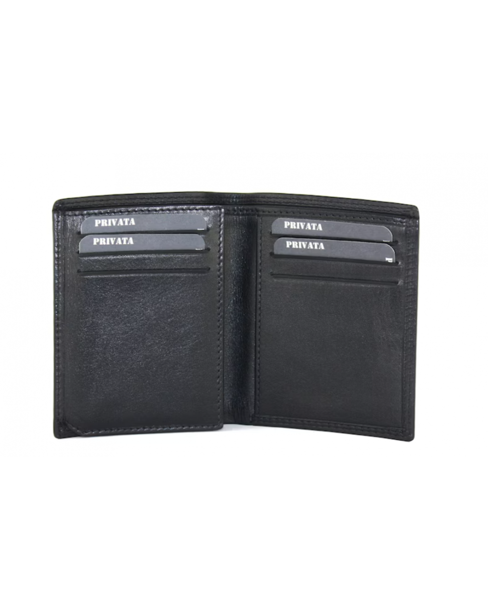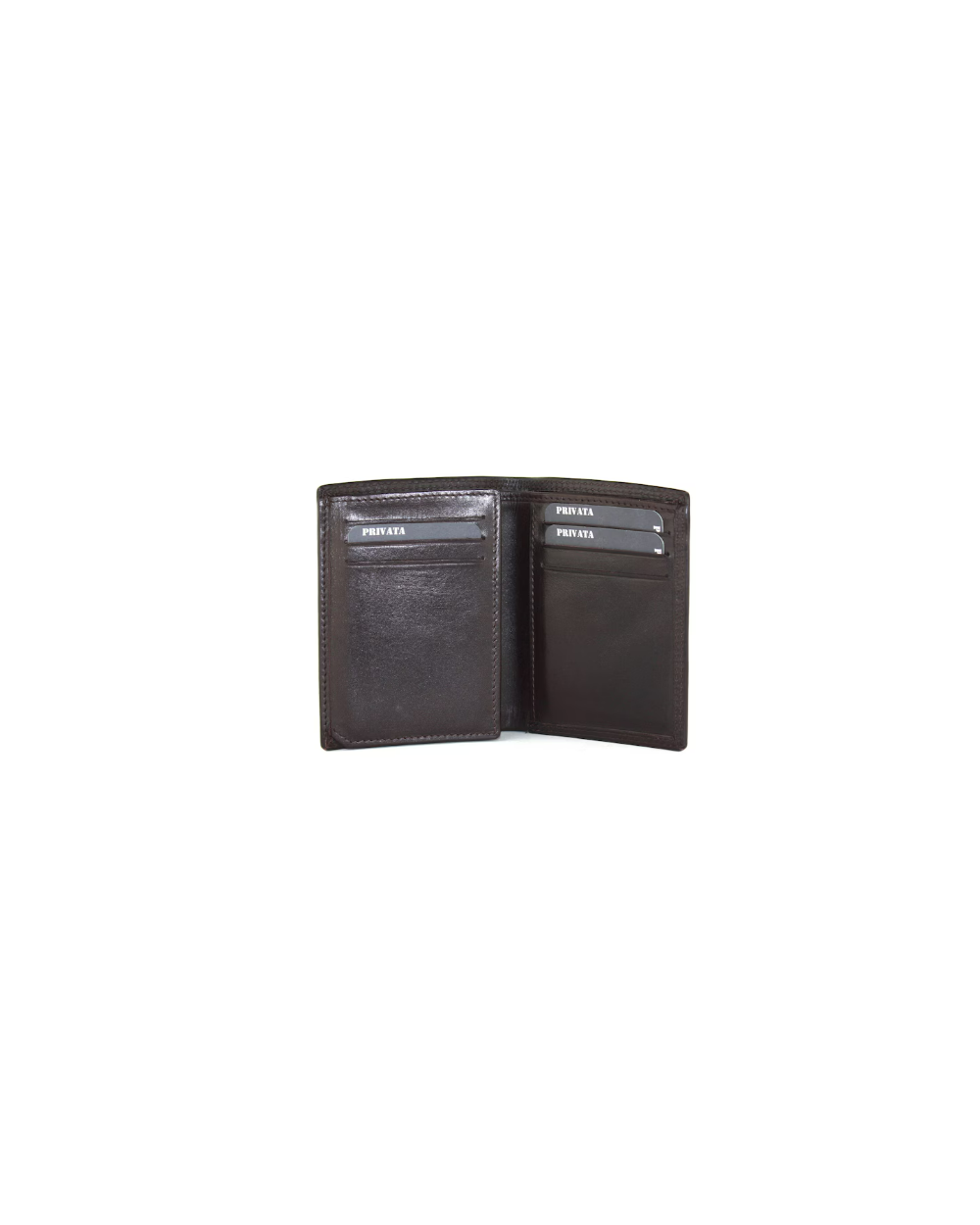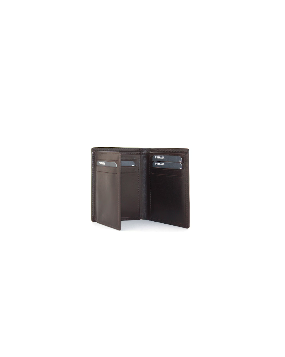 Billetero vertical fabricado en piel vacuno. Cierre con solapita y click. En el interior dispone de un departamento para billetes y 9 apartados para tarjetas. Logo de Privata serigrafiado. Viene presentado en una caja personalizada en cartón reciclado. Colección Seul