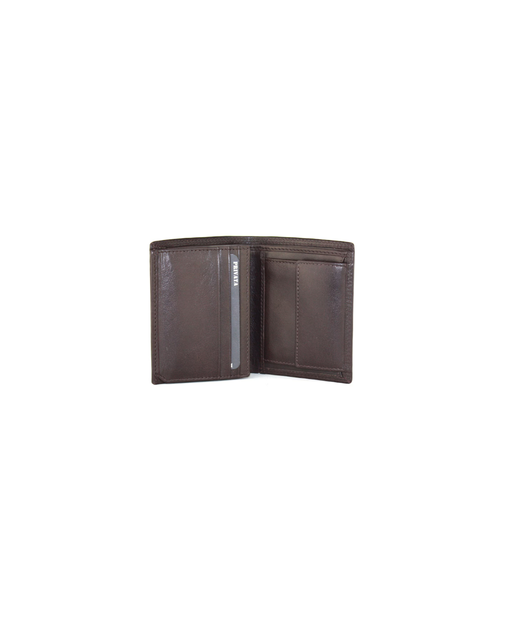 Billetero vertical fabricado en piel vacuno. En el interior dispone de dos departamentos para billetes y de 10 apartados para tarjetas. Viene presentado en una caja personalizada en cartón reciclado. Colección Bosco