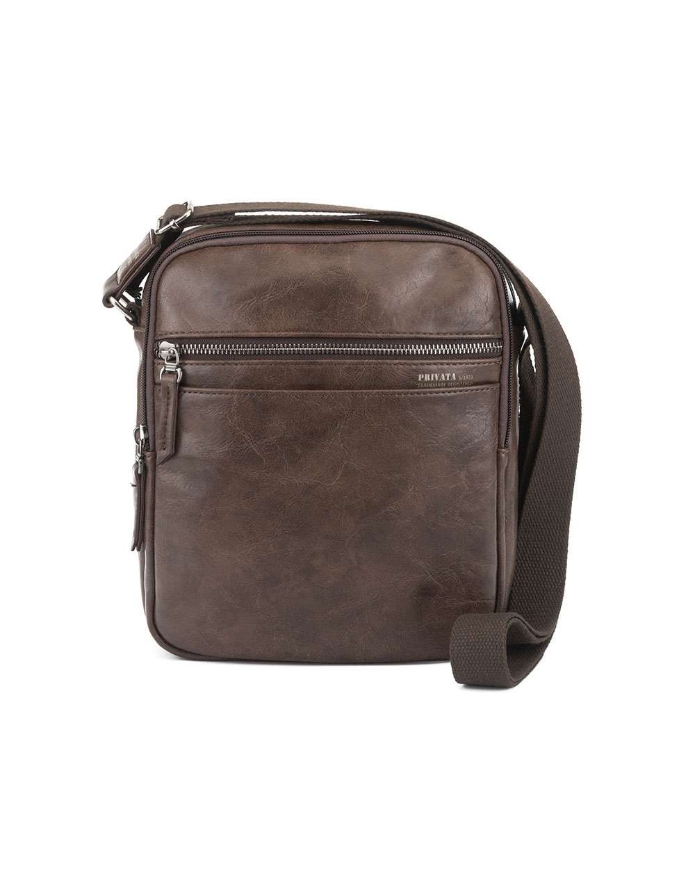Bolso bandolera Privata grande fabricado en ecopiel. Dispone de dos bolsillos frontales, uno de ellos con cremallera, y de otro trasero. Otras dos cremalleras dan acceso desde arriba una al departamento principal y otra a un bolsillo plano ideal para una tablet. Bandolera regulable. Logo en la parte frontal. Herrajes metálicos en zamak. Forro de algodón. Pertenece a la colección Move, que consta de una mochila cruzada, tres bandoleras, una mochila y una riñonera y está disponible en dos colores: marrón y negro.