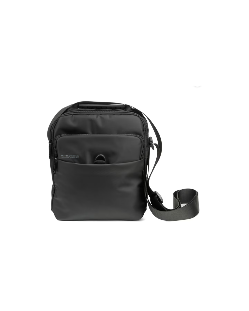 Bolso bandolera Privata fabricado en nylon con bandolera regulable y asa superior para llevarlo a mano. Tamaño tablet. Dispone de dos bolsillos en la parte frontal, uno de ellos con cremallera y uno con velcro, y de otro en la parte trasera. Desde la parte superior se accede, gracias a dos cremallera, a los dos compartimentos acolchados para la tablet. Herrajes metálicos en zamak. Forro de nylon. Colección Every