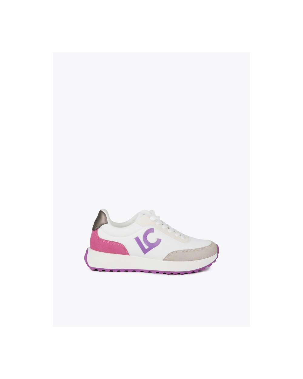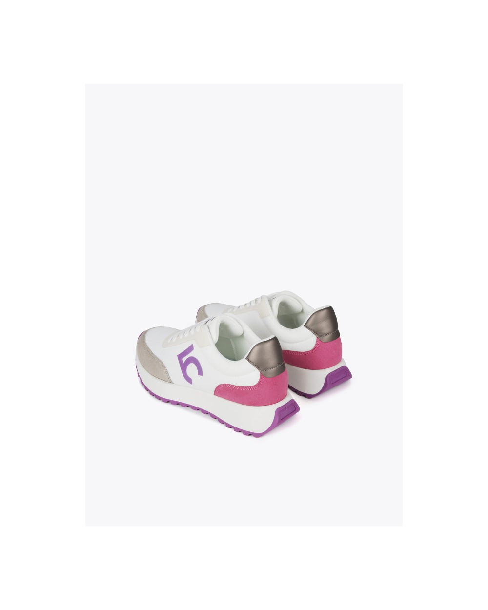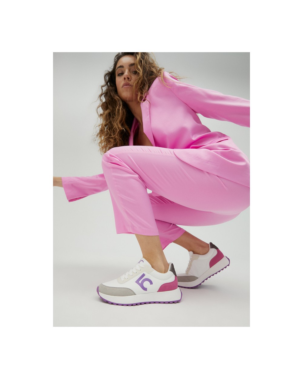 Zapatilla deportiva en formato bamba con tonos lilas y rosas. Suela de plataforma dentada de 4cm de altura. Detalle de logo en frontal y lateral con franjas a contraste.