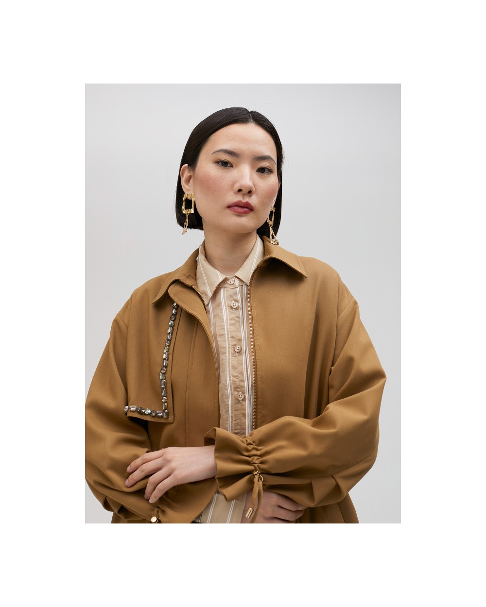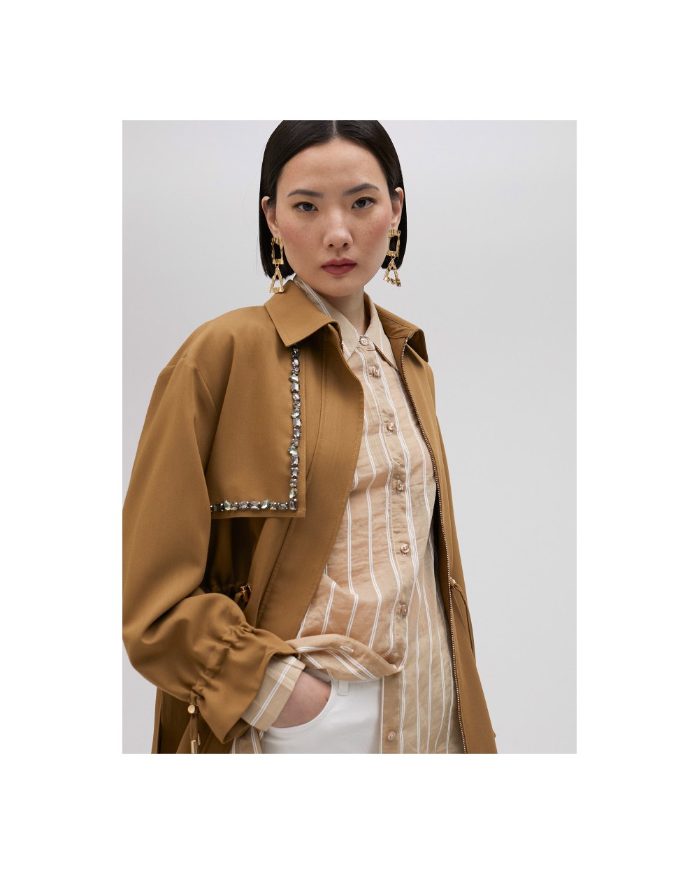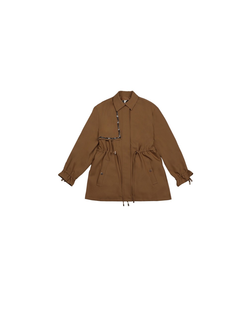 Chaqueta sahariana de manga larga con cuello camisero. Detalle de pedrería, bolsillos delanteros de tablilla y cintura y puños ajustables. Cierre con cremallera y corte oversize.
