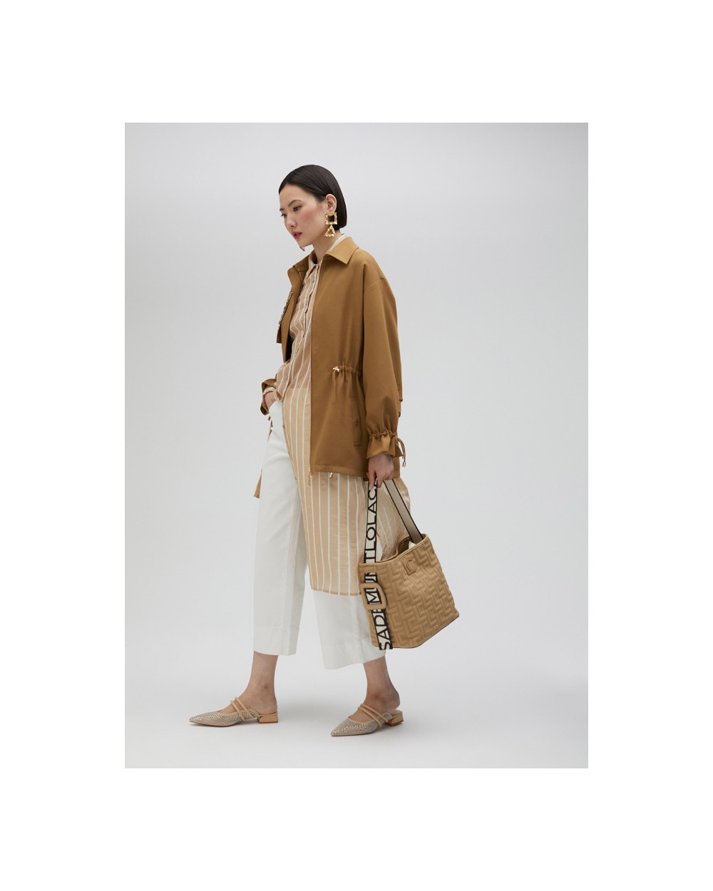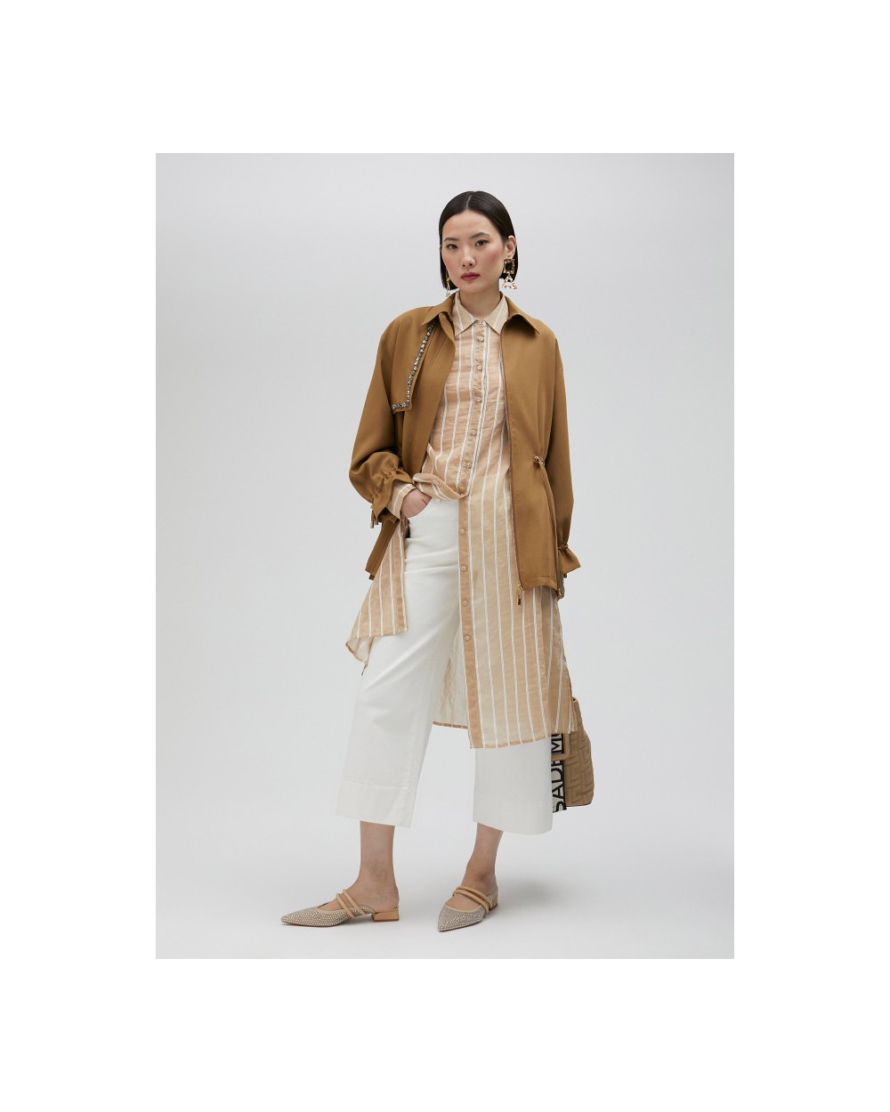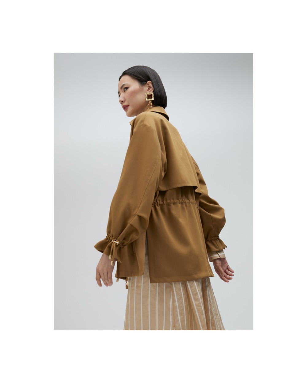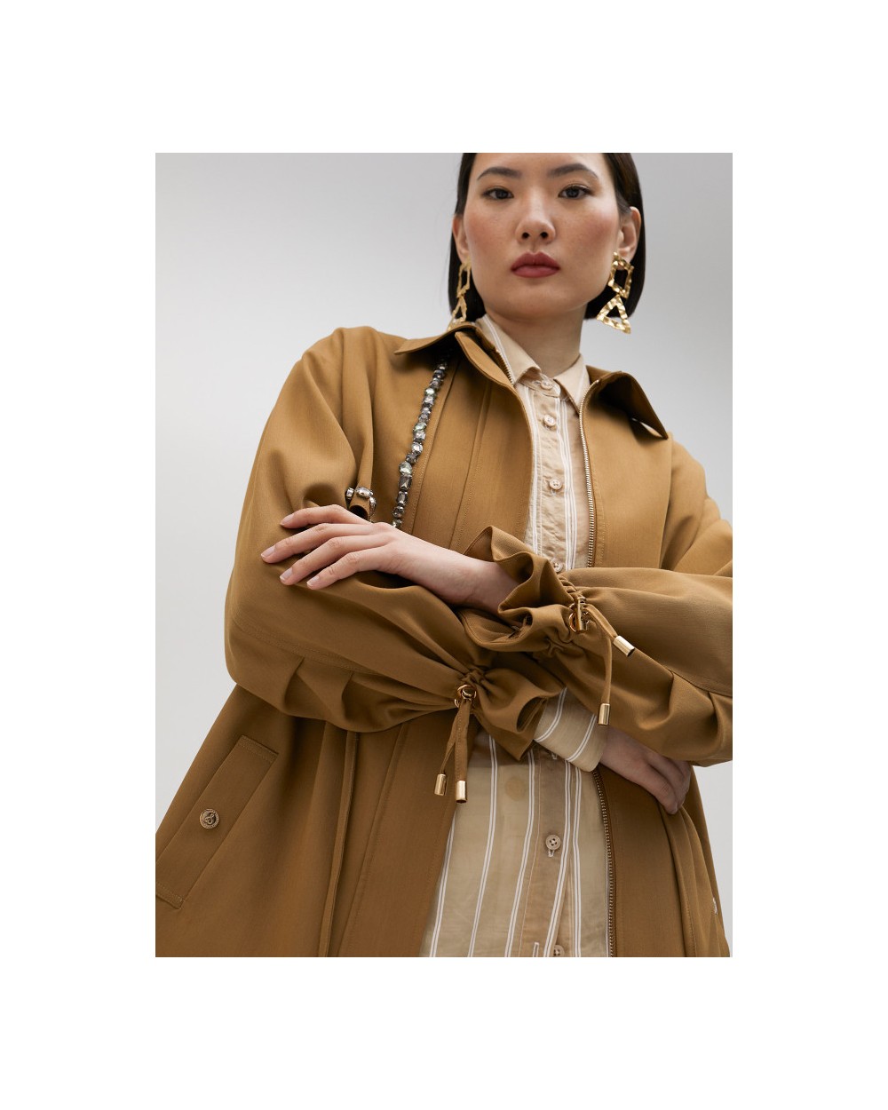 Chaqueta sahariana de manga larga con cuello camisero. Detalle de pedrería, bolsillos delanteros de tablilla y cintura y puños ajustables. Cierre con cremallera y corte oversize.