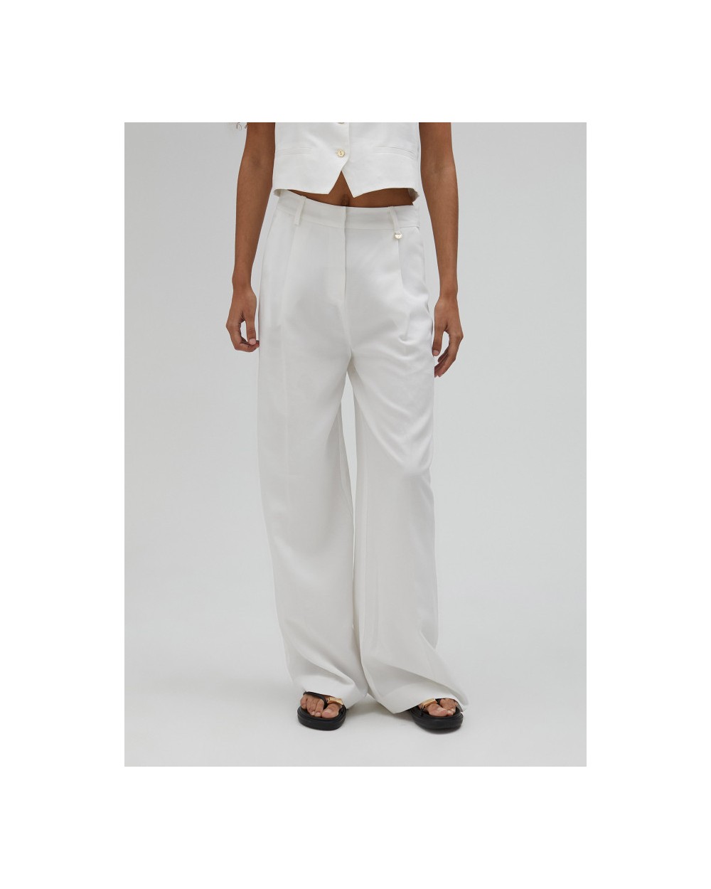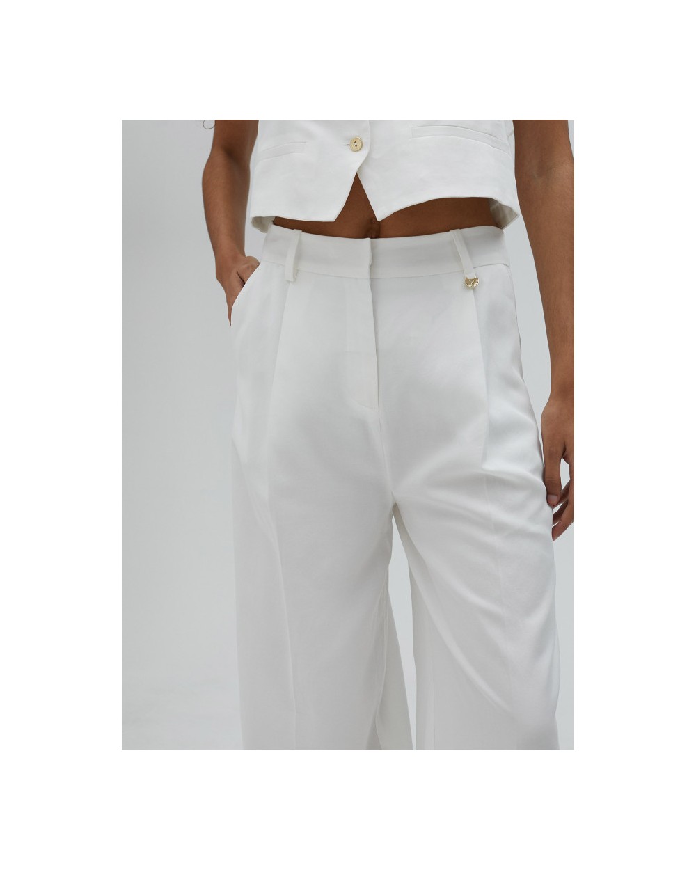 Pantalón palazzo con bolsillos laterales y traseros y detalle medallita dorada logotipada.