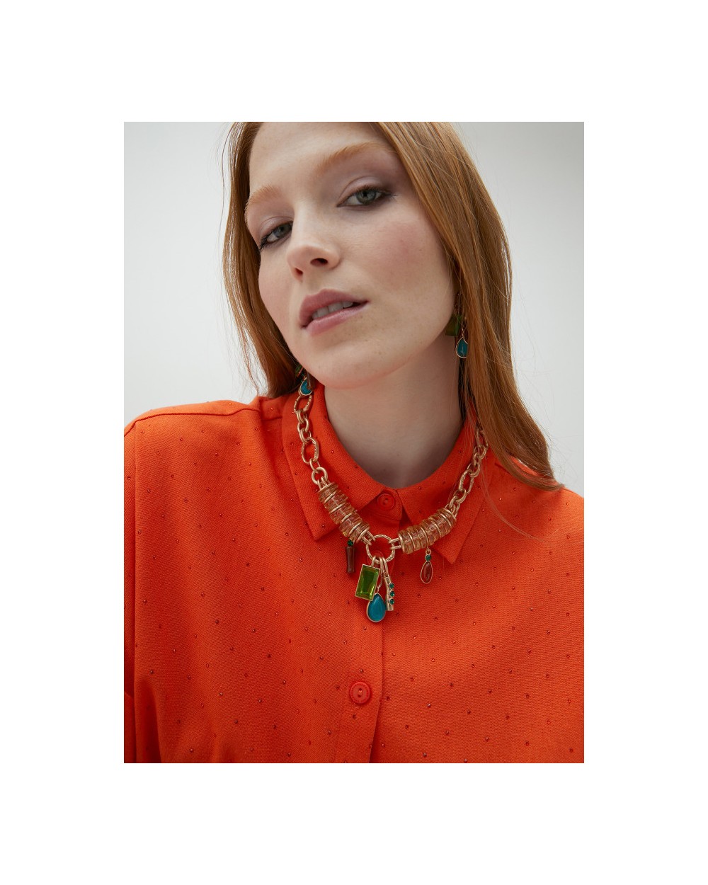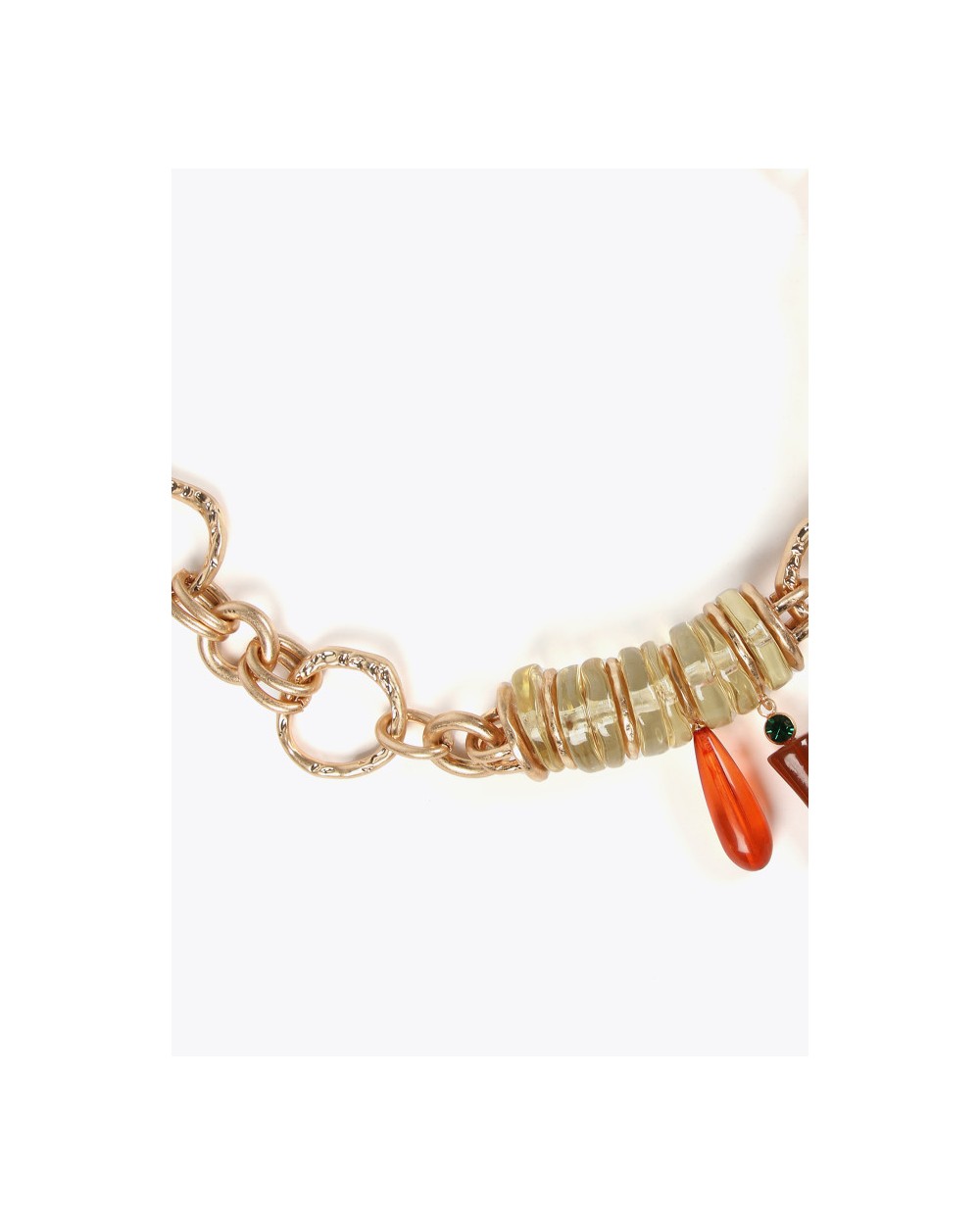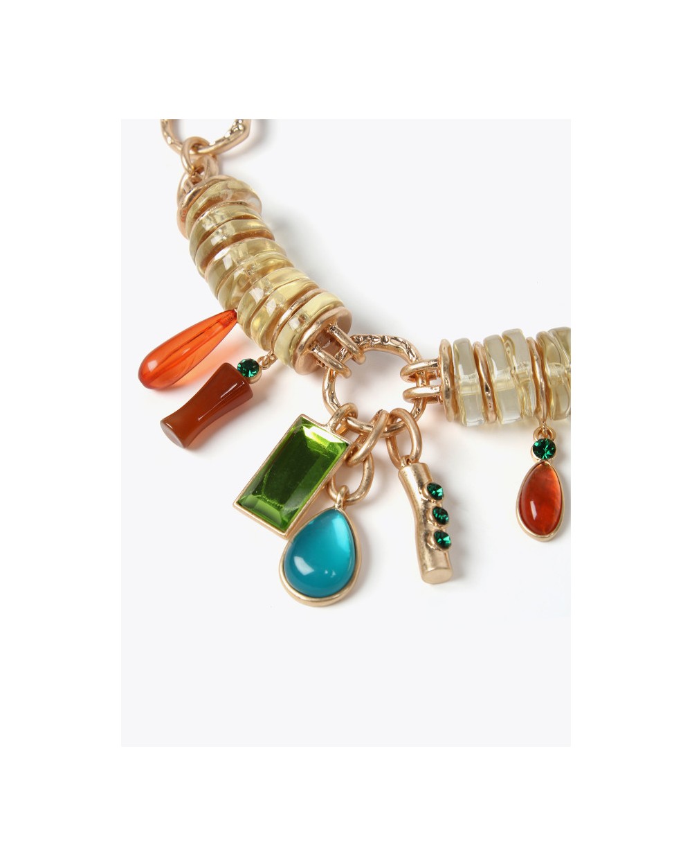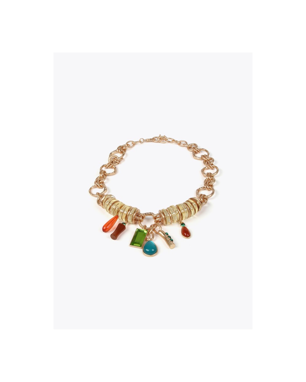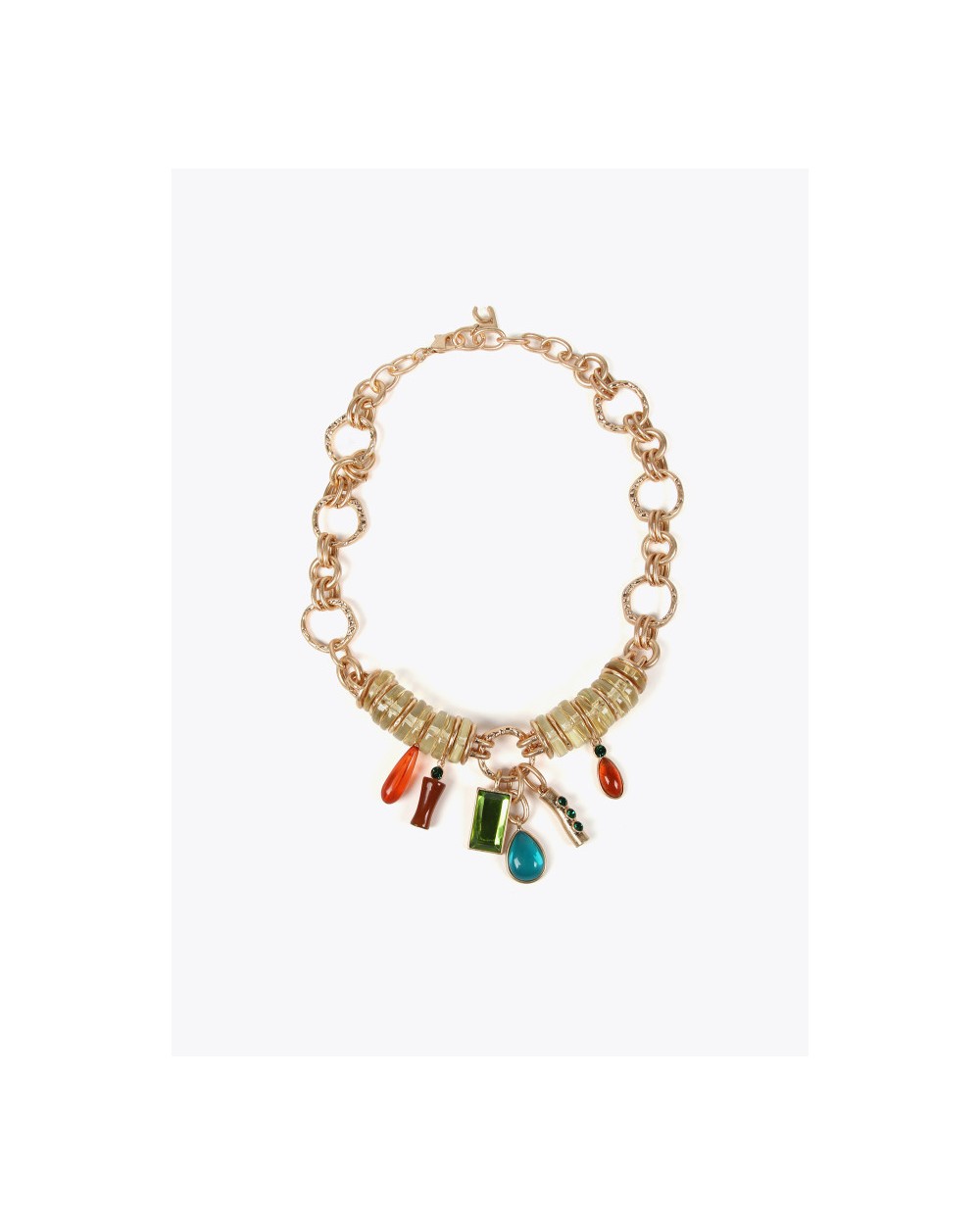 Collar metálico con piezas acrílicas colores. Cierre ajustable con mosquetón. No contiene níquel.