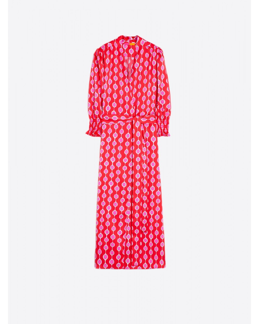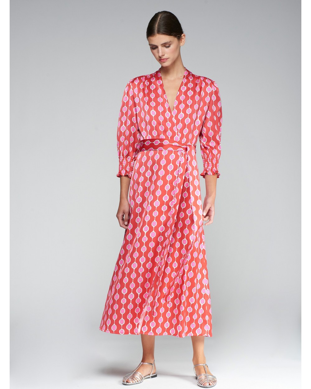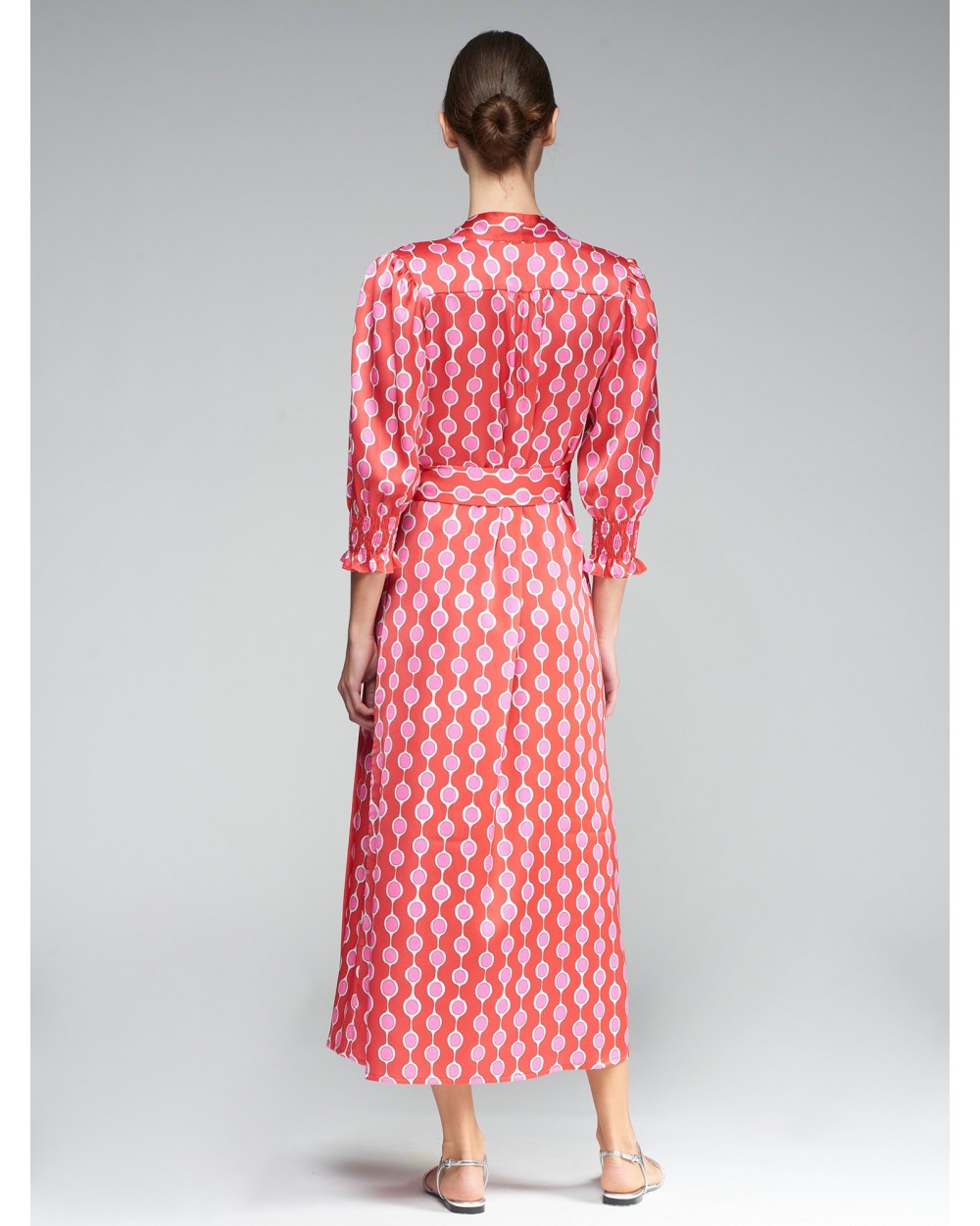 Vestido midi cruzado con estampado geomètrico rosa y rojo . Escote cruzado en pico. Lazo anudado en la cintura. Manga tres cuartos acabada con goma en puños .