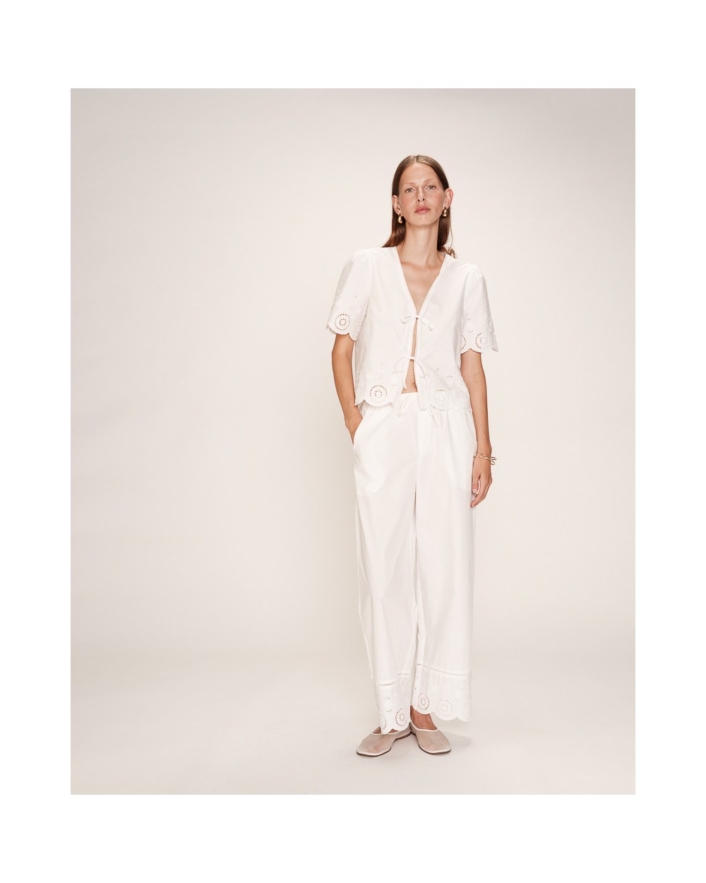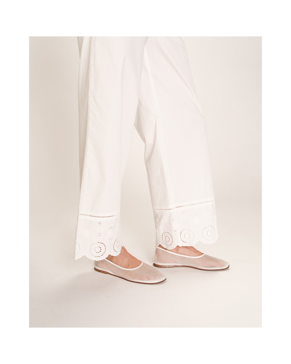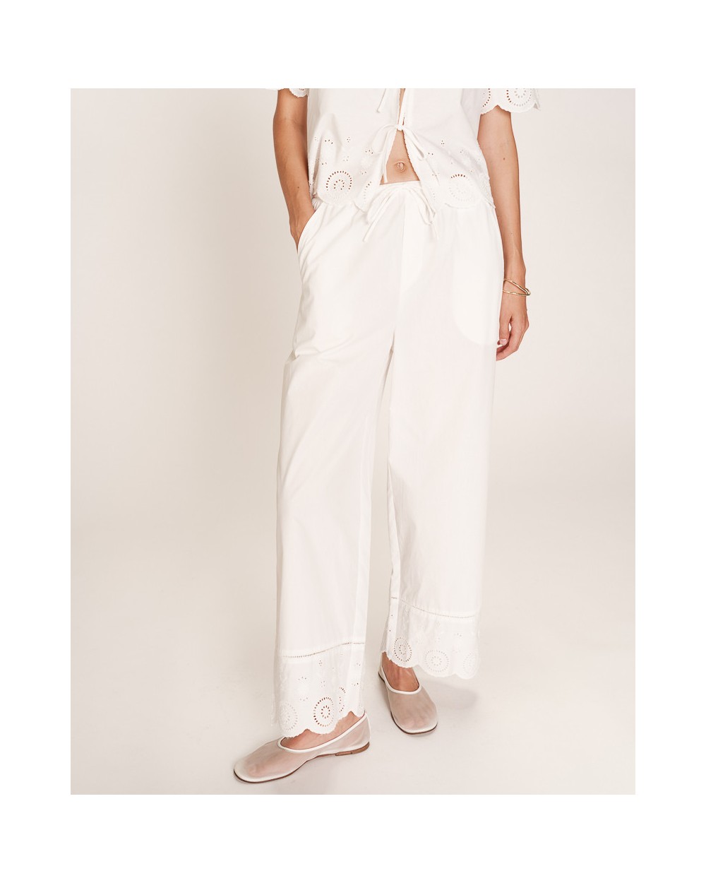 con bordado inglés estos pantalones rectos RENOIR presentan una cinturilla elástica de tiro medio con cordón.