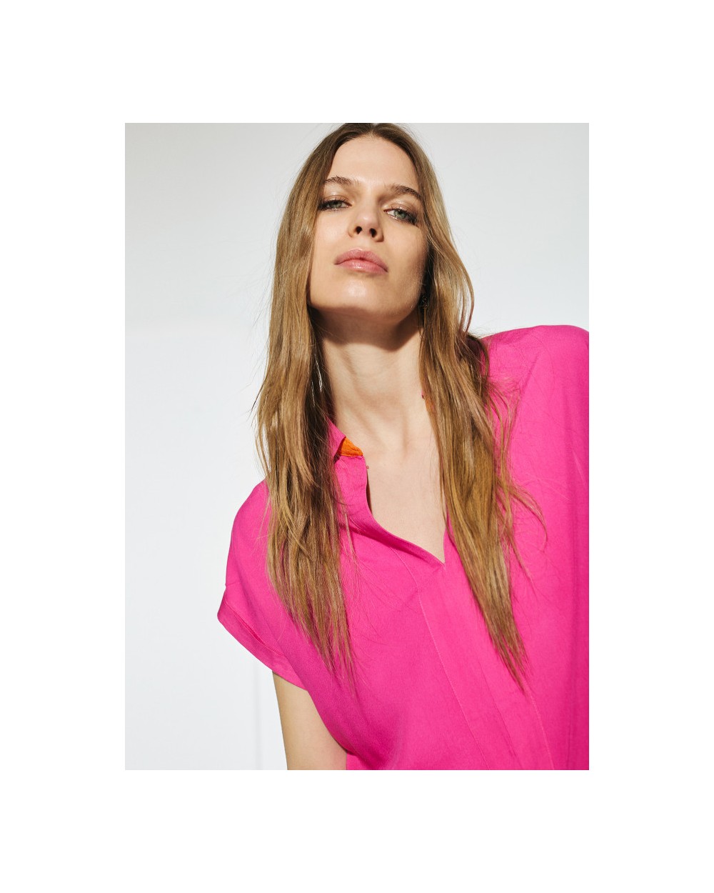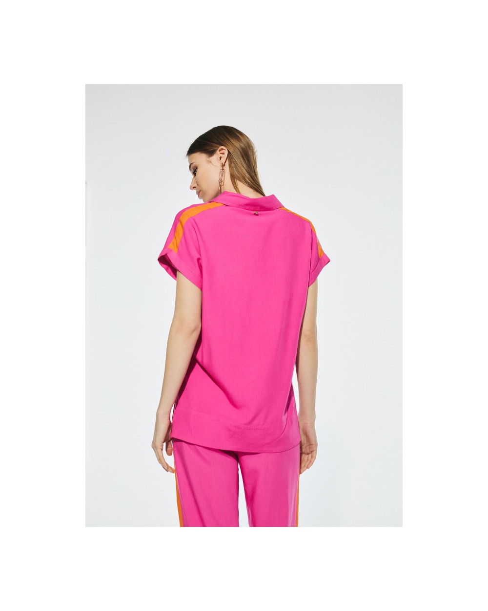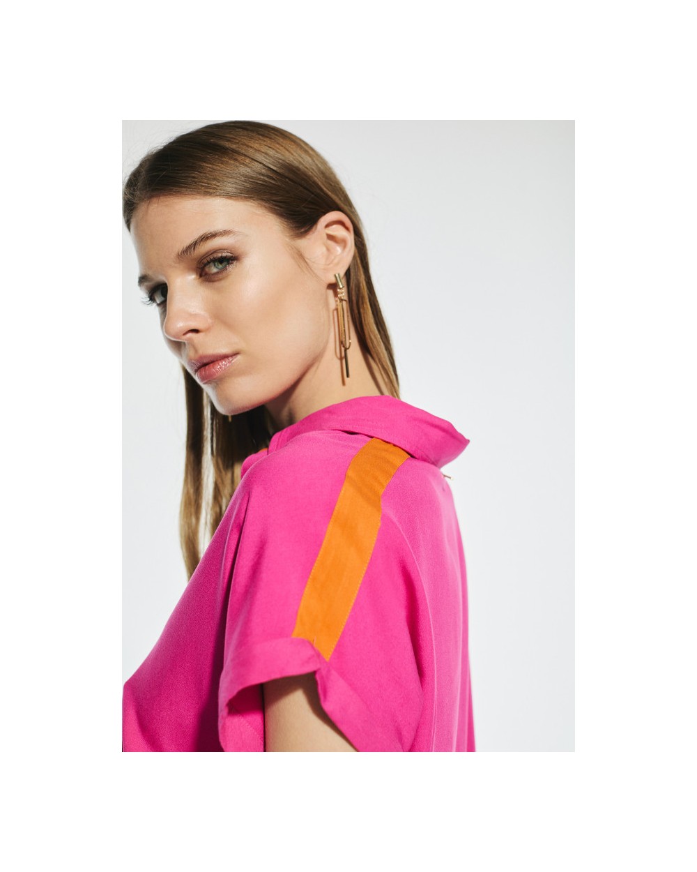 Blusa fluida en color fucsia con detalle naranja en los hombros. Cuello camisero en pico y medalla dorada con el logo en la parte trasera.