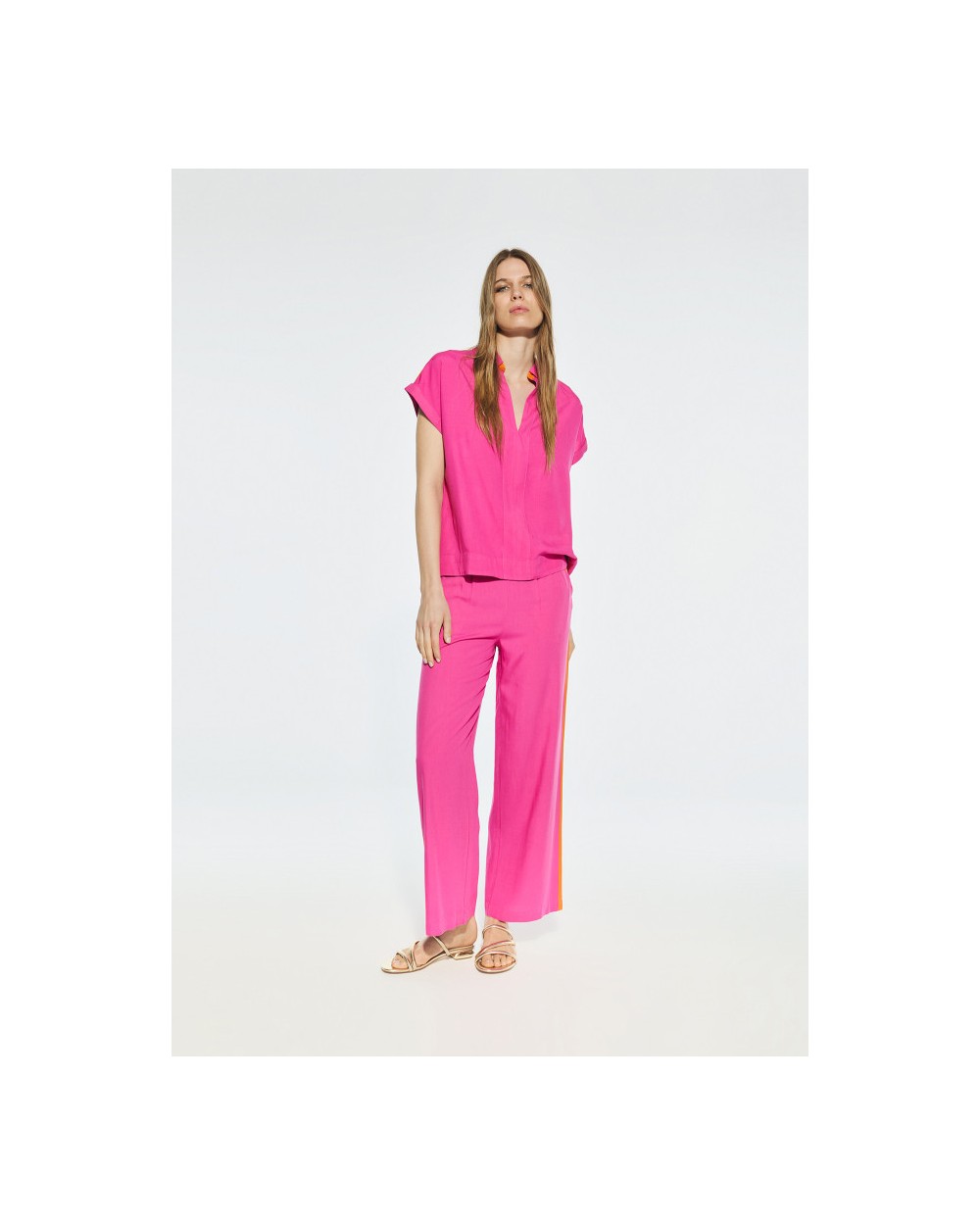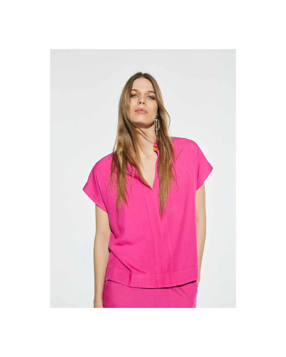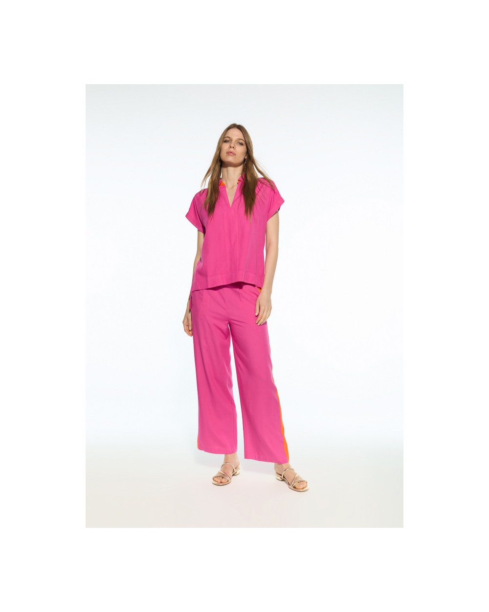 Blusa fluida en color fucsia con detalle naranja en los hombros. Cuello camisero en pico y medalla dorada con el logo en la parte trasera.
