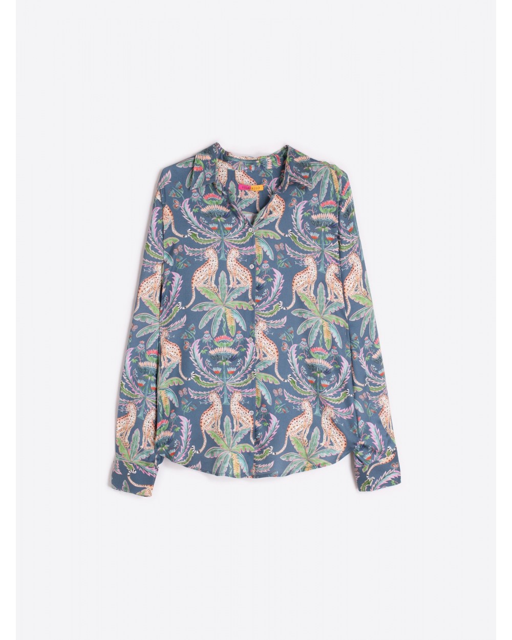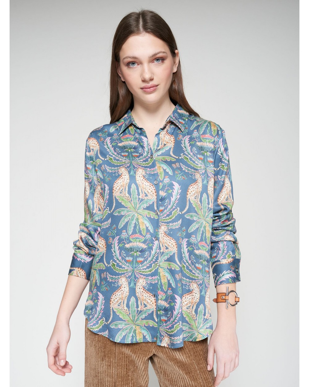 Camisa manga larga, con estampado de leopardos y palmeras, en fondo azul grisàceo, cuello clàsico con cierre frontal de botones. Corte recto y bajo redondeado.