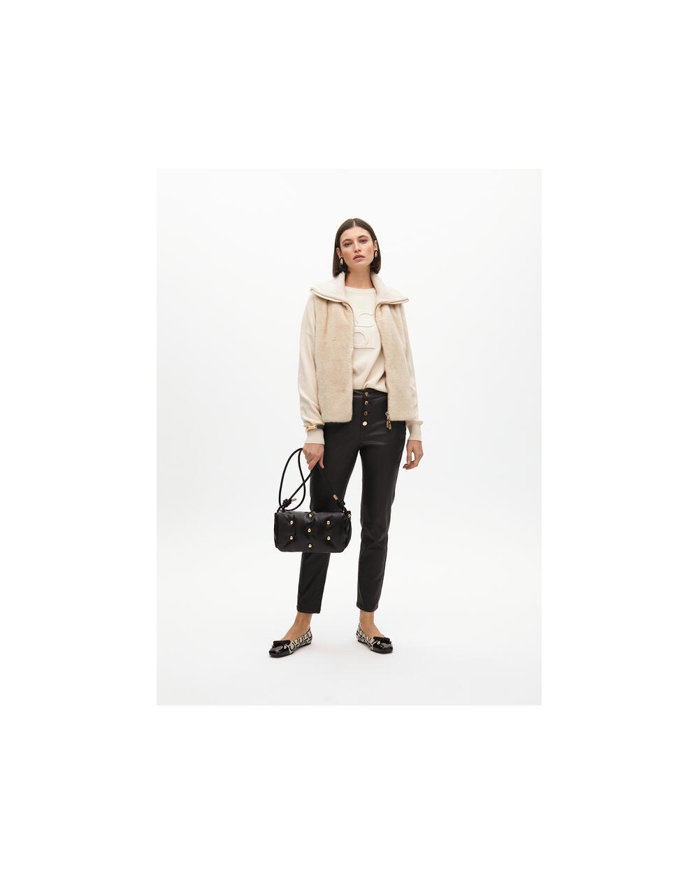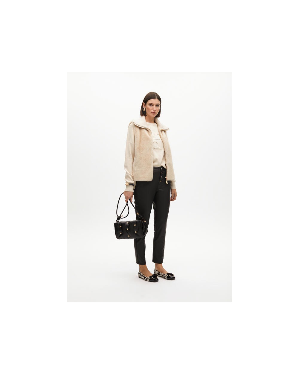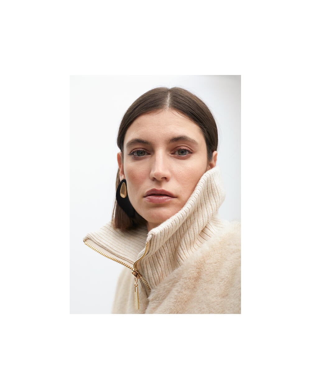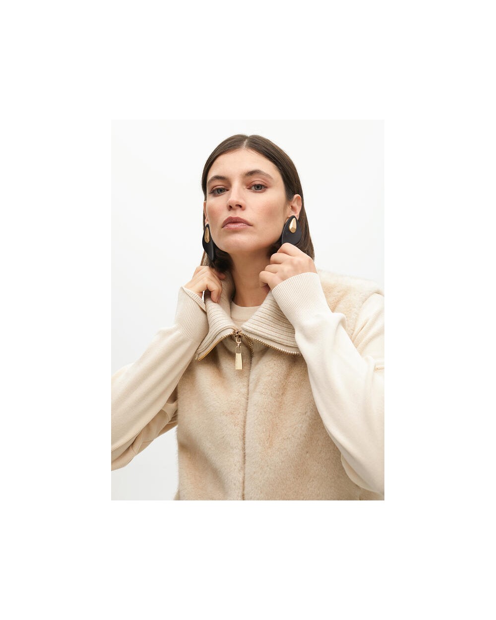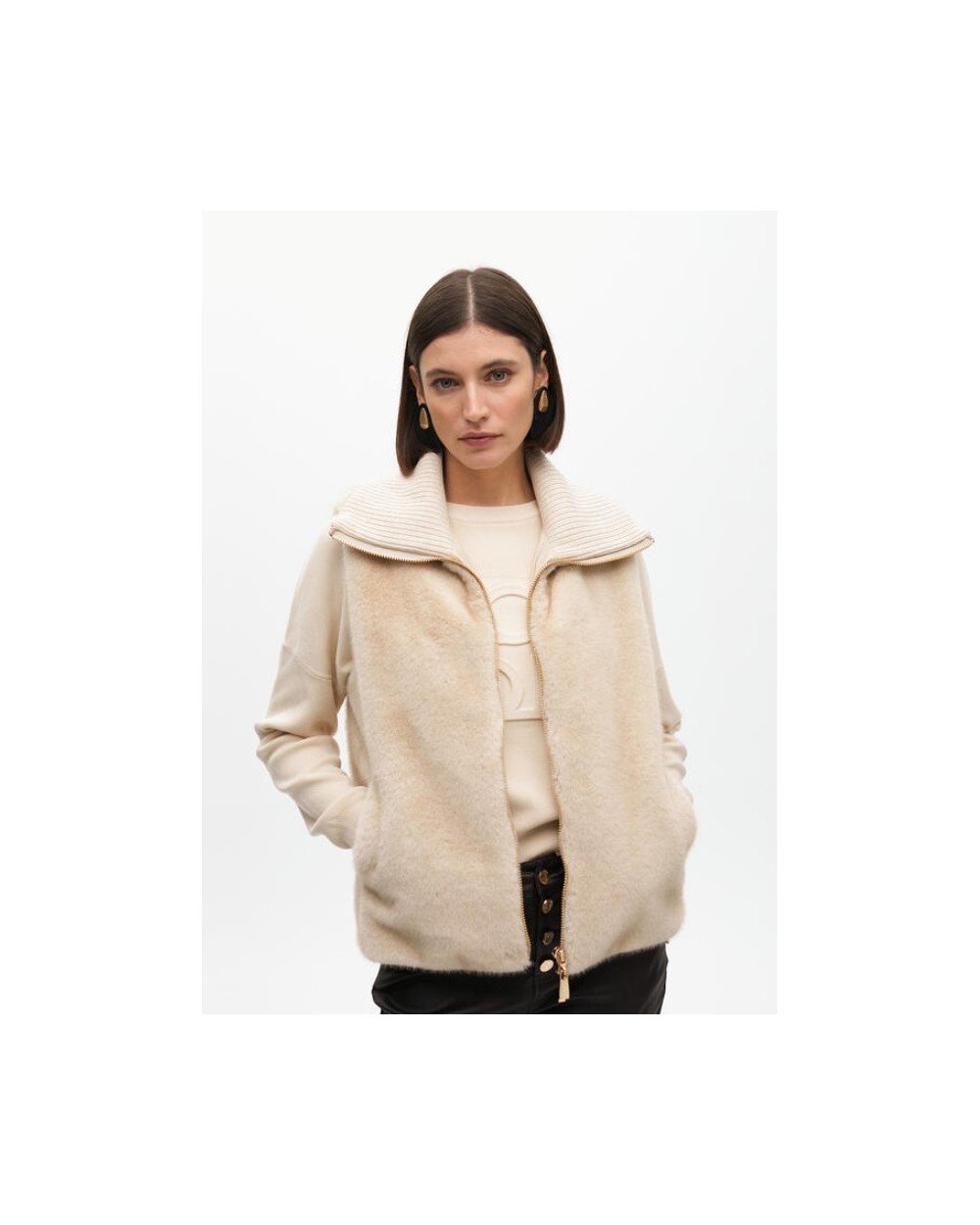 Chaleco de pelo corto en color crudo, cuello doble de canalè, cierra con cremallera.