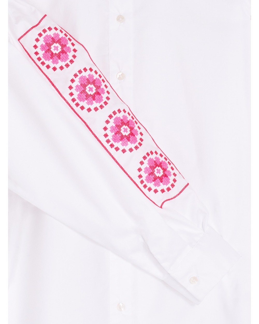 Camisa blanca con bordado en mangas de flores en punto de cruz en color rosa y rojo. Cierre frontal con botones camiseros. Manga larga abullonada acabada en puño. La modelo mide 177 cm y lleva la talla 38.