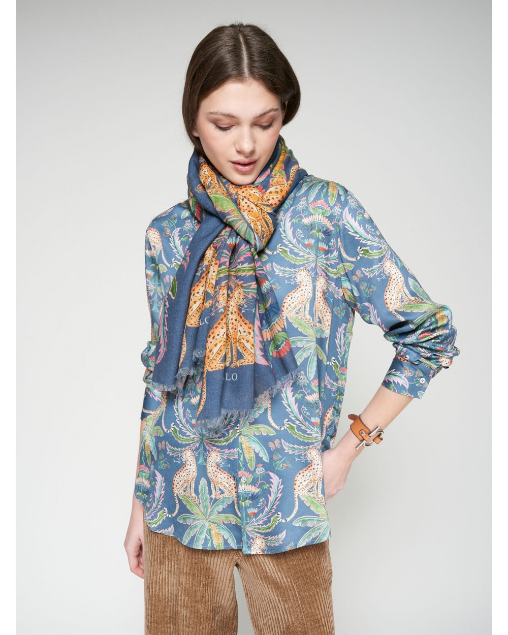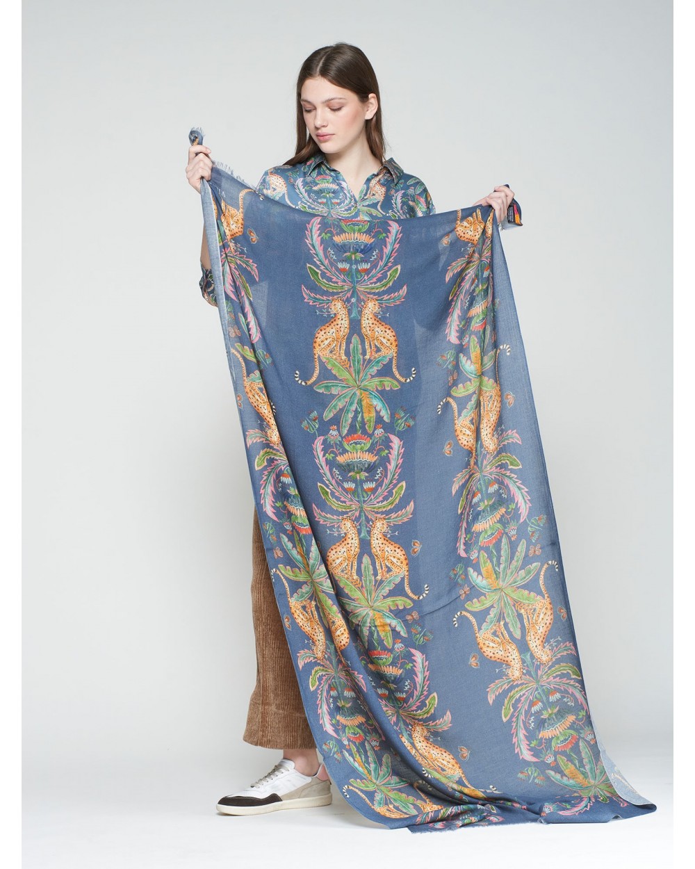 Foulard suave con fondo azul y estampado de leopardos entre palmeras, rectangular, terminado en pequeños flecos, mezcla de algodòn y lana.