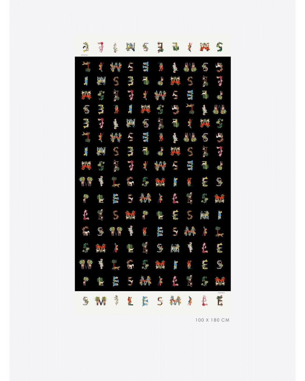 Pañuelo negro rectangular con letras de color, formadas por flores. Franja con repeticiòn de la palabra Smile. Tejido mezcla cálida de algodón , modal y lana.
