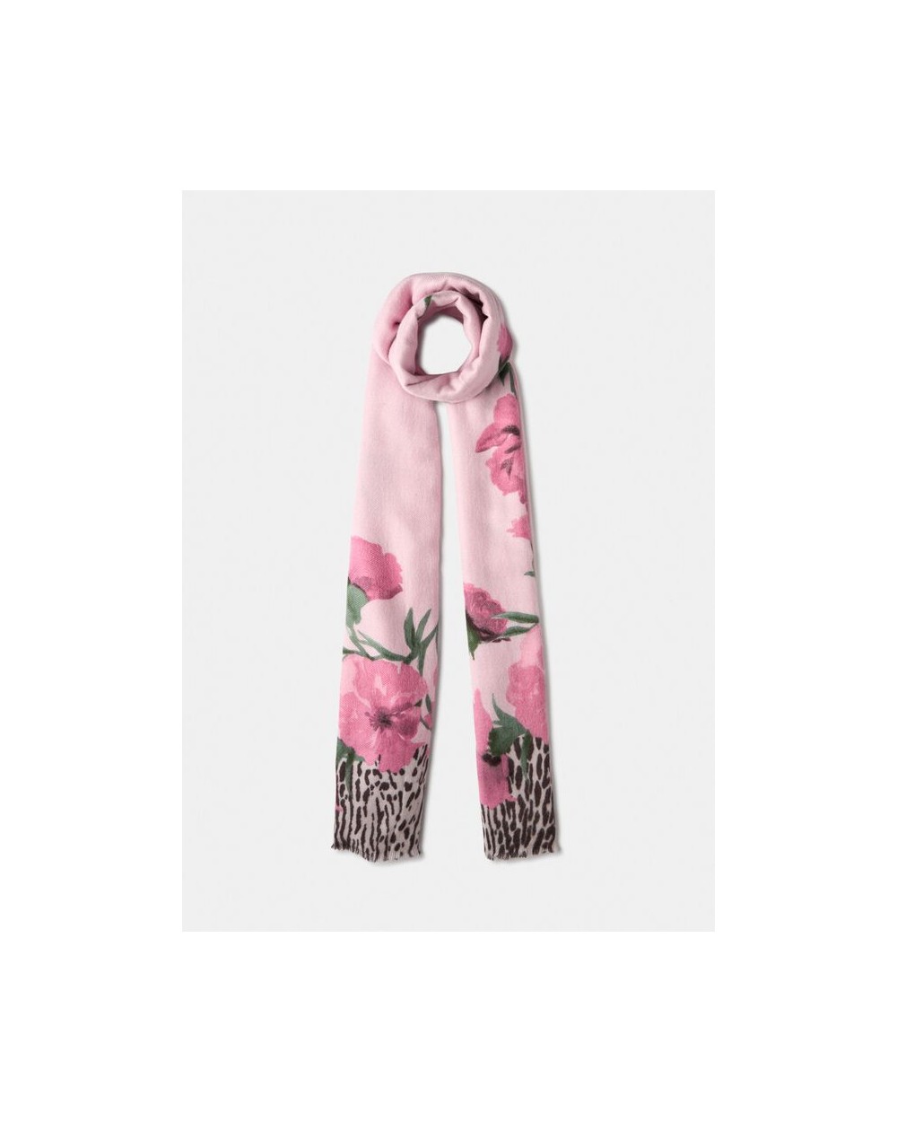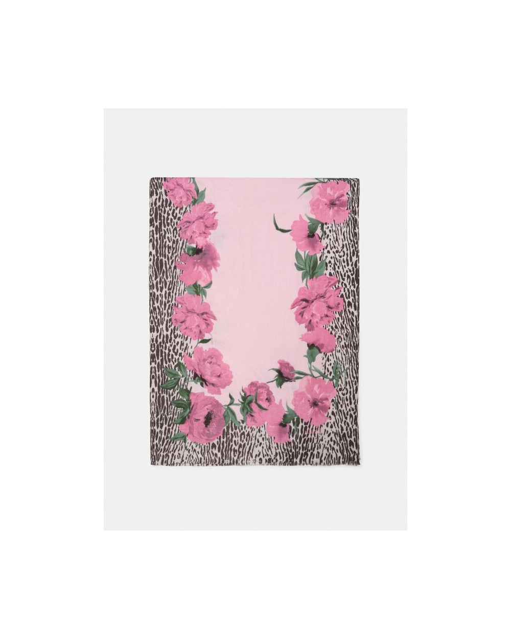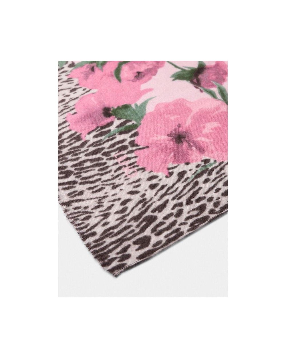 Pañuelo tejido soft de Liujo, en fondo rosa con estampado de flores y en los bordes estampado cebra. Flecos cortos en los bordes.