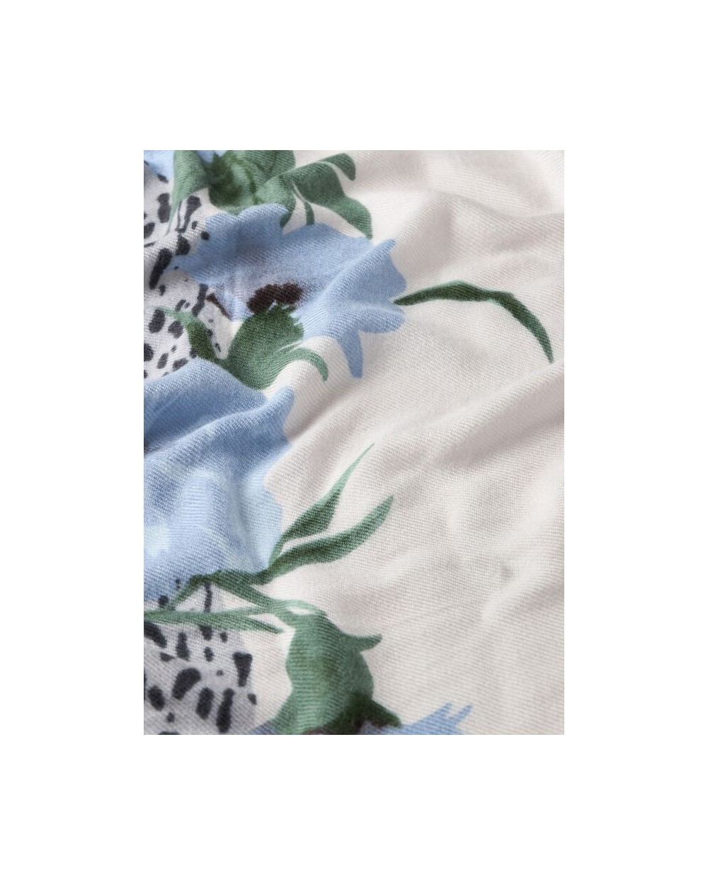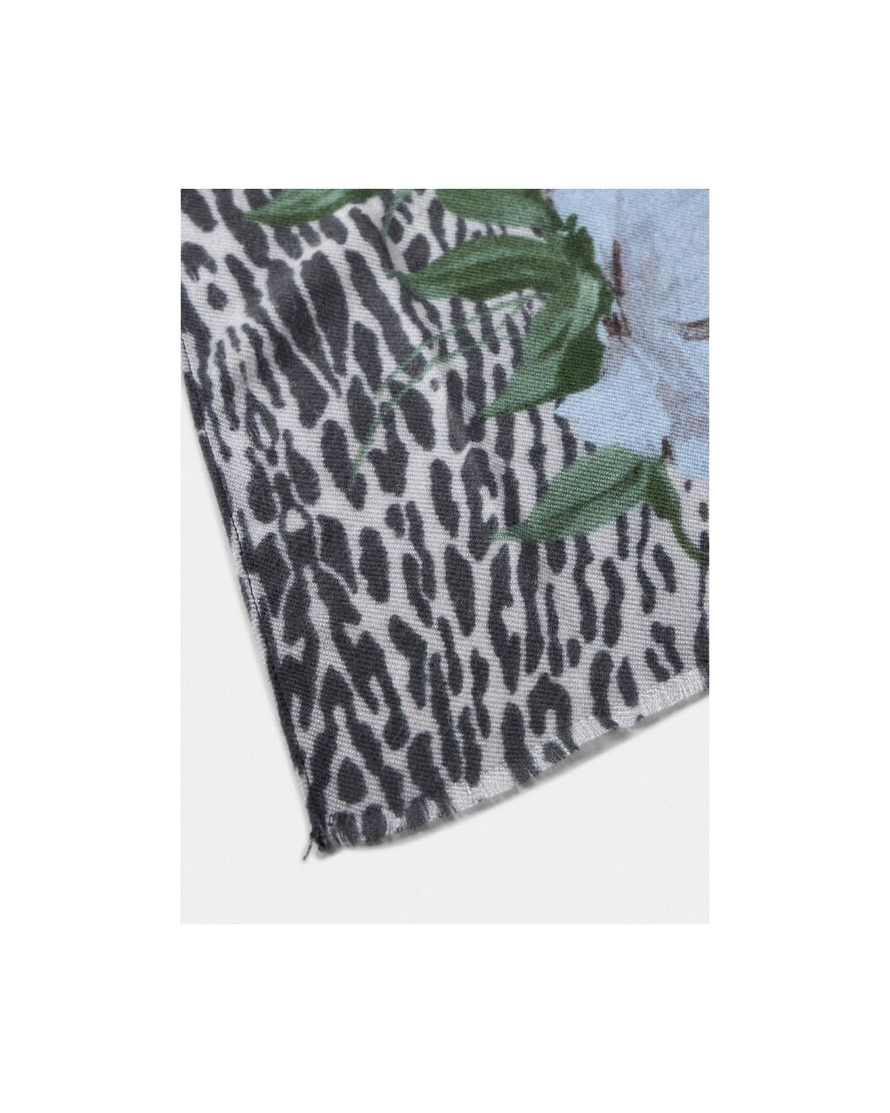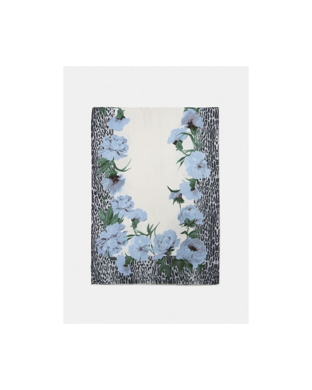 Pañuelo tejido soft de Liujo, en fondo rosa con estampado de flores y en los bordes estampado cebra. Flecos cortos en los bordes.