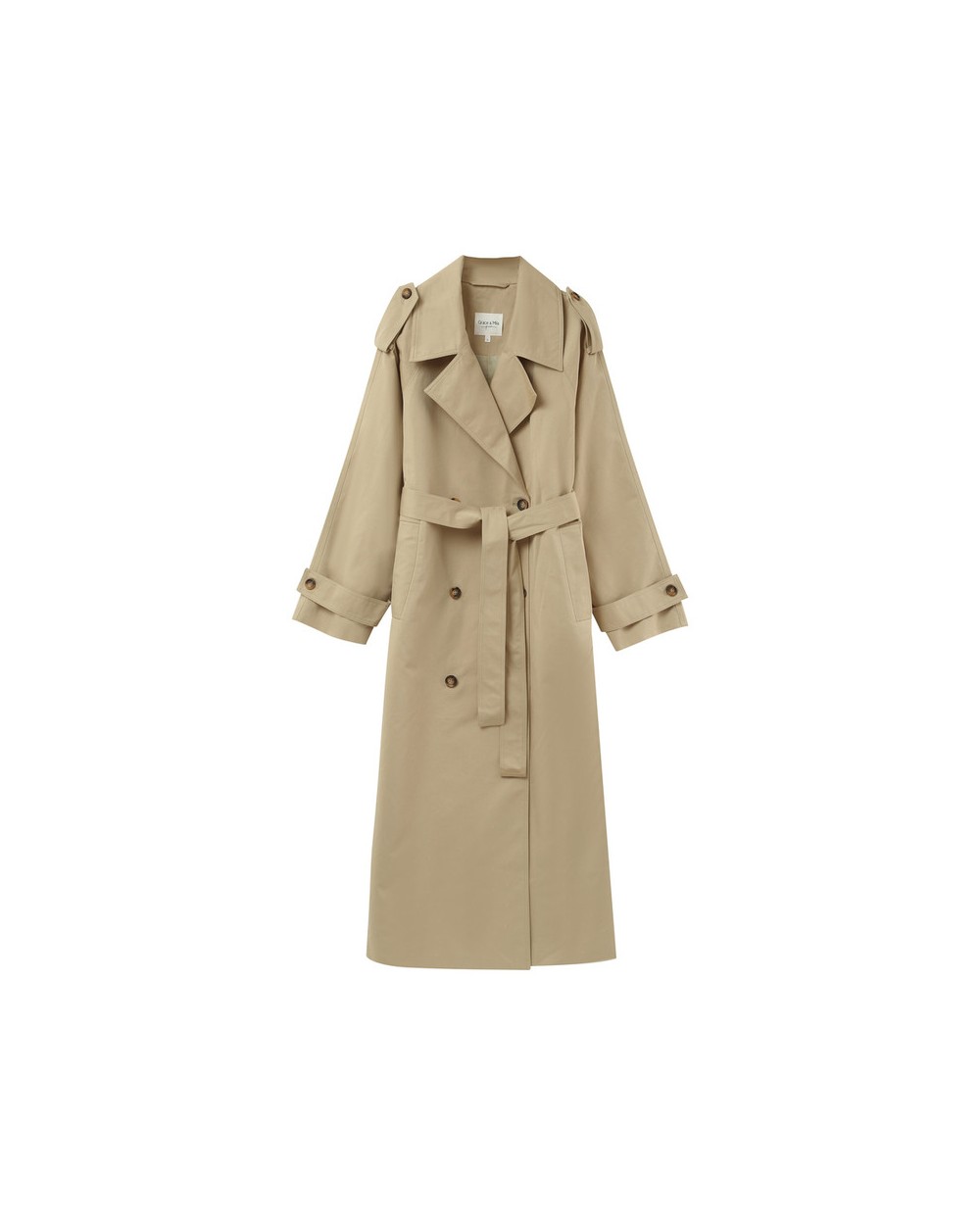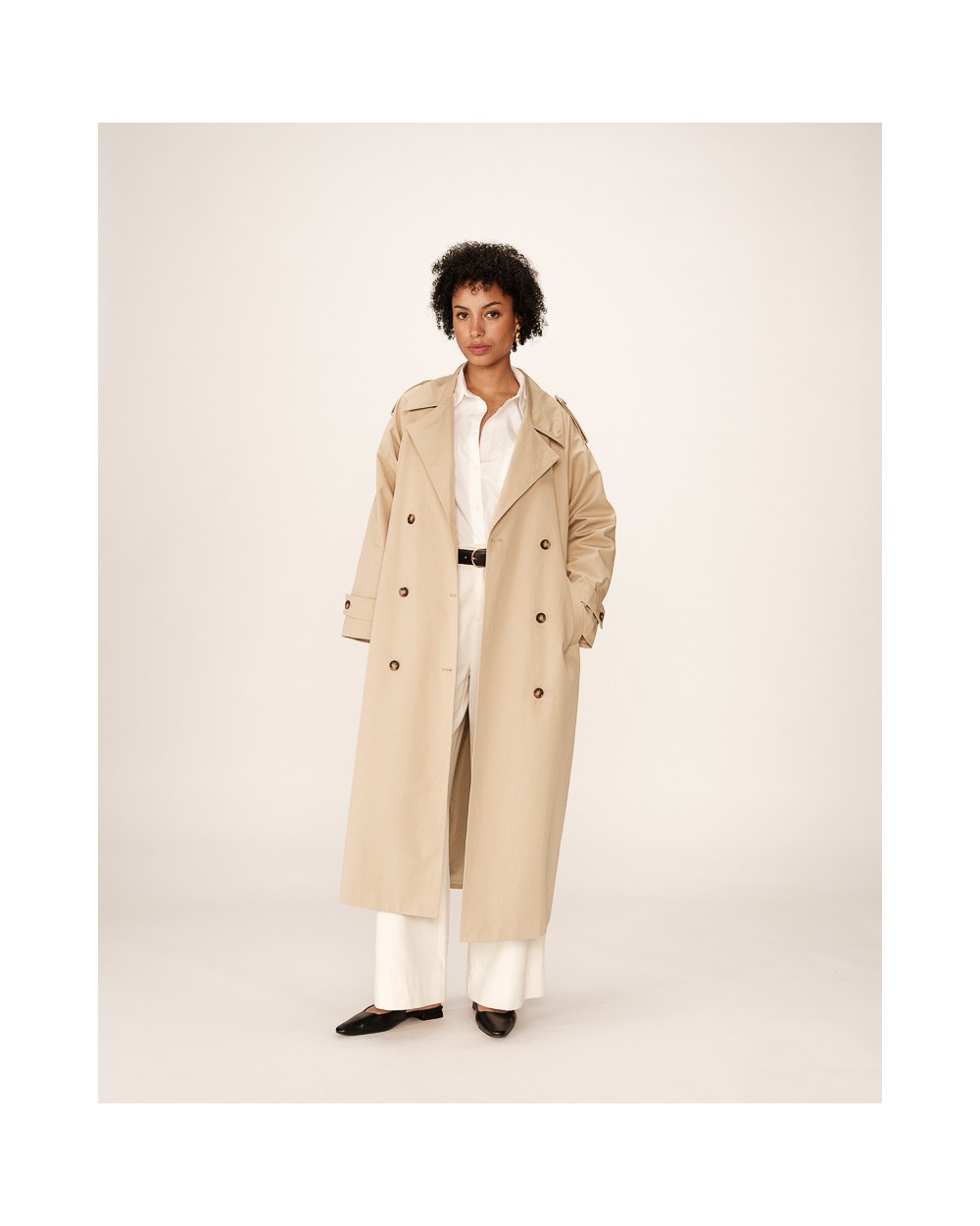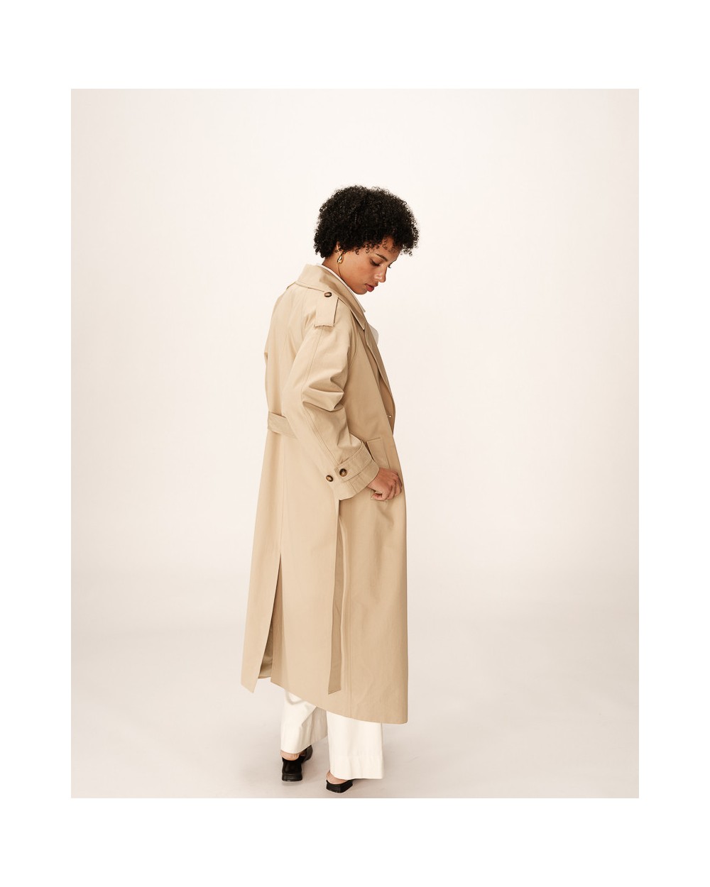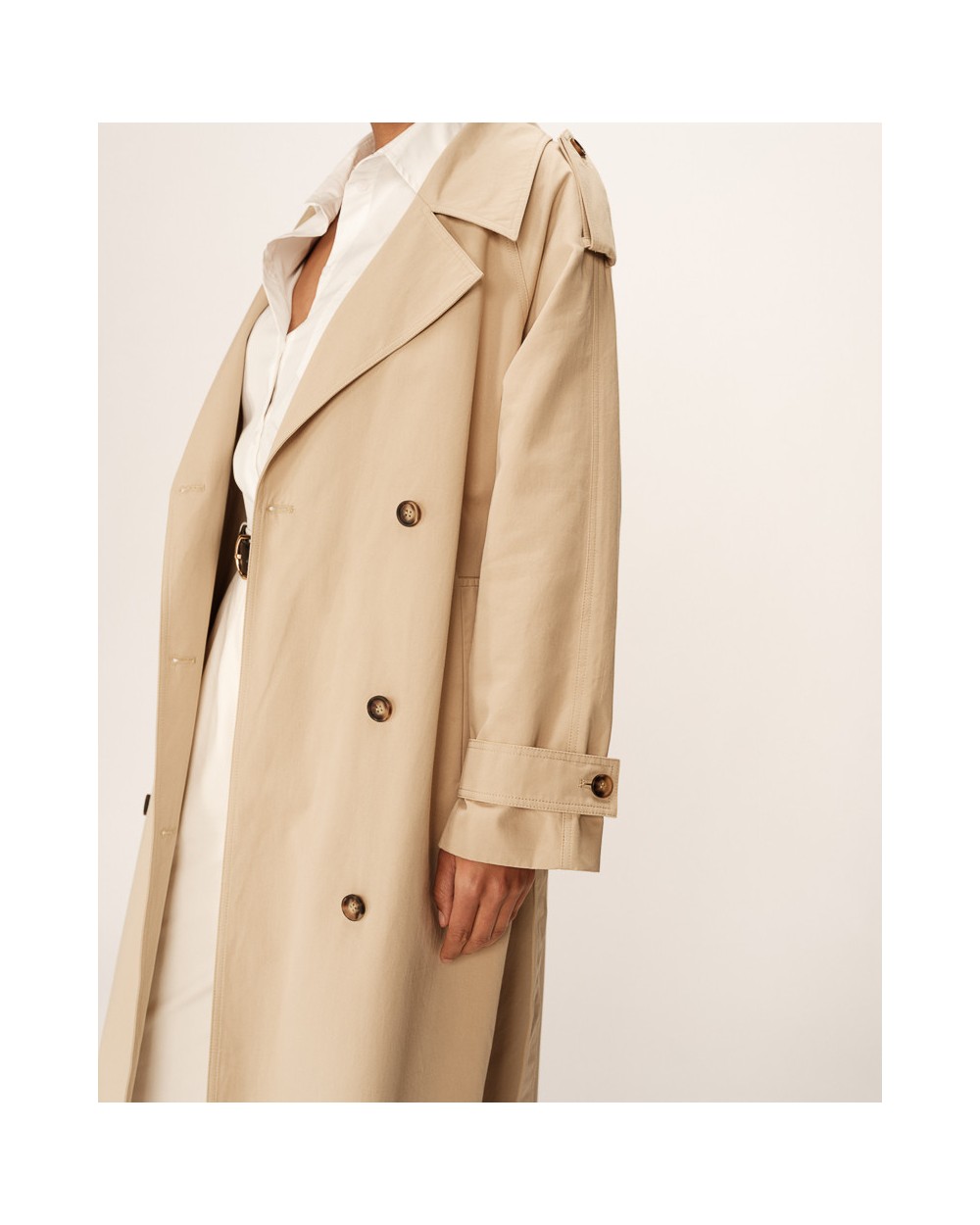 La gabardina de algodón PROUST es un must have de entretiempo. La gabardina larga PROUST, confeccionada en 100% algodón y forrada, se une a nuestra gama en fibras naturales 'Un Brin de Vert'. El corte holgado y amplio ofrece una silueta moderna y contemporánea. El modelo tiene manga larga, cuello de solapa.