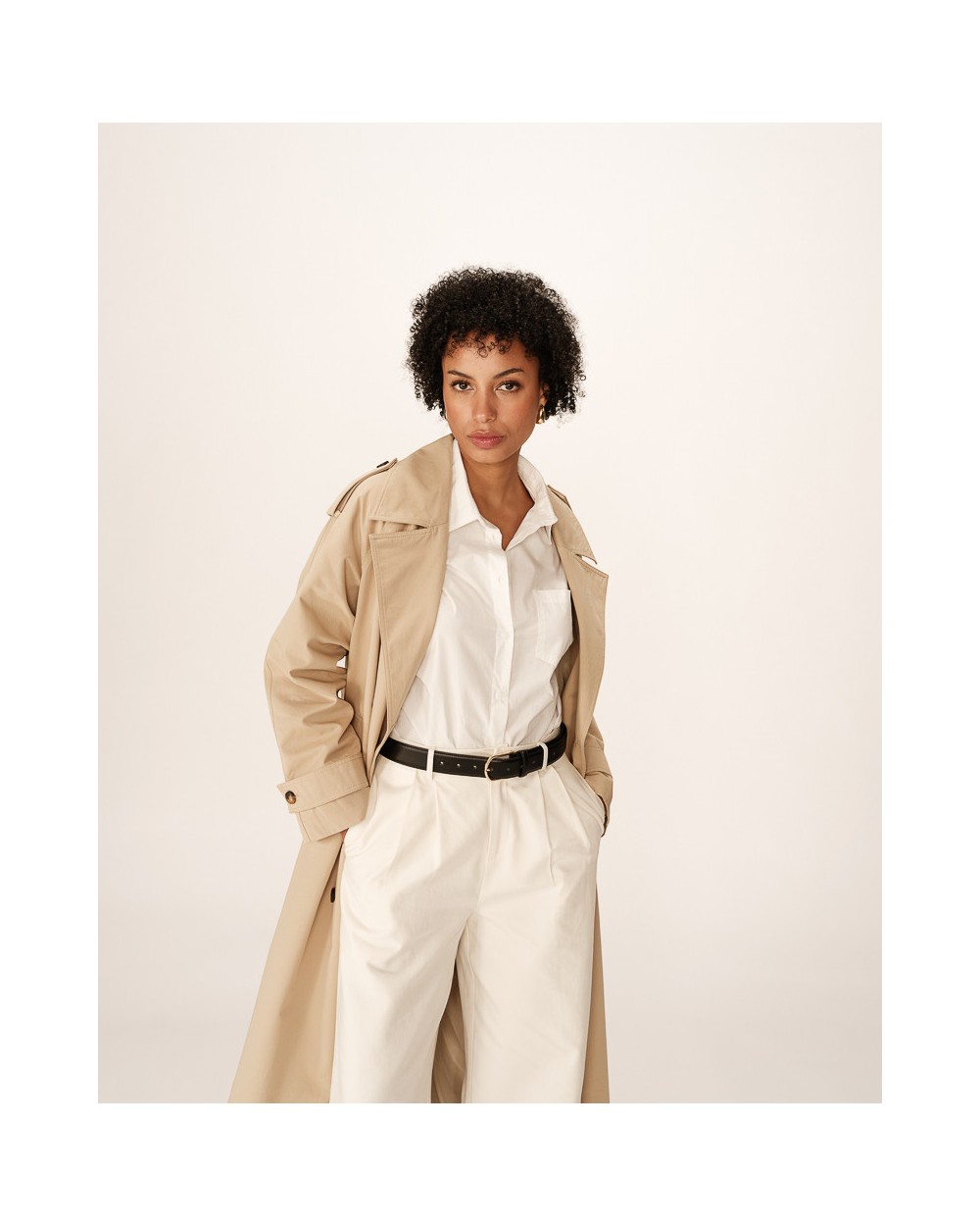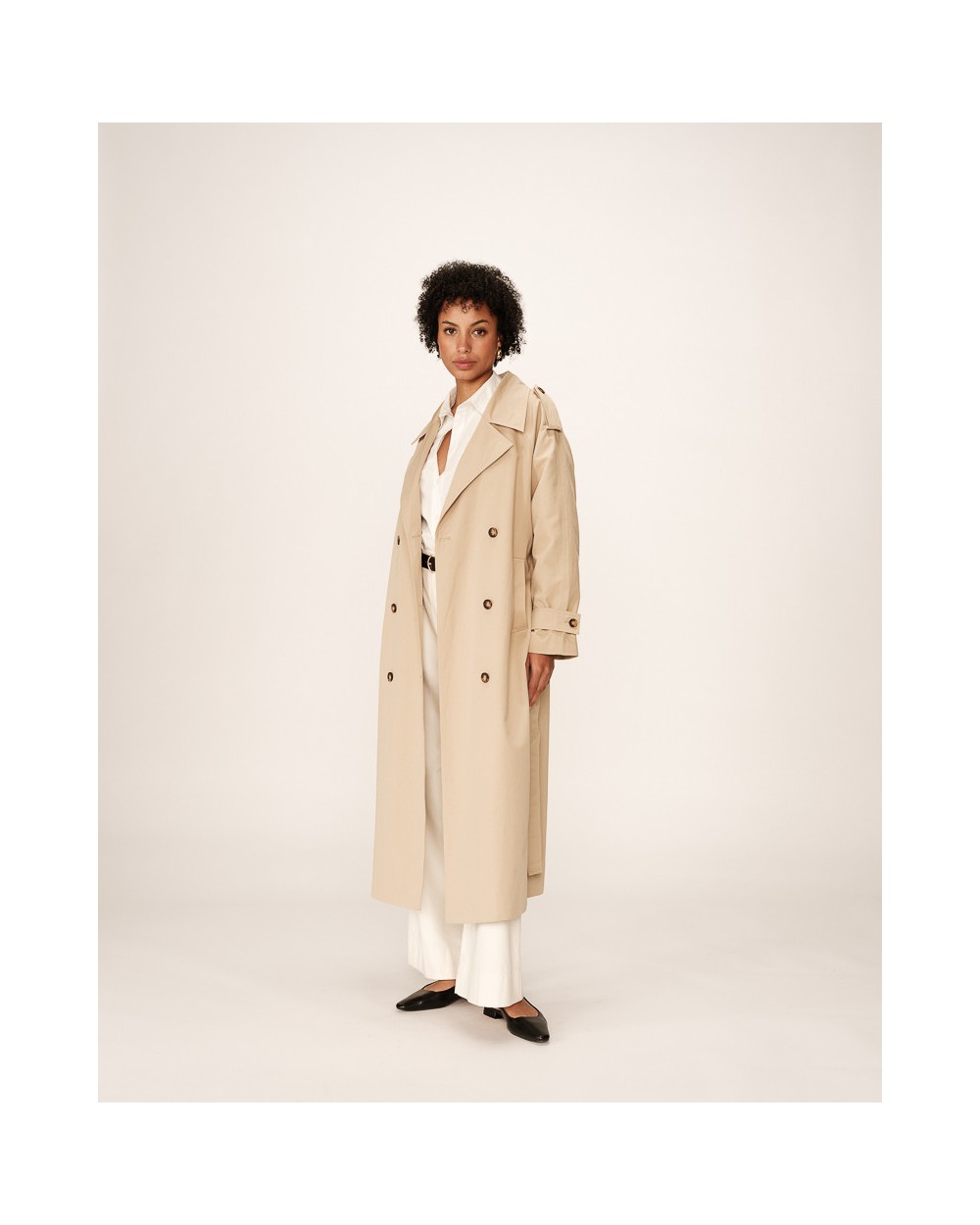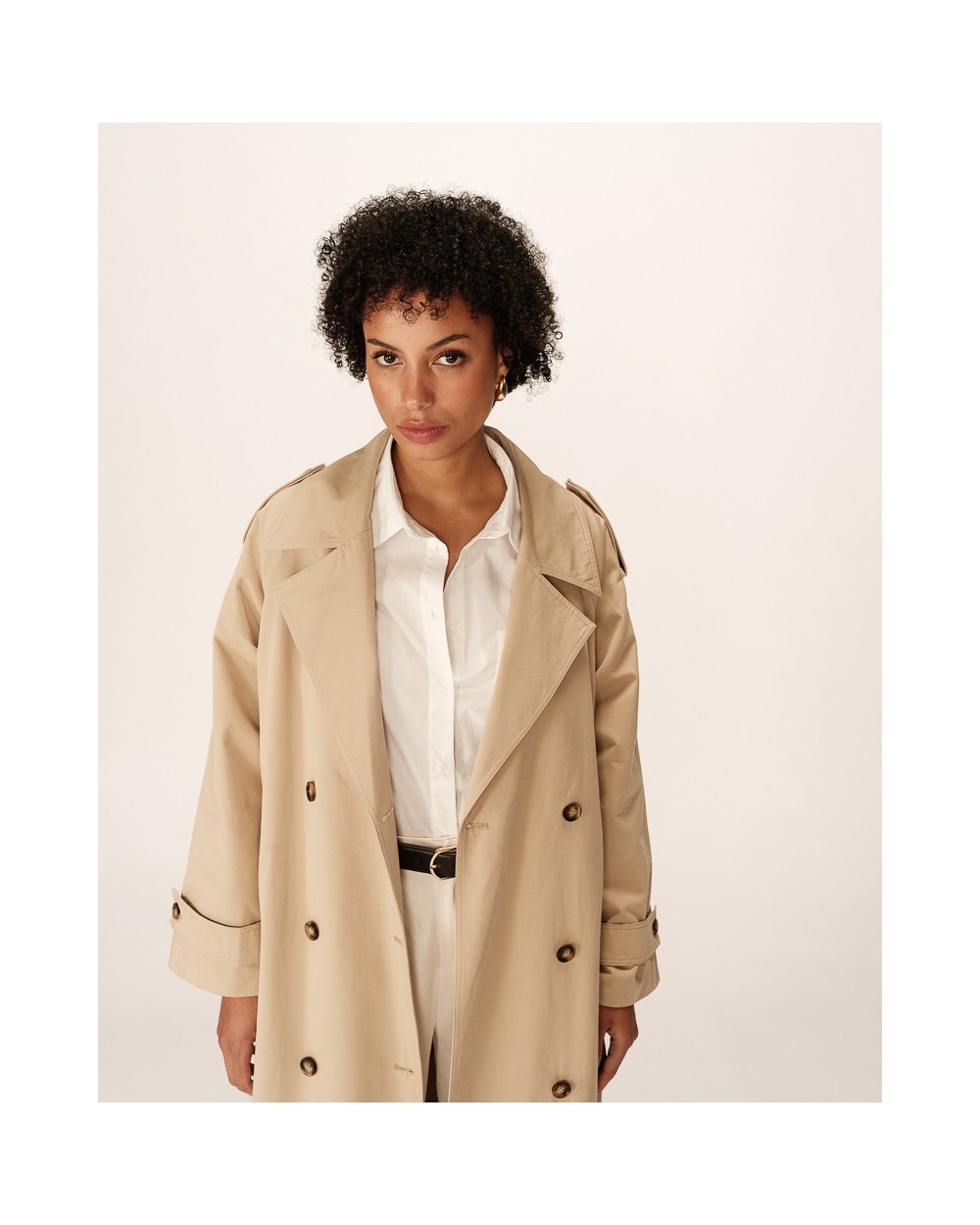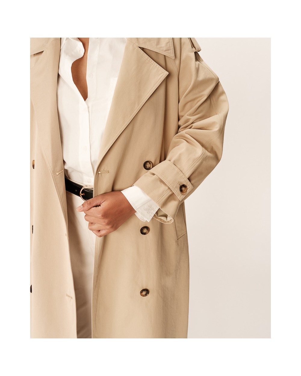 La gabardina de algodón PROUST es un must have de entretiempo. La gabardina larga PROUST, confeccionada en 100% algodón y forrada, se une a nuestra gama en fibras naturales 'Un Brin de Vert'. El corte holgado y amplio ofrece una silueta moderna y contemporánea. El modelo tiene manga larga, cuello de solapa.