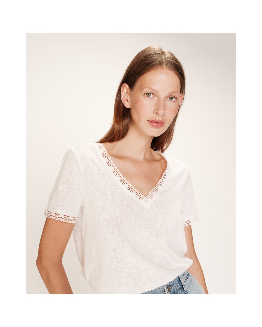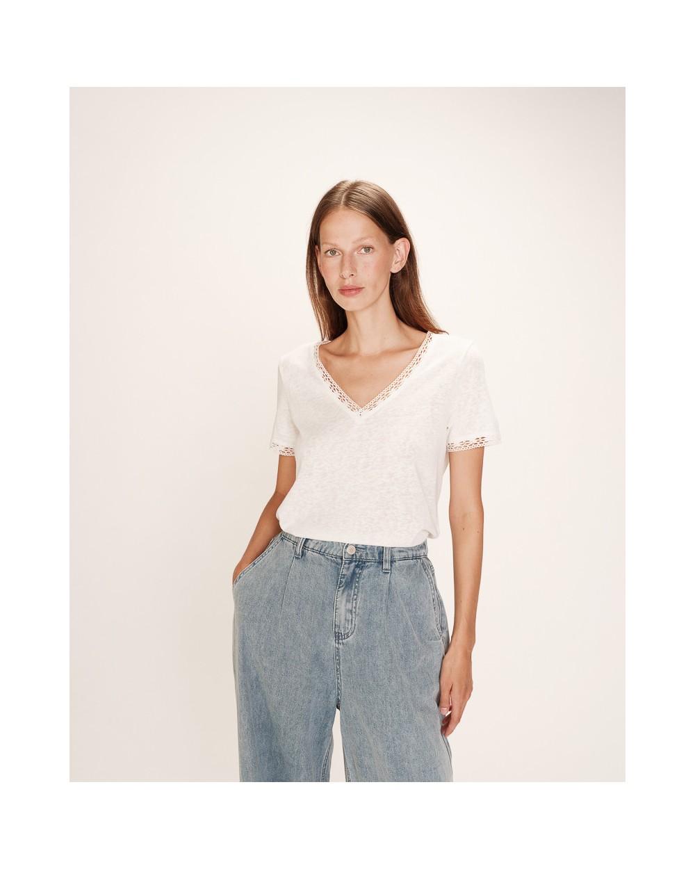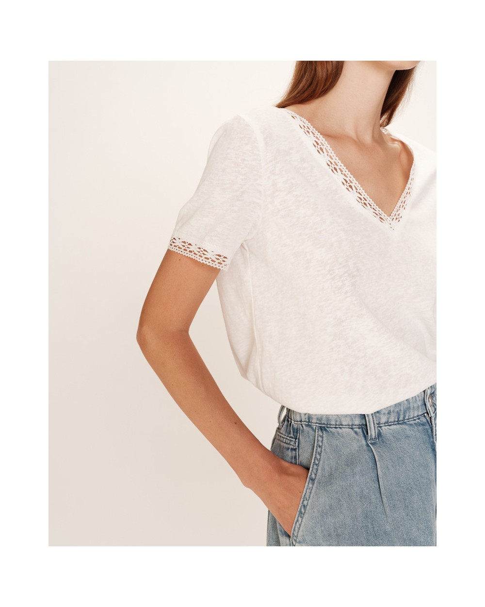 Camiseta con cuello pico y manga corta de algodòn, es una pieza básica. Camiseta de manga corta con un ribete de encaje en el cuello y las mangas. Confeccionada en fibras naturales.