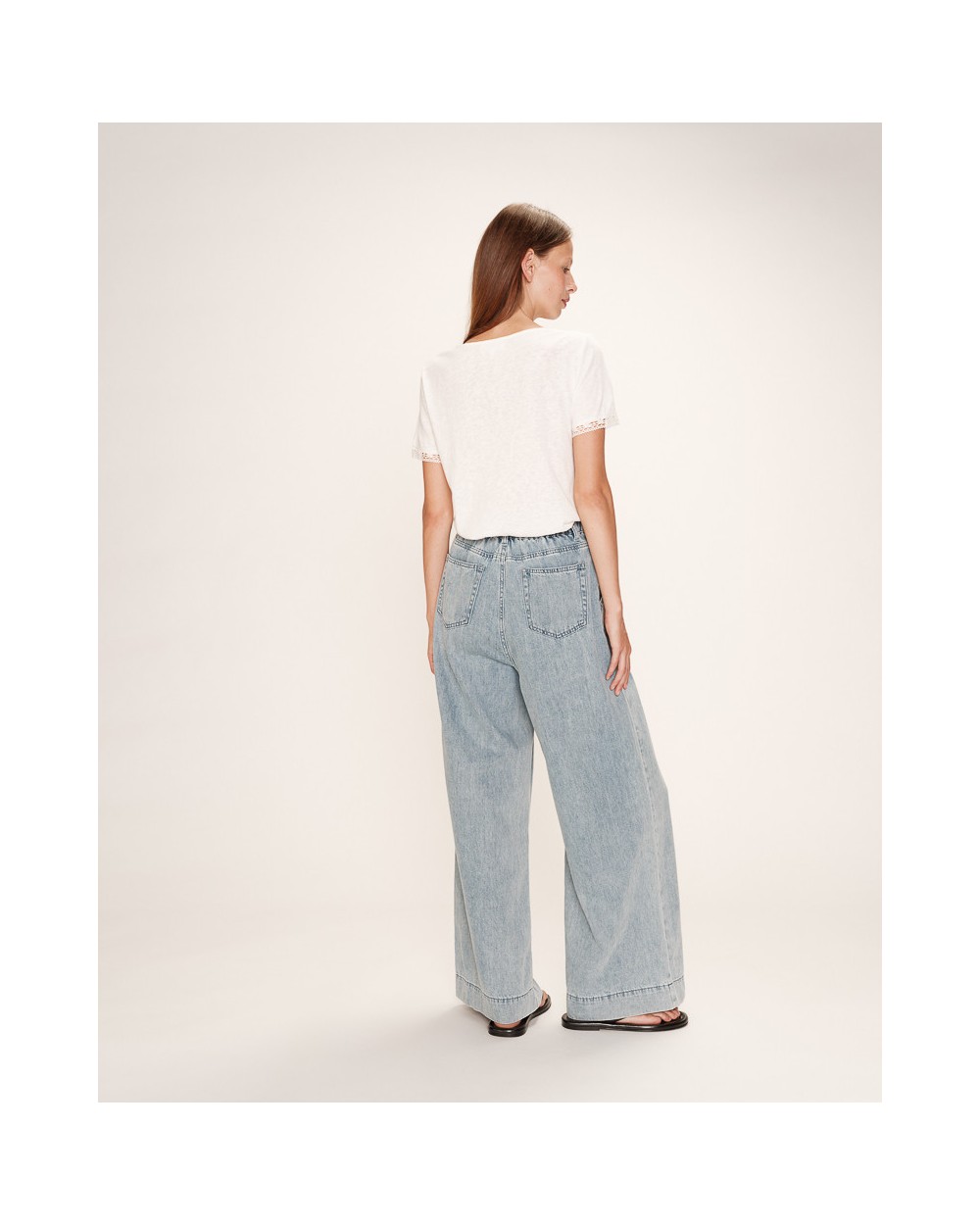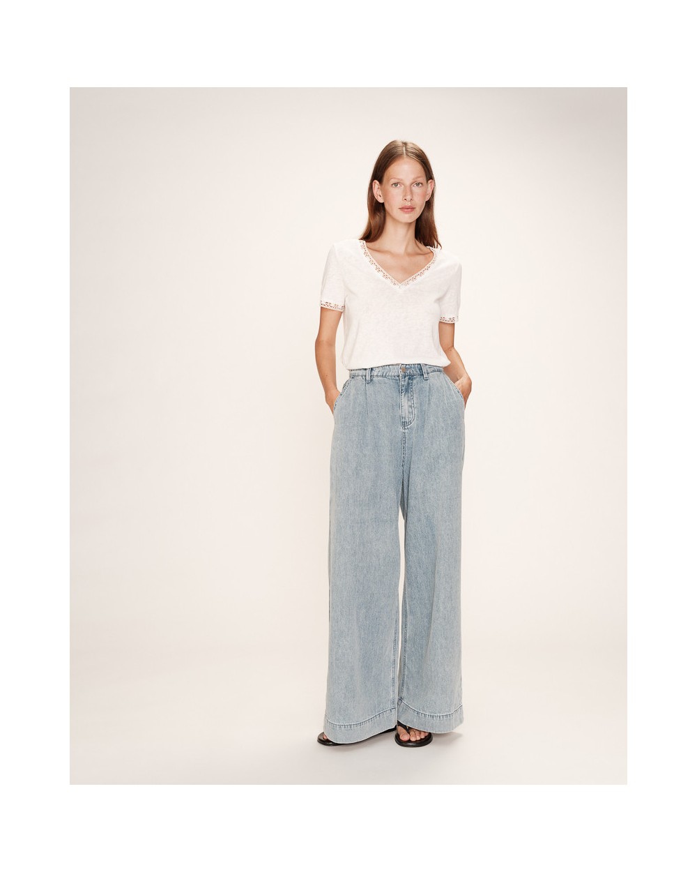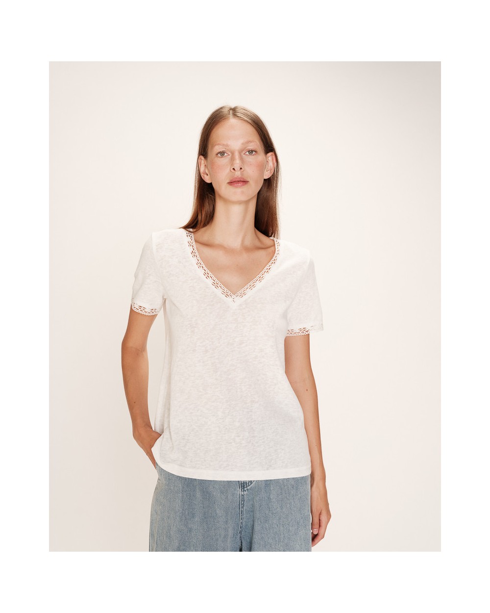Camiseta con cuello pico y manga corta de algodòn, es una pieza básica. Camiseta de manga corta con un ribete de encaje en el cuello y las mangas. Confeccionada en fibras naturales.