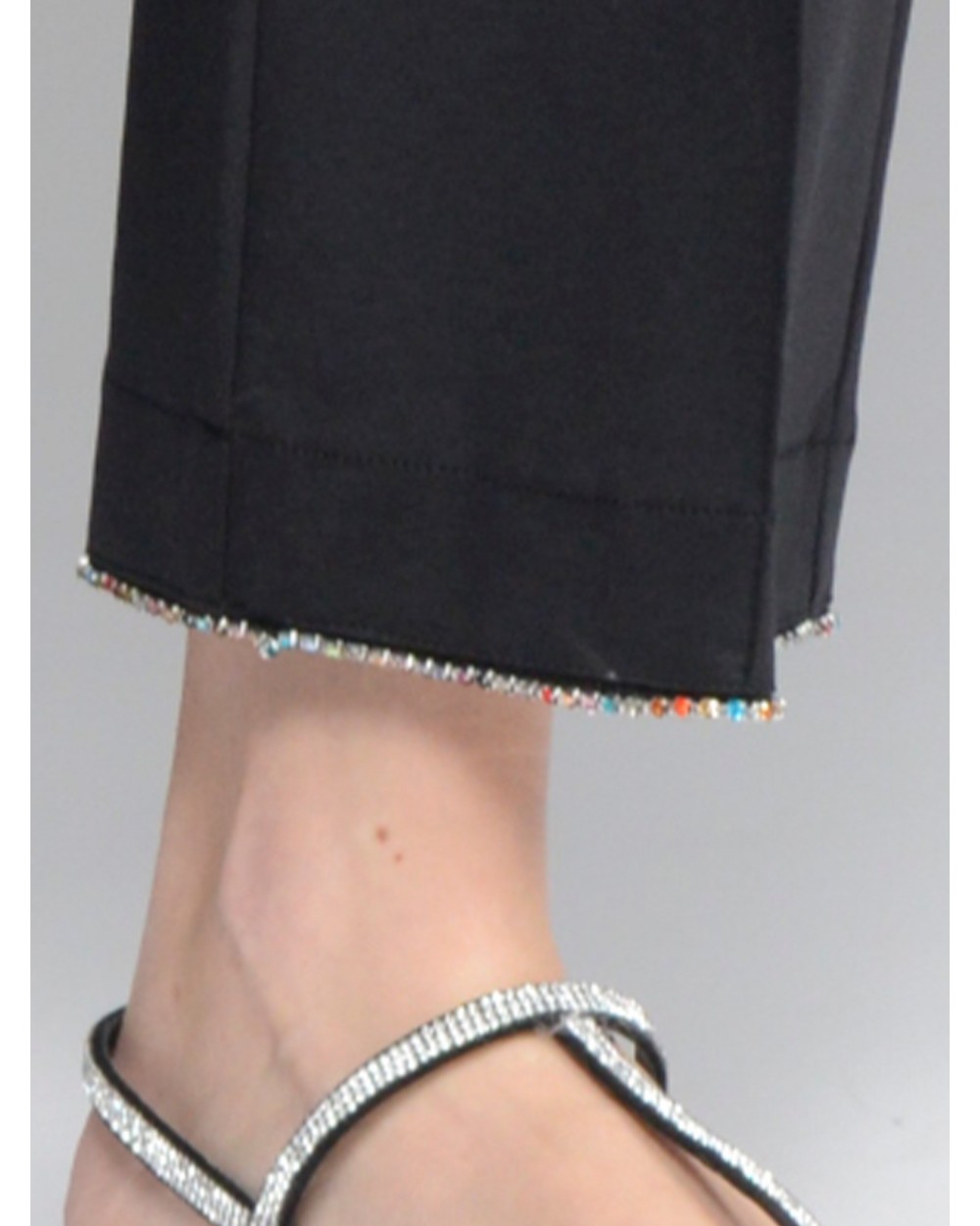 Pantalón de punto roma negro con detalle de nervio central y pedrería de colores en el bajo. Tejido y cinturilla elástico. Bolsillos laterales. Chaqueta a conjunto disponible. La modelo mide 1,74 y lleva la talla 38.