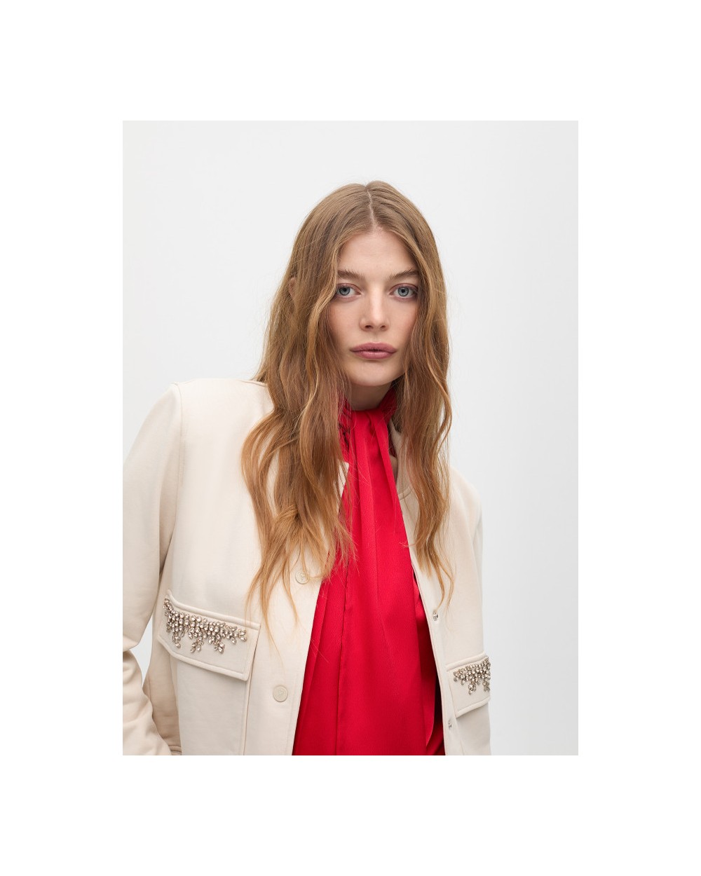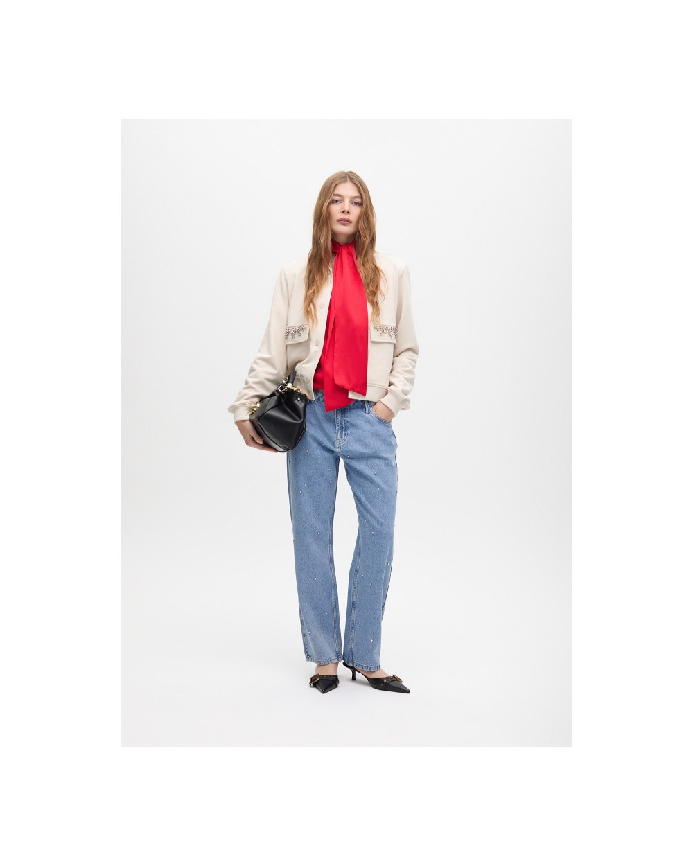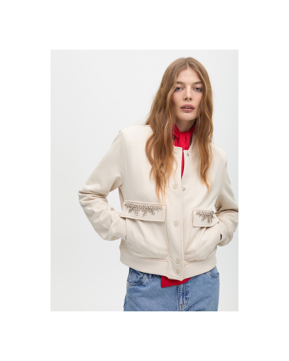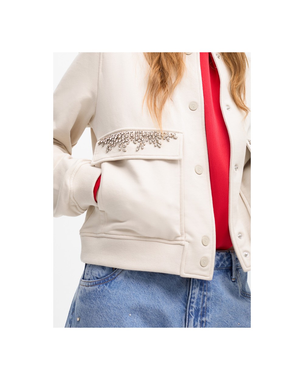 Bomber con bolsillos adornados con cristales, cierra con botones frontales, tejido suave para ajuste còmodo.