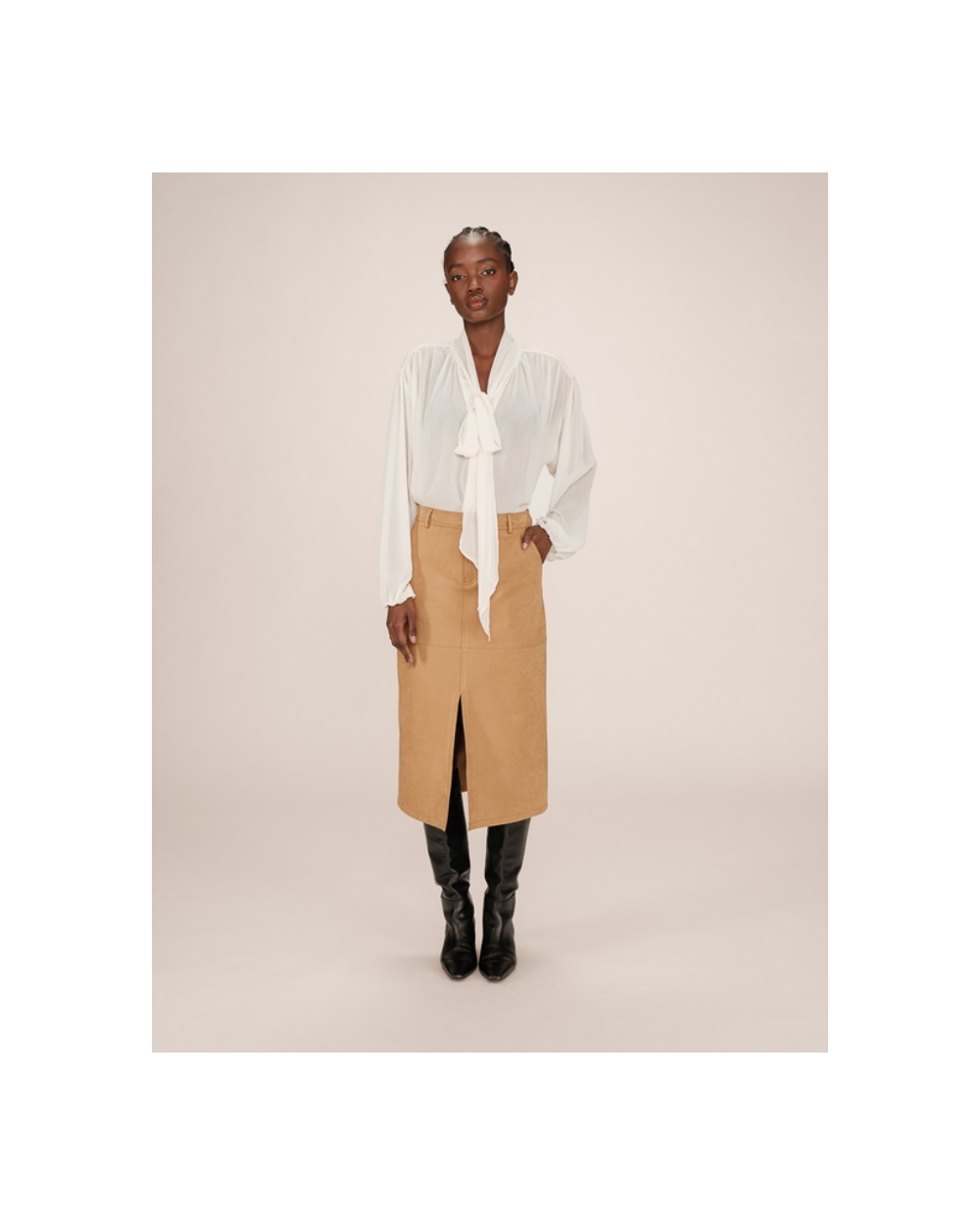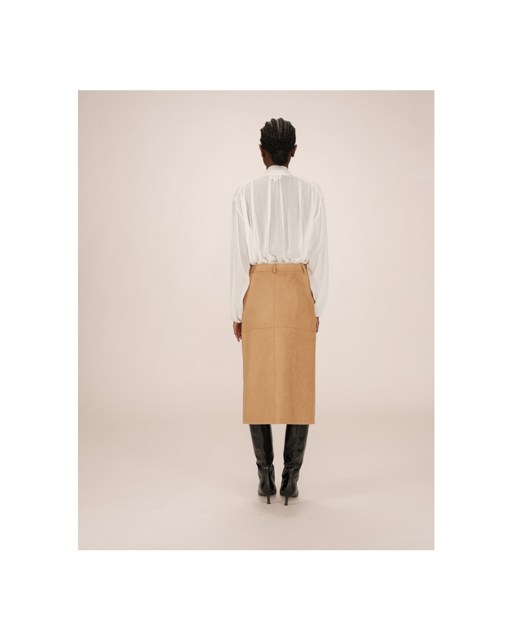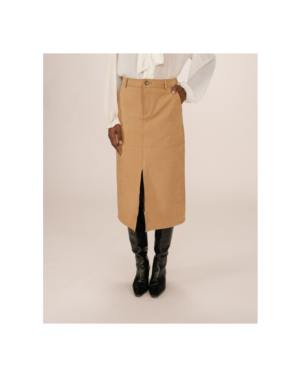 Falda de corte midi recta, con tejido suave aterciopelado. Costuras con pespuntes, cierre con cremallera, presillas para cinturòn, cintura alta, y forro interior.