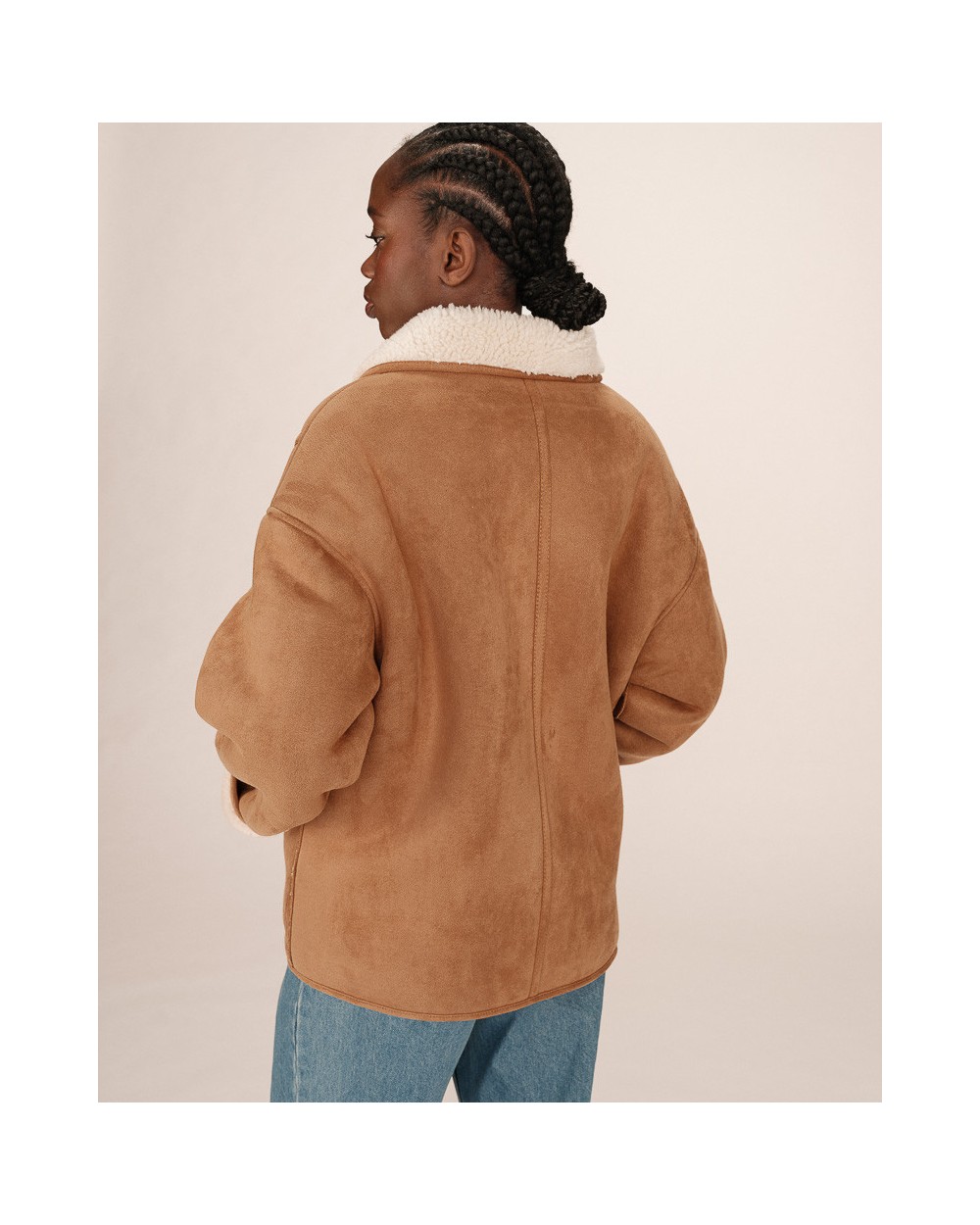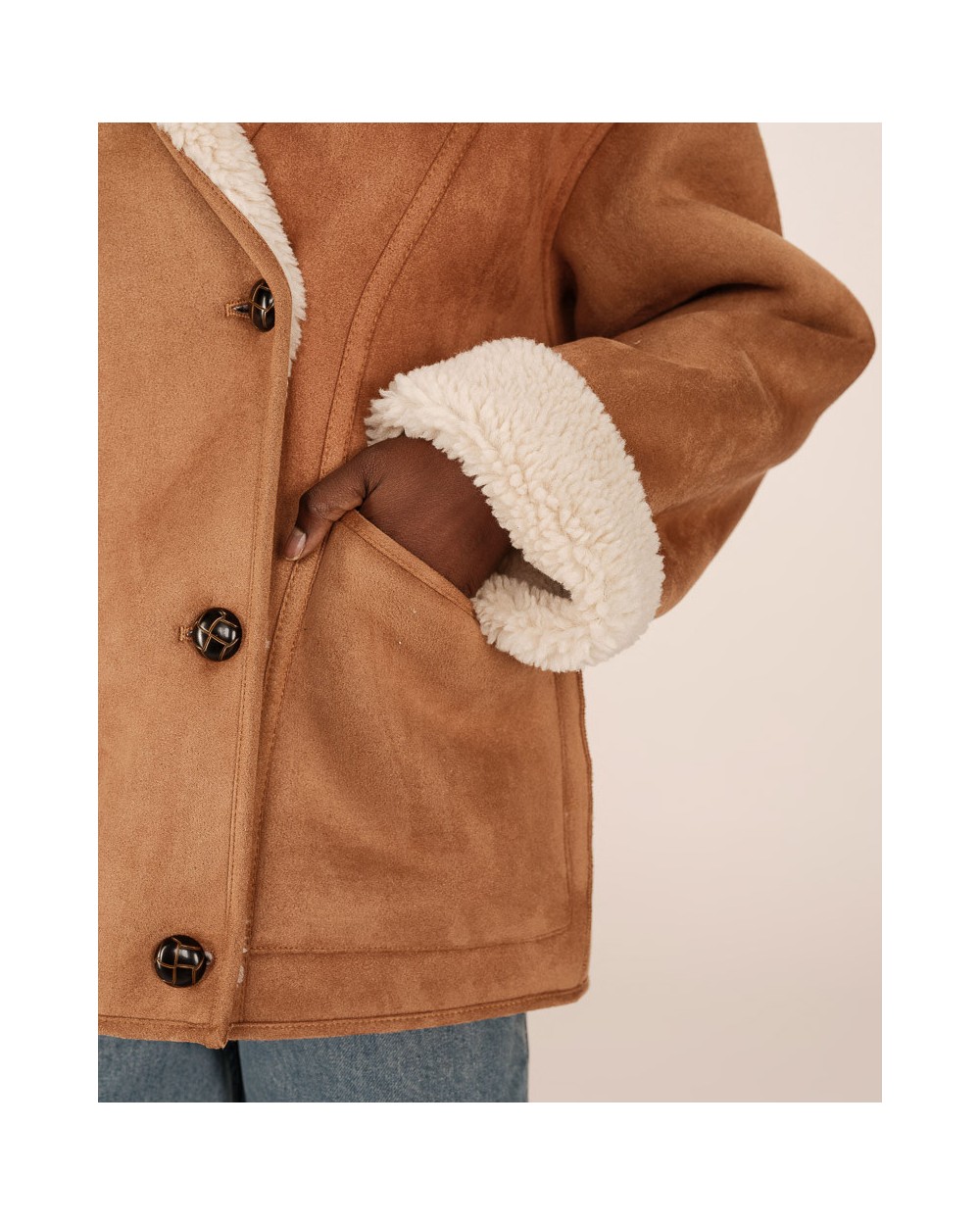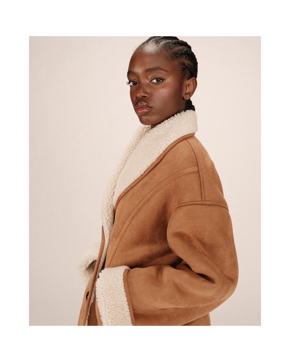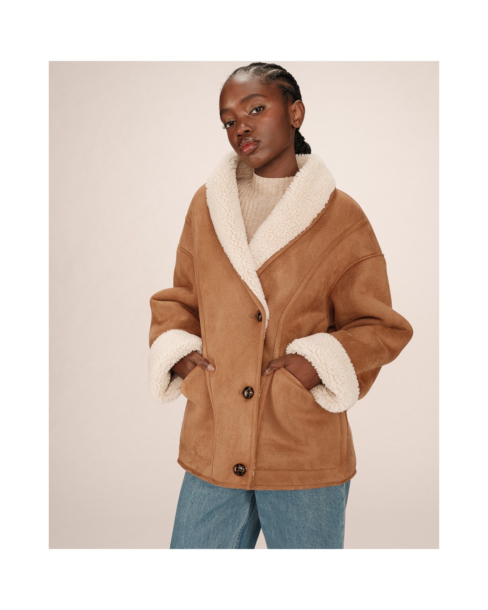 Abrigo oversize SWAN está hecho con piel sintética por dentro y ante sintético por fuera, lo que le da una sensación suave y cálida, cierre de un solo botón, bolsillos con parche en la parte frontal y botones a contraste.