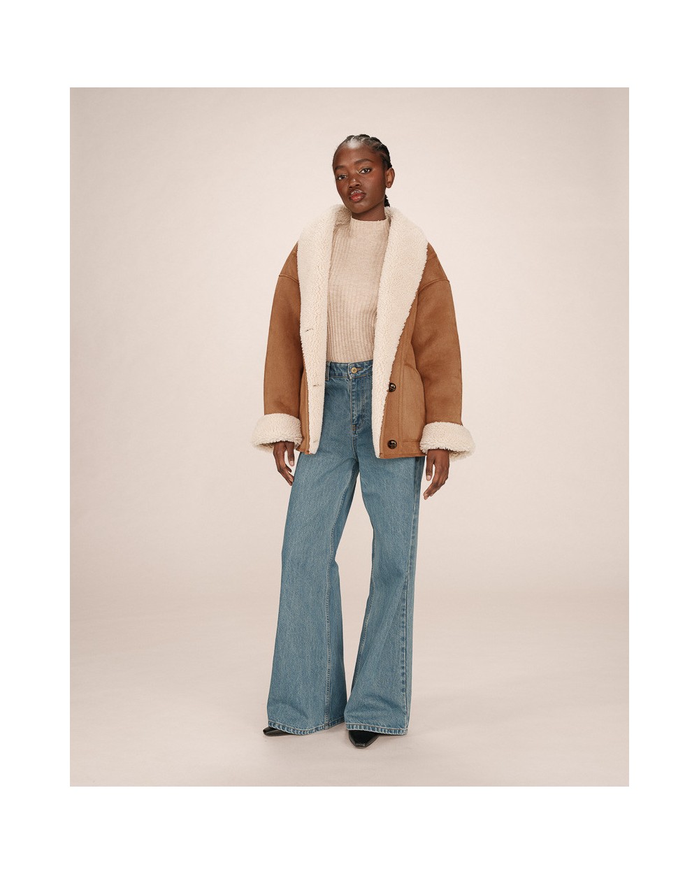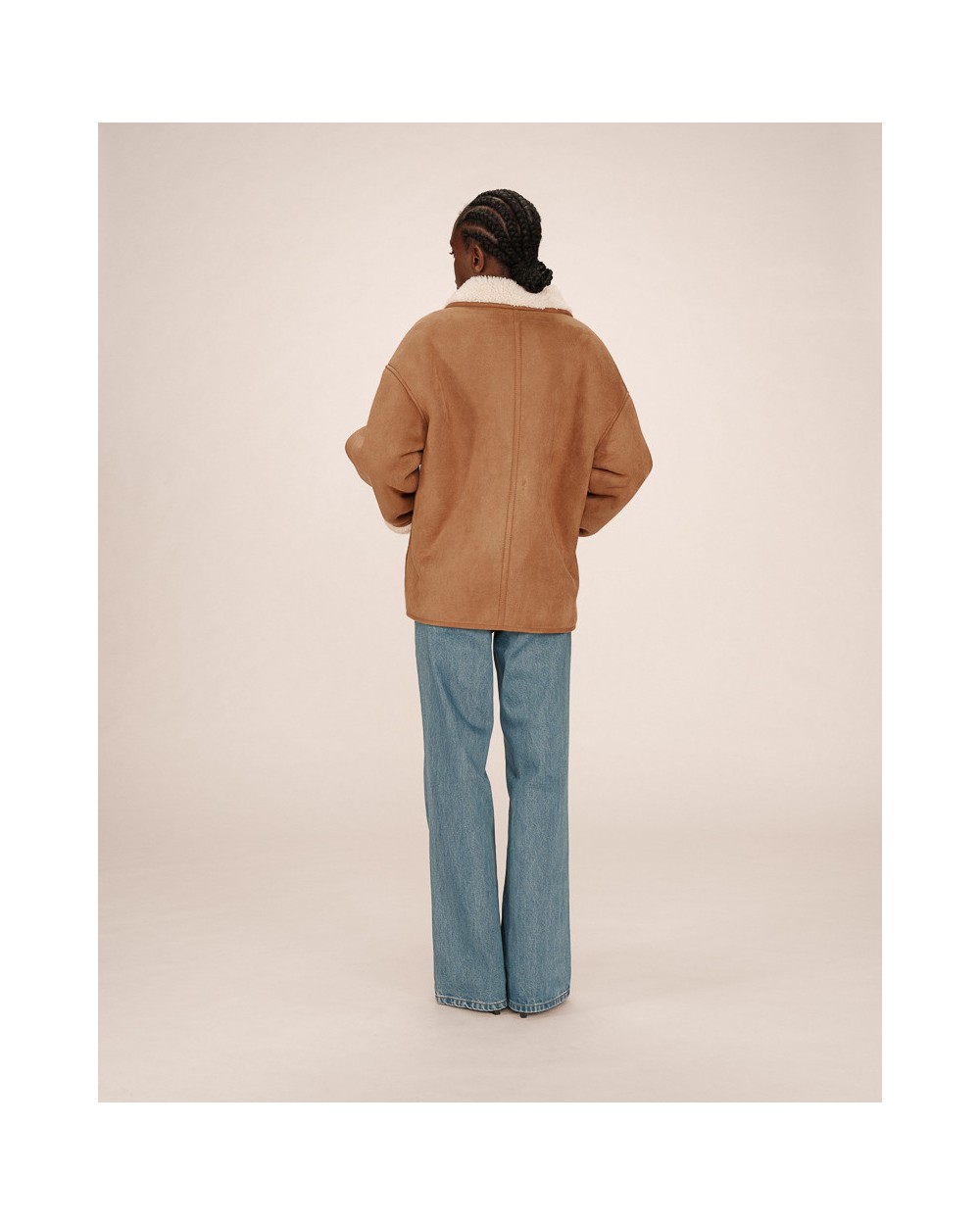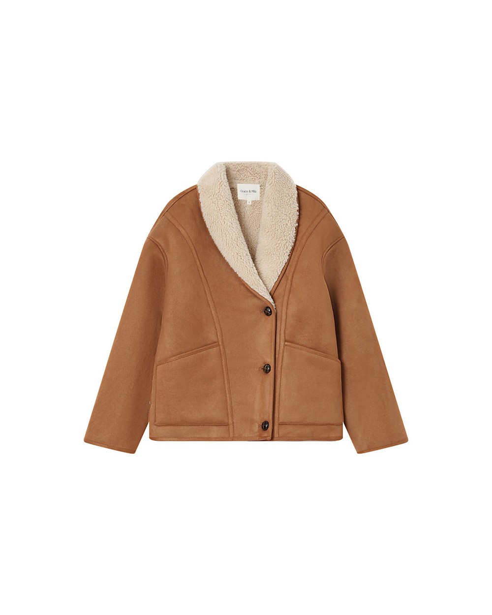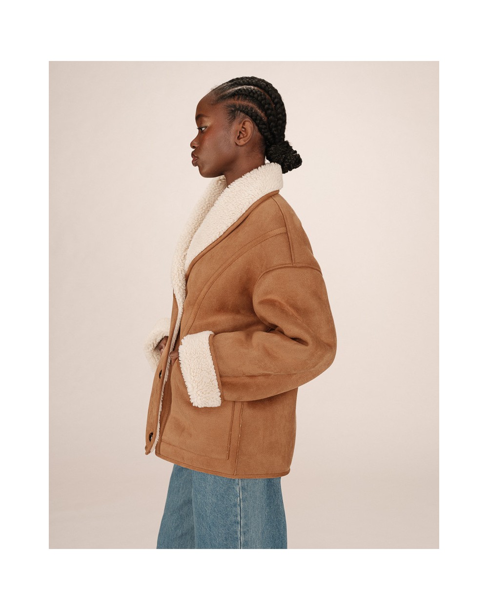 Abrigo oversize SWAN está hecho con piel sintética por dentro y ante sintético por fuera, lo que le da una sensación suave y cálida, cierre de un solo botón, bolsillos con parche en la parte frontal y botones a contraste.